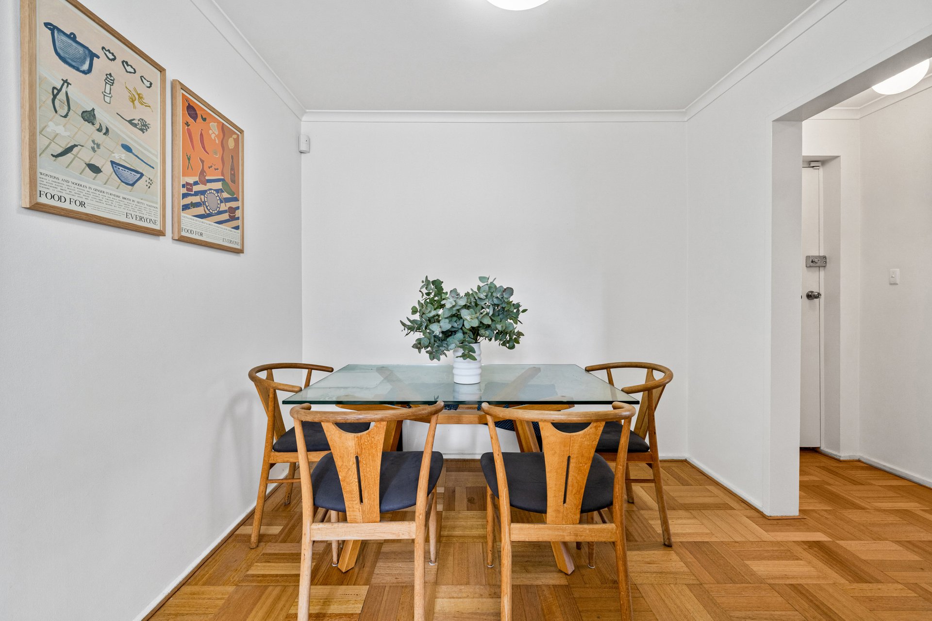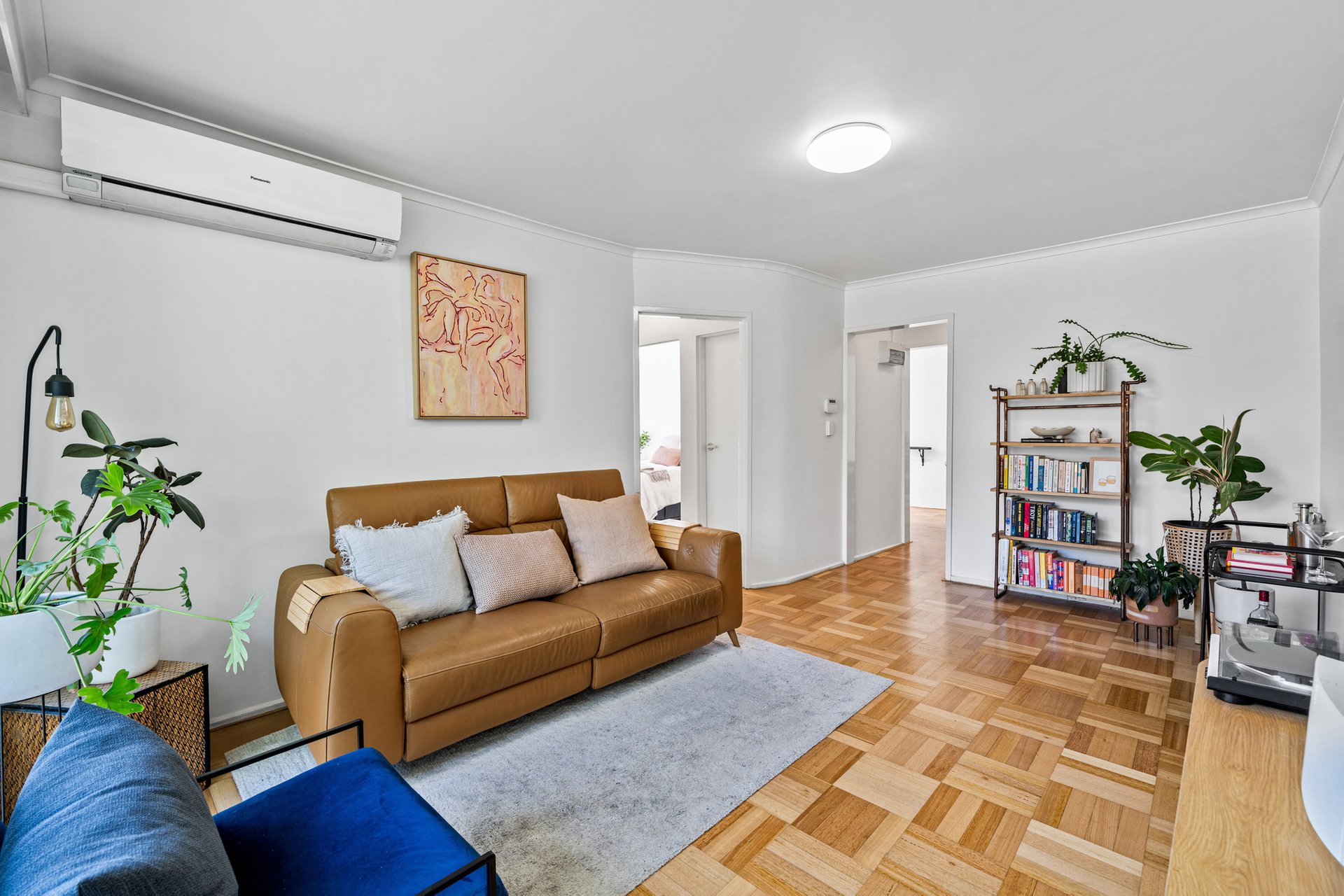 Inside, the home offers separate living and dining zones, a genuine point of difference that creates a sense of space and flexibility. The living room features parquetry timber floors, decorative cornices and a split system heating and cooling unit, while large windows allow natural light to fill the room. The dining area sits separately off the hallway, creating a defined space for meals and entertaining.