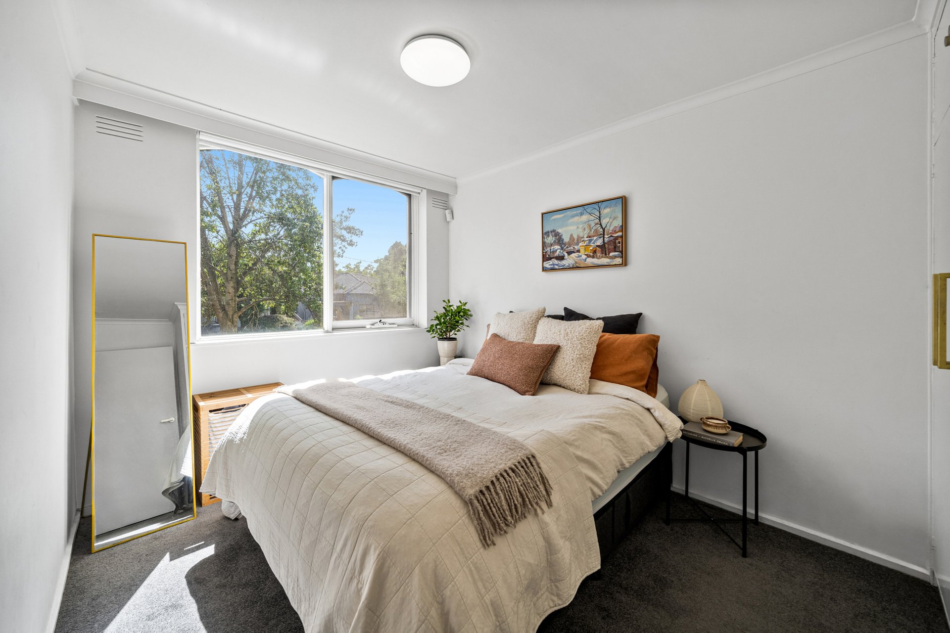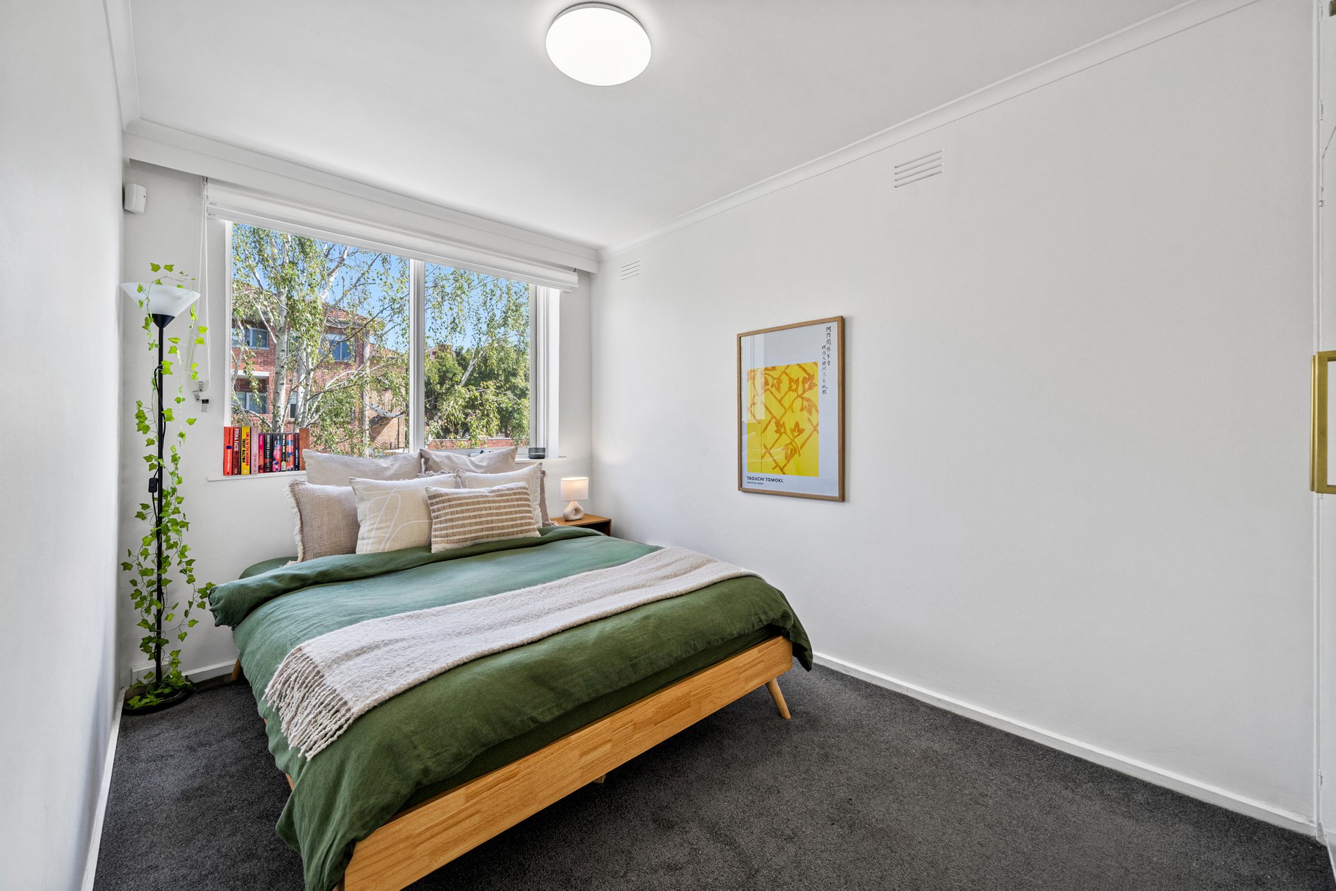 Accommodation includes two comfortable carpeted bedrooms, both with built in wardrobes. The main bedroom enjoys large north facing windows with a leafy treetop outlook, while the second bedroom also benefits from excellent natural light and a peaceful outlook.
