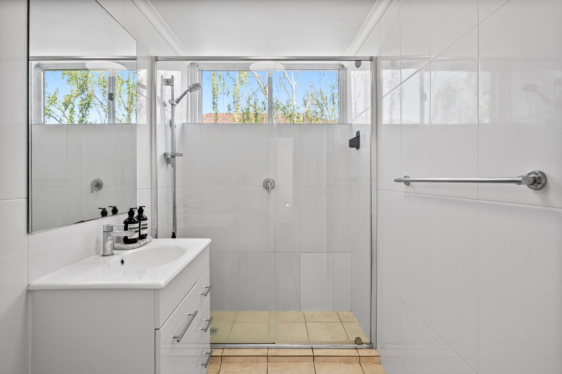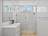 A central bathroom services both bedrooms and features a walk-in shower with semi frameless glass screen, floor to ceiling tiles, vanity with mirror and chrome fittings.