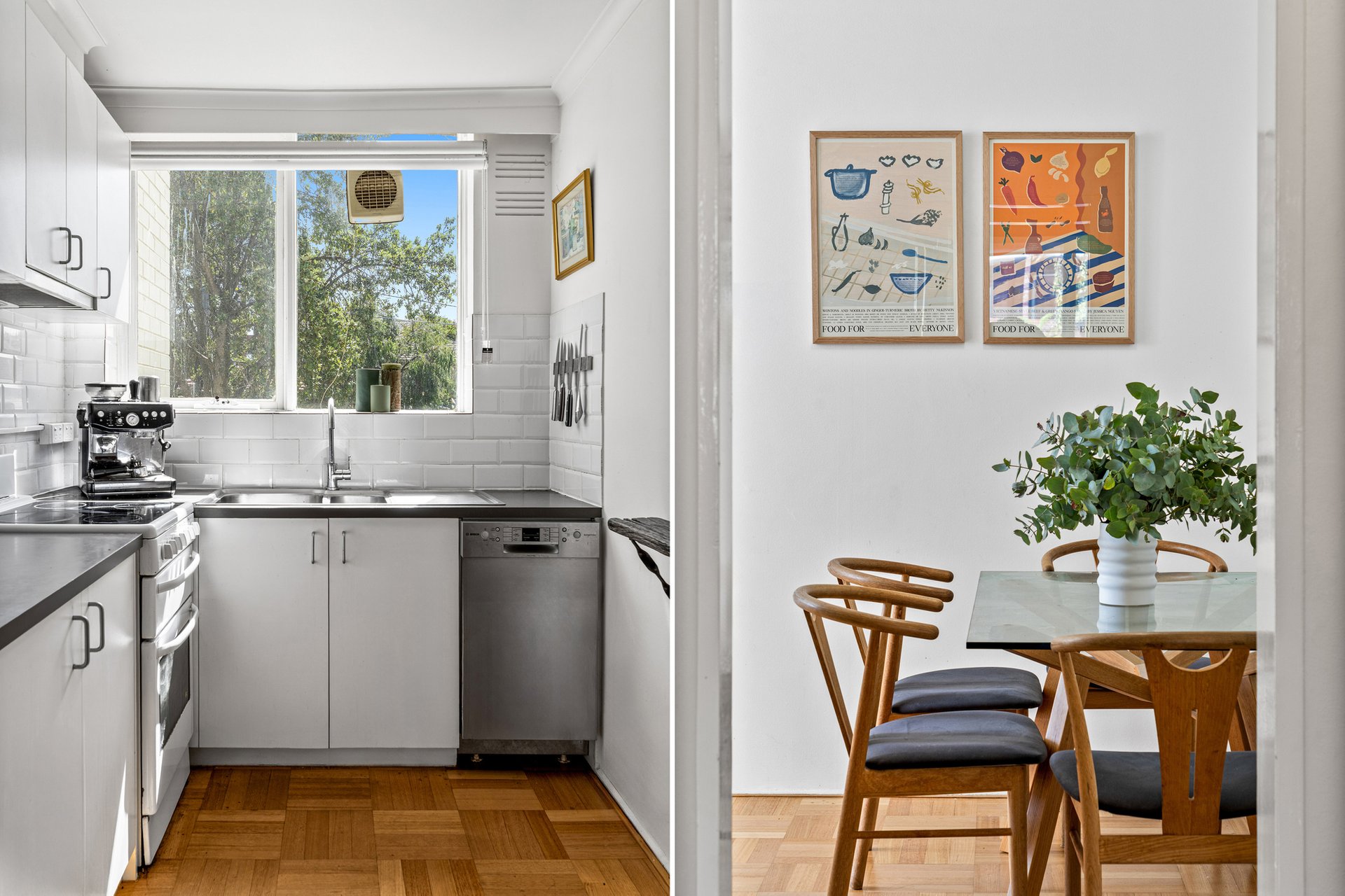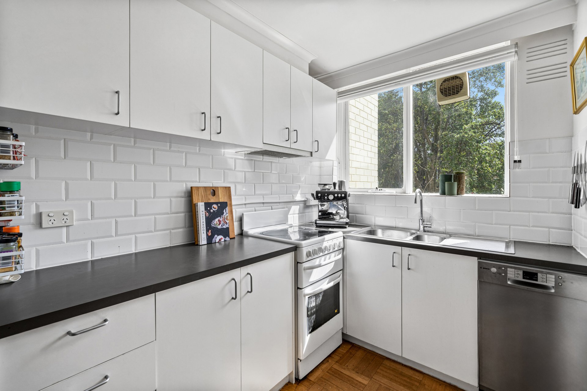 The galley style kitchen adjoins the dining zone and has been cosmetically updated with white cabinetry, stone look benchtops and a white subway tile splashback. It includes a freestanding Chef electric oven with ceramic cooktop, Bosch dishwasher, double stainless steel sink and good natural light from a window overlooking the trees.
