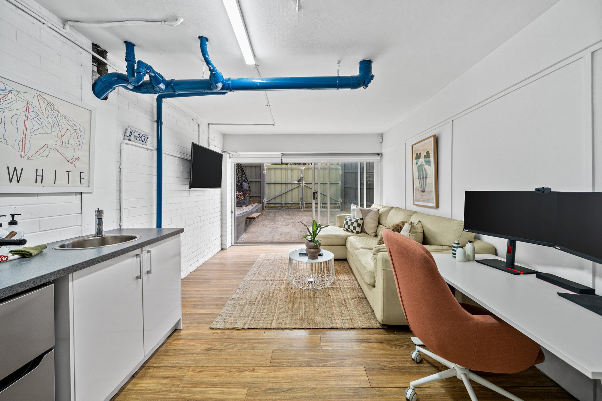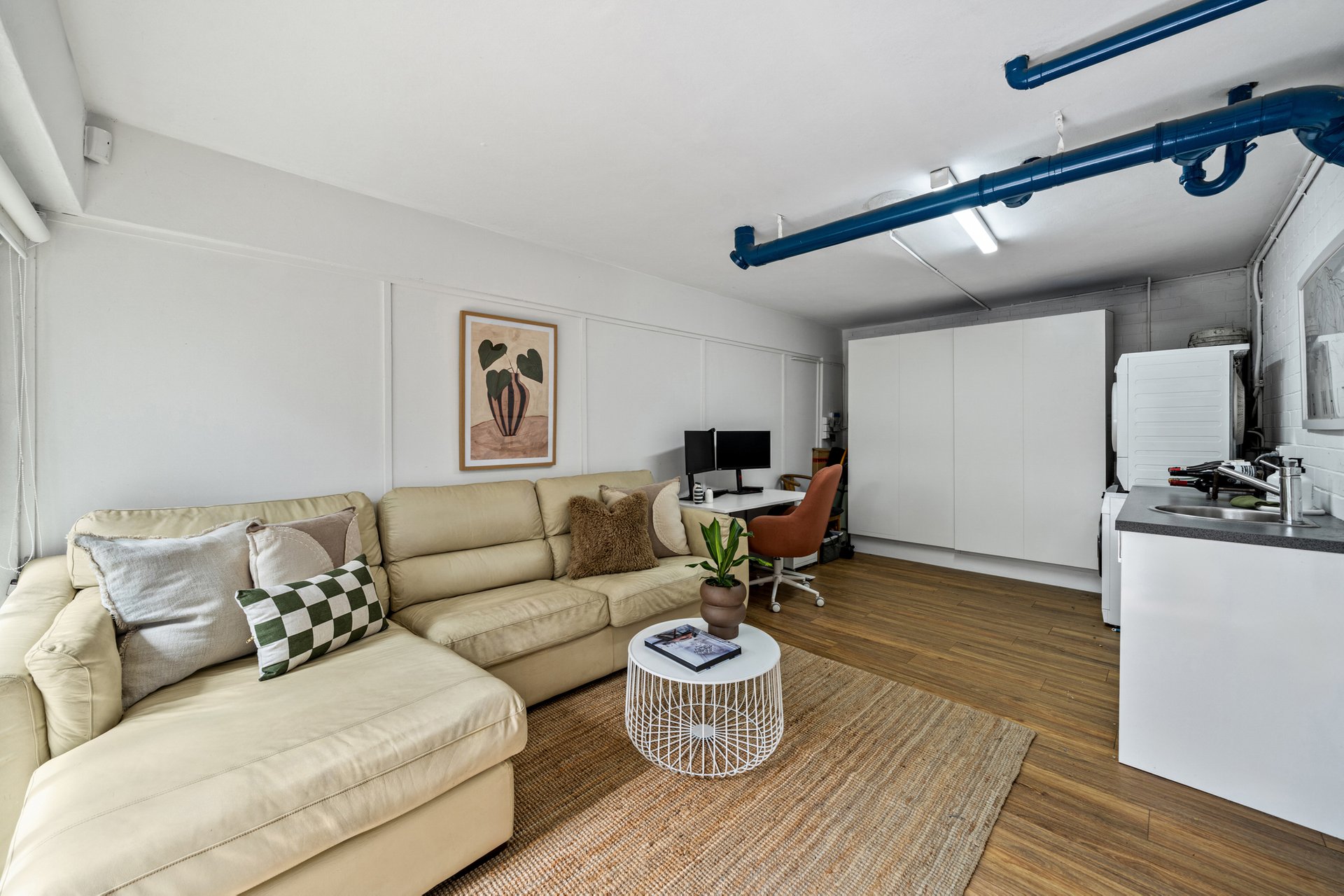 One of the home’s most distinctive features is the converted garage, now transformed into a versatile studio or multipurpose space. Styled with painted brick walls, exposed pipework and timber laminate flooring, the space offers flexibility as a work from home office, creative studio, gym or guest accommodation.