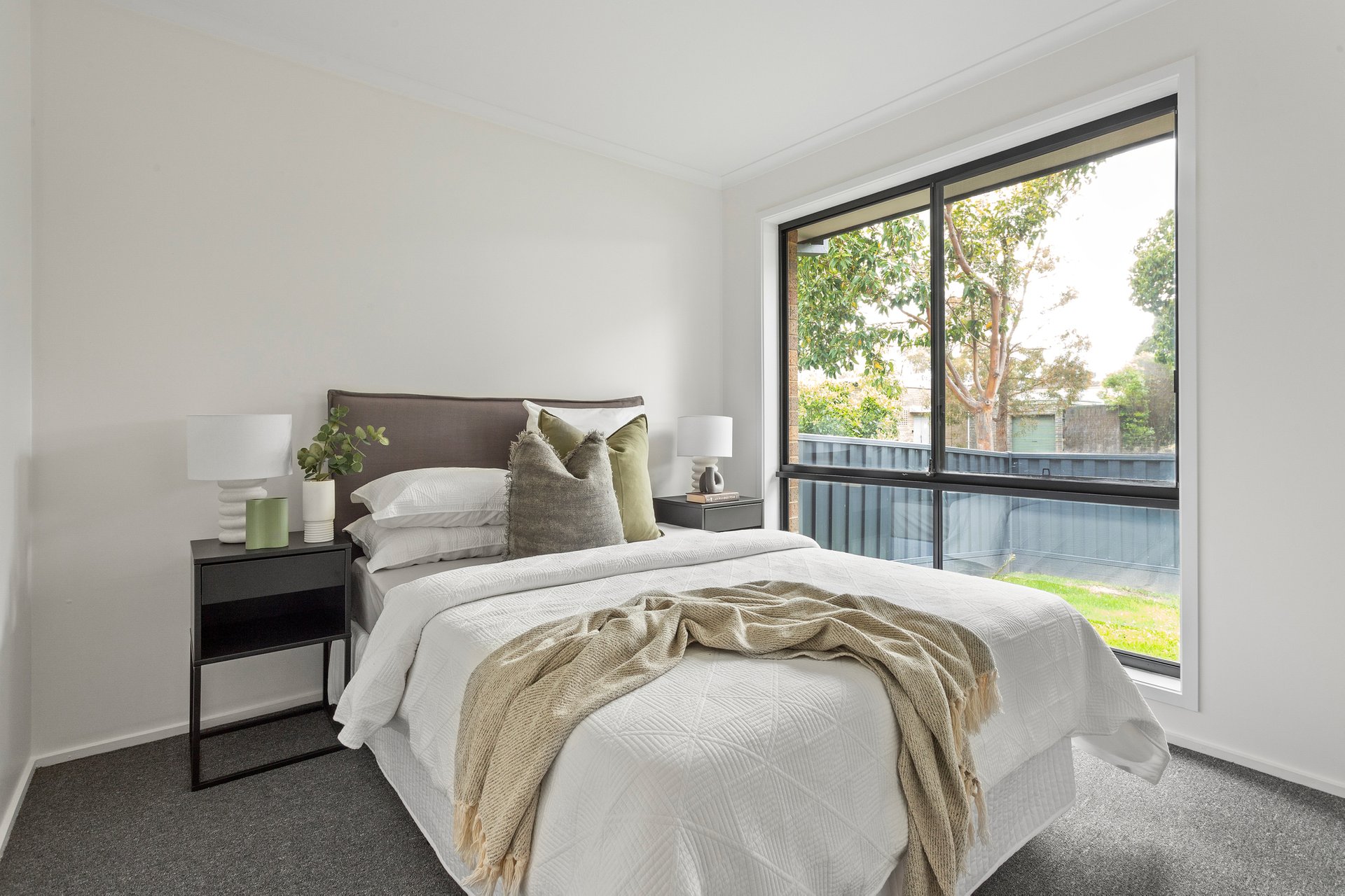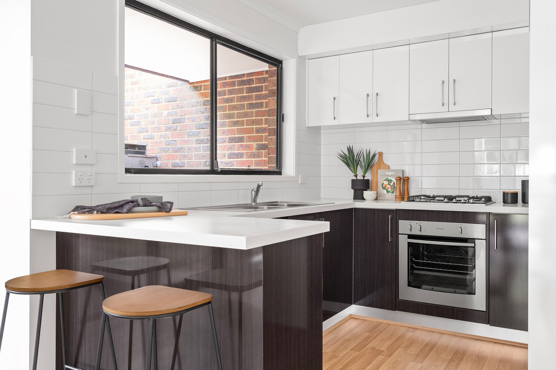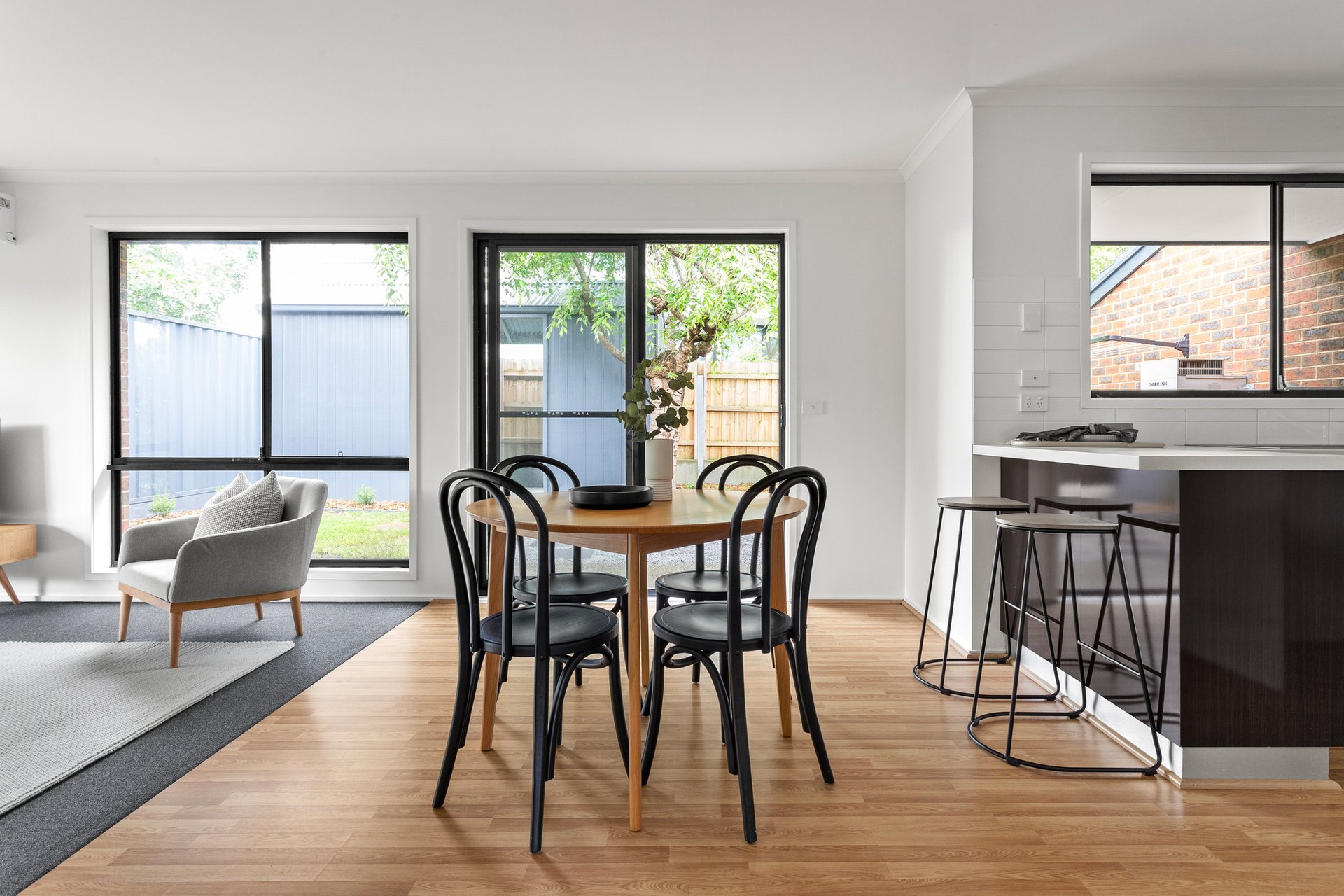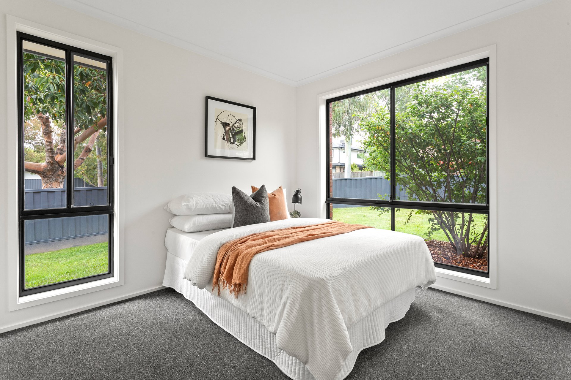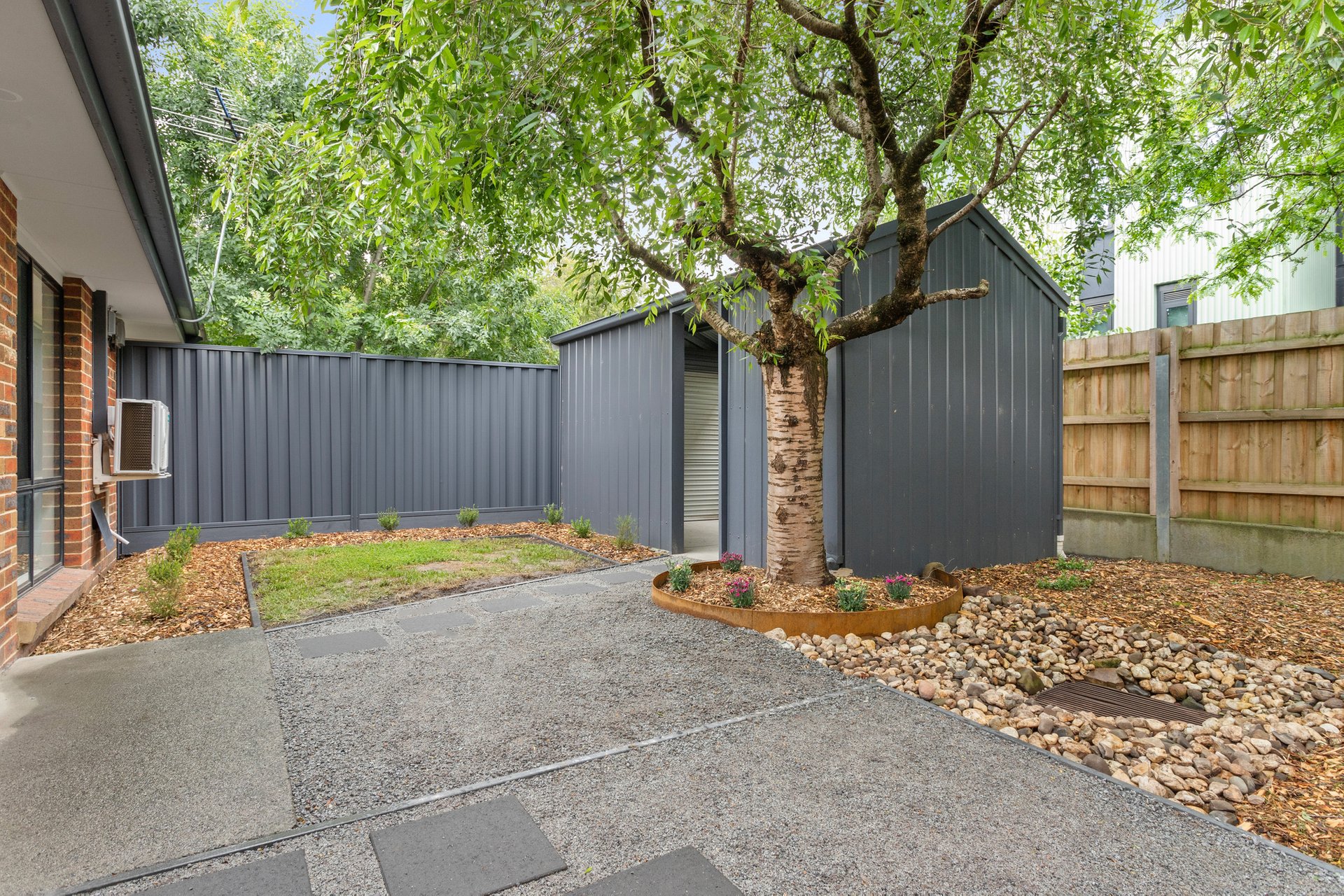 Sitting pretty on a landscaped corner block, the home immediately stands out for all the right reasons, securely wrapped by Colorbond fencing and featuring its very own driveway. Beyond the gated front garden, a single-level layout reveals itself, freshened up with new paint, adorned with modern flooring and awash with natural light. A spacious open plan hub for unwinding and dining welcomes you within, overlooked by a contemporary kitchen with two-toned cabinetry, stainless steel appliances, a breakfast bar and tiled splashbacks. From here, a garden-framed courtyard can be reached, beautifully canopied by a weeping silver birch tree.