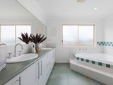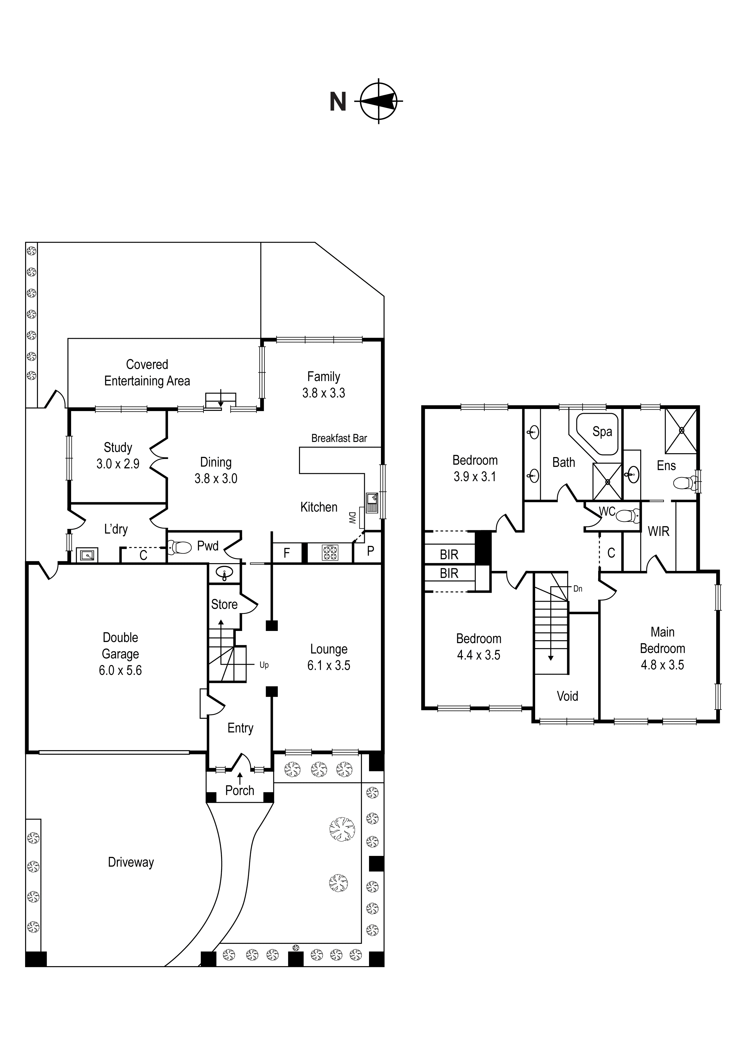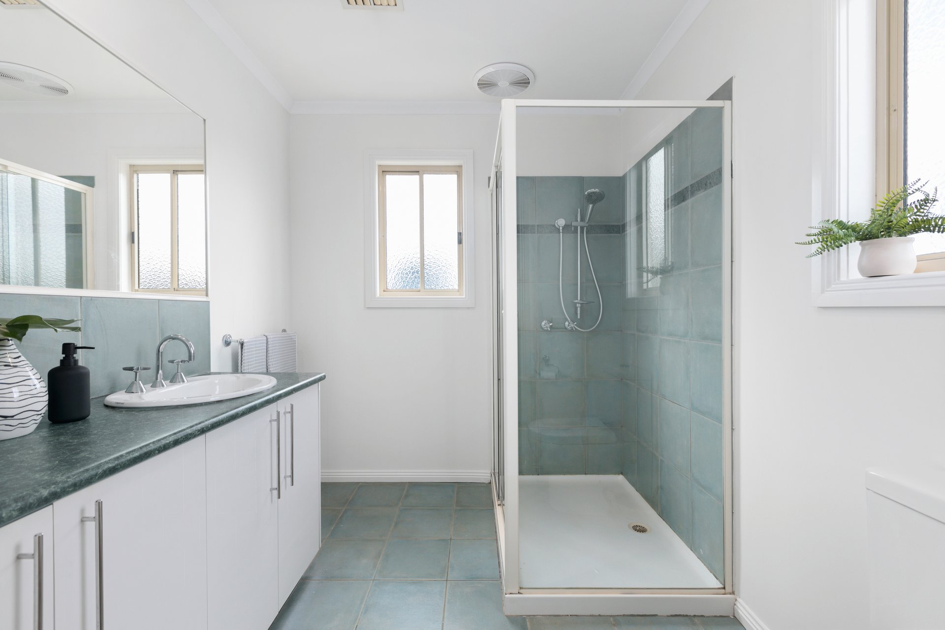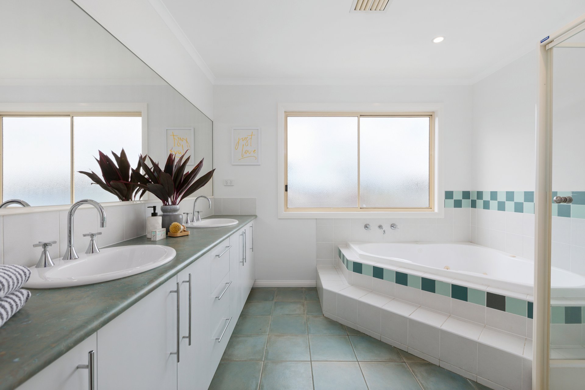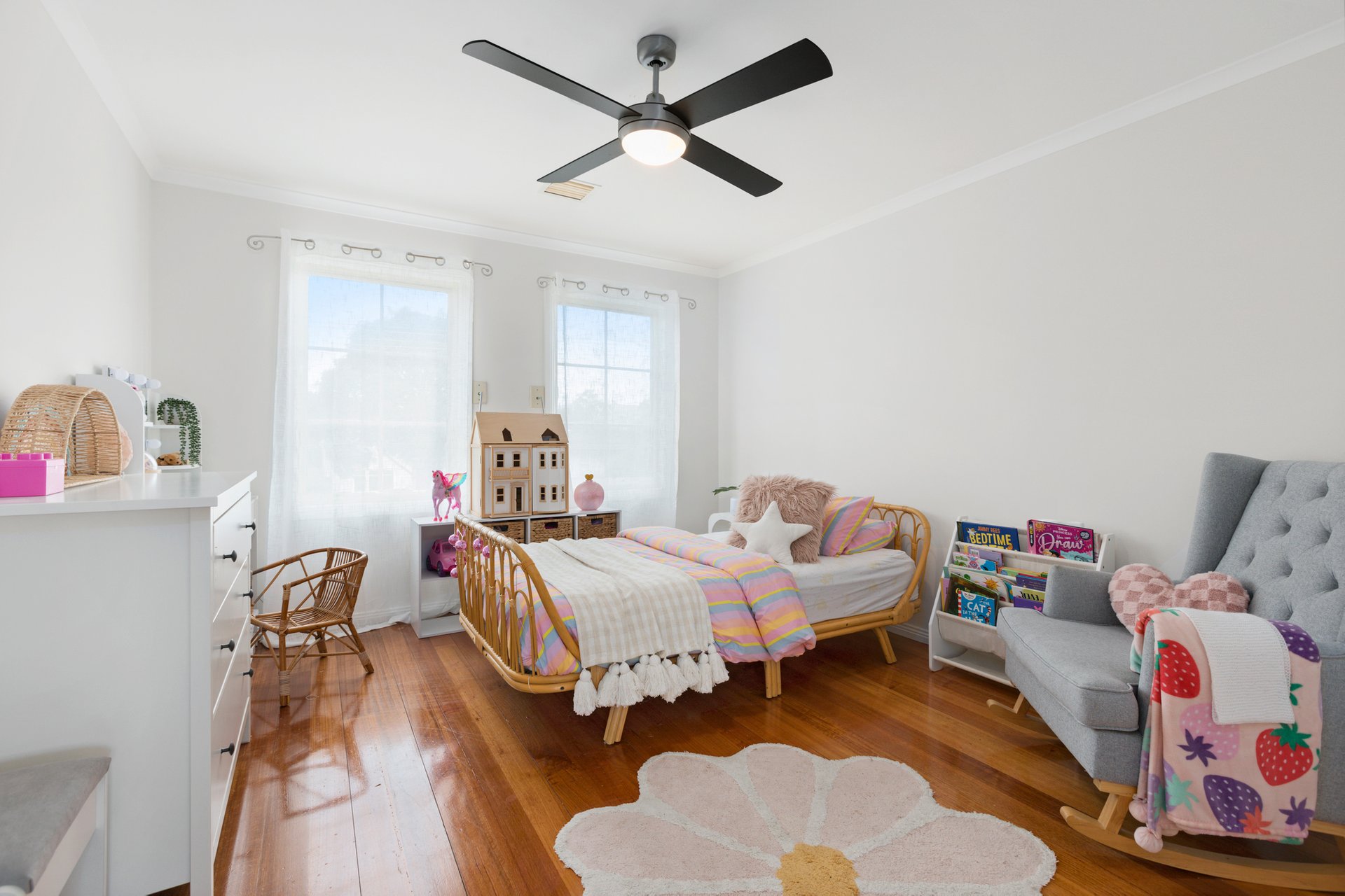 Upstairs are the three primary bedrooms – all generous doubles with fans and robes, the large master offering a walk-through robe to a bright ensuite. A huge spa bathroom services the remaining bedrooms and features a practical double vanity and separate WC, while a ground floor powder room and laundry with yard access plus ducted heating/evaporative cooling and a double auto garage round off the package.