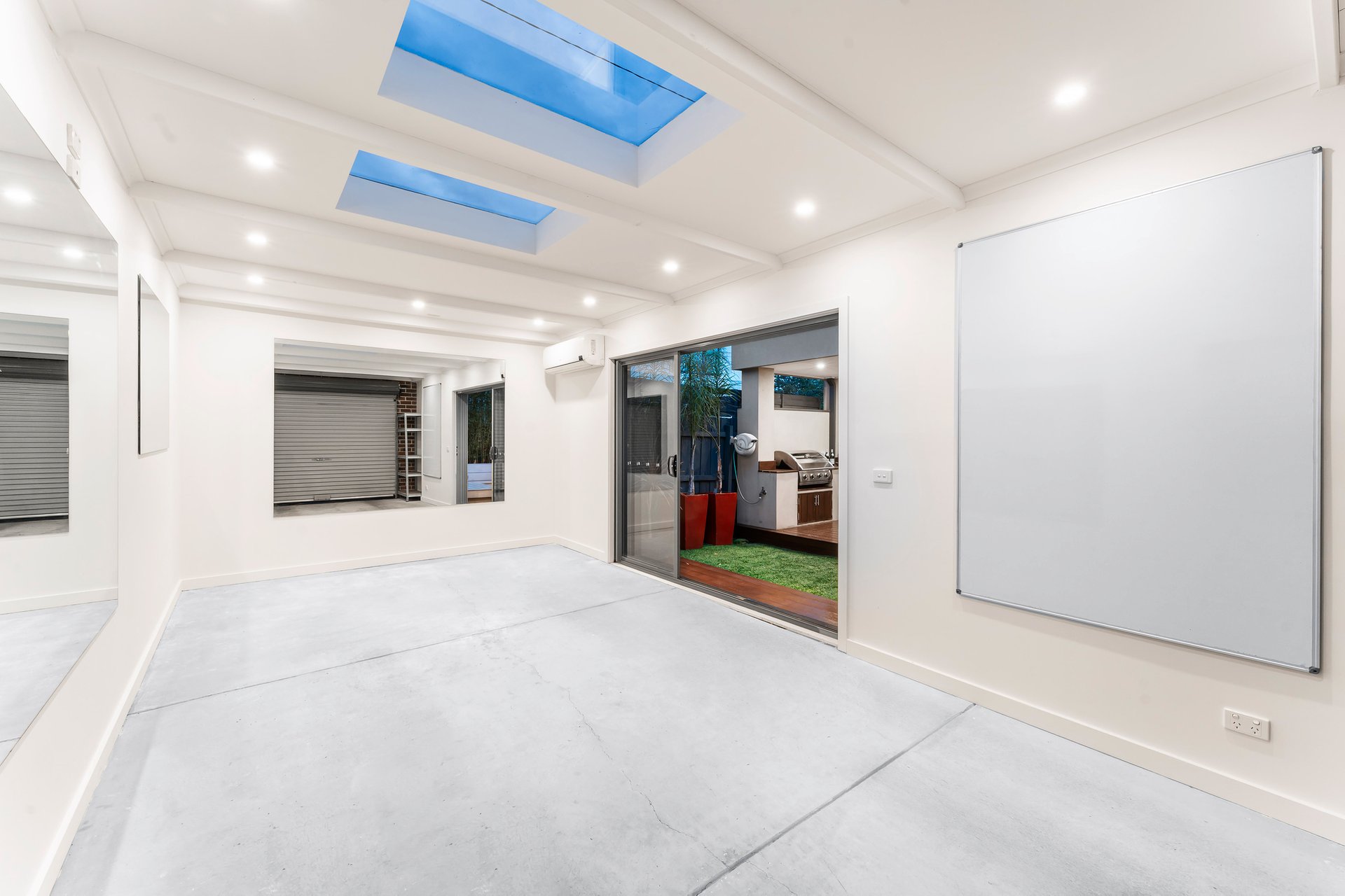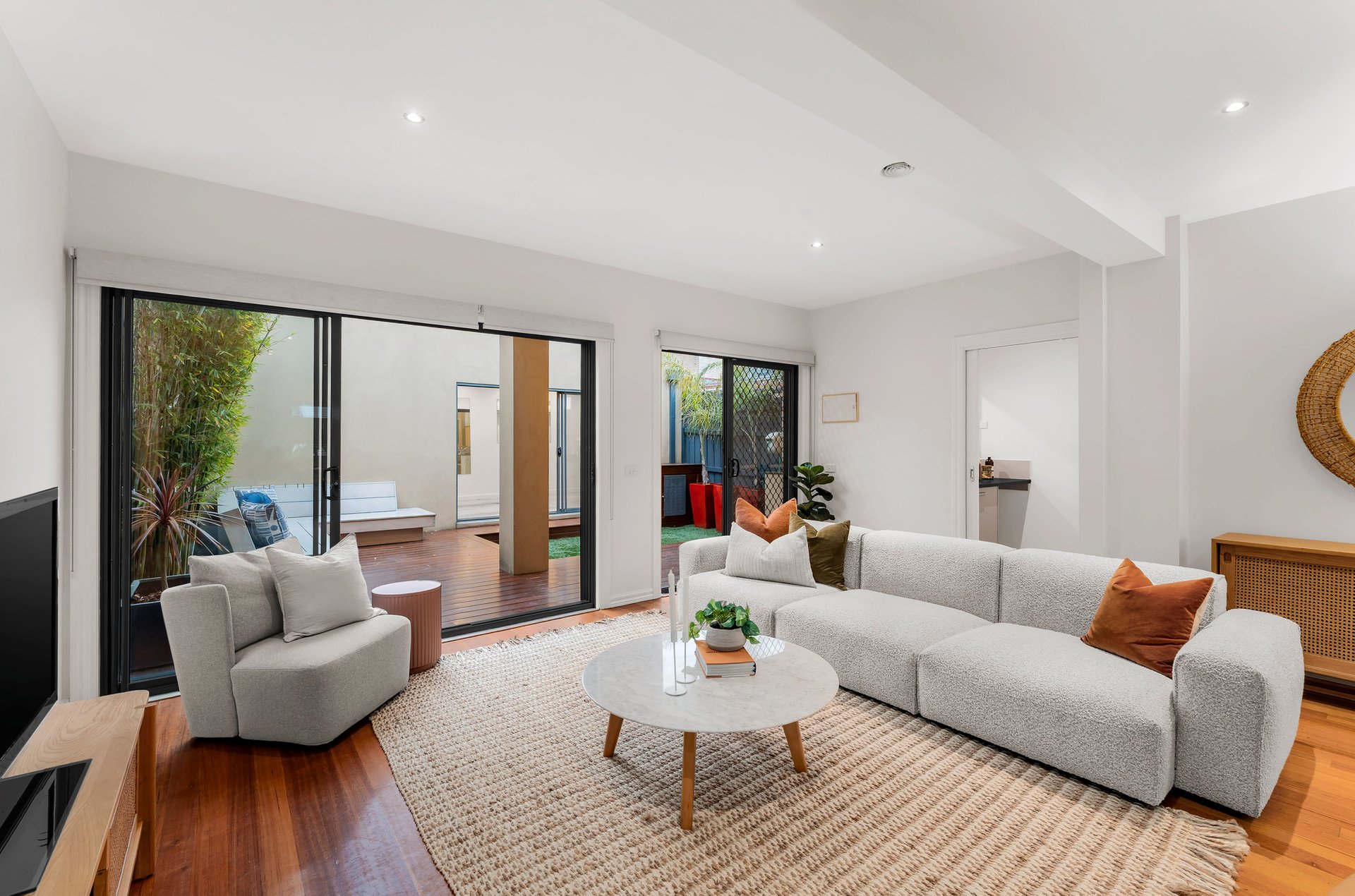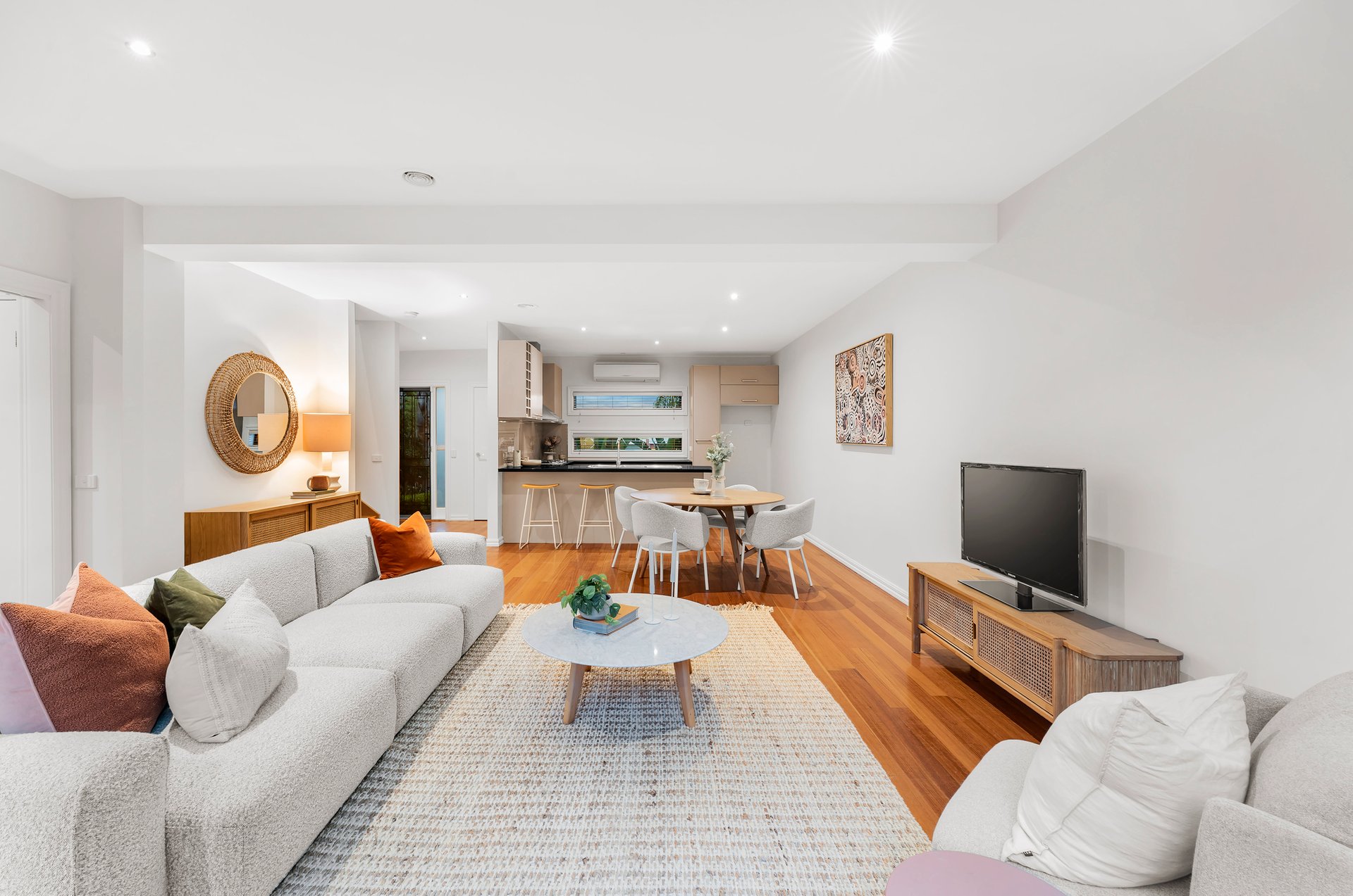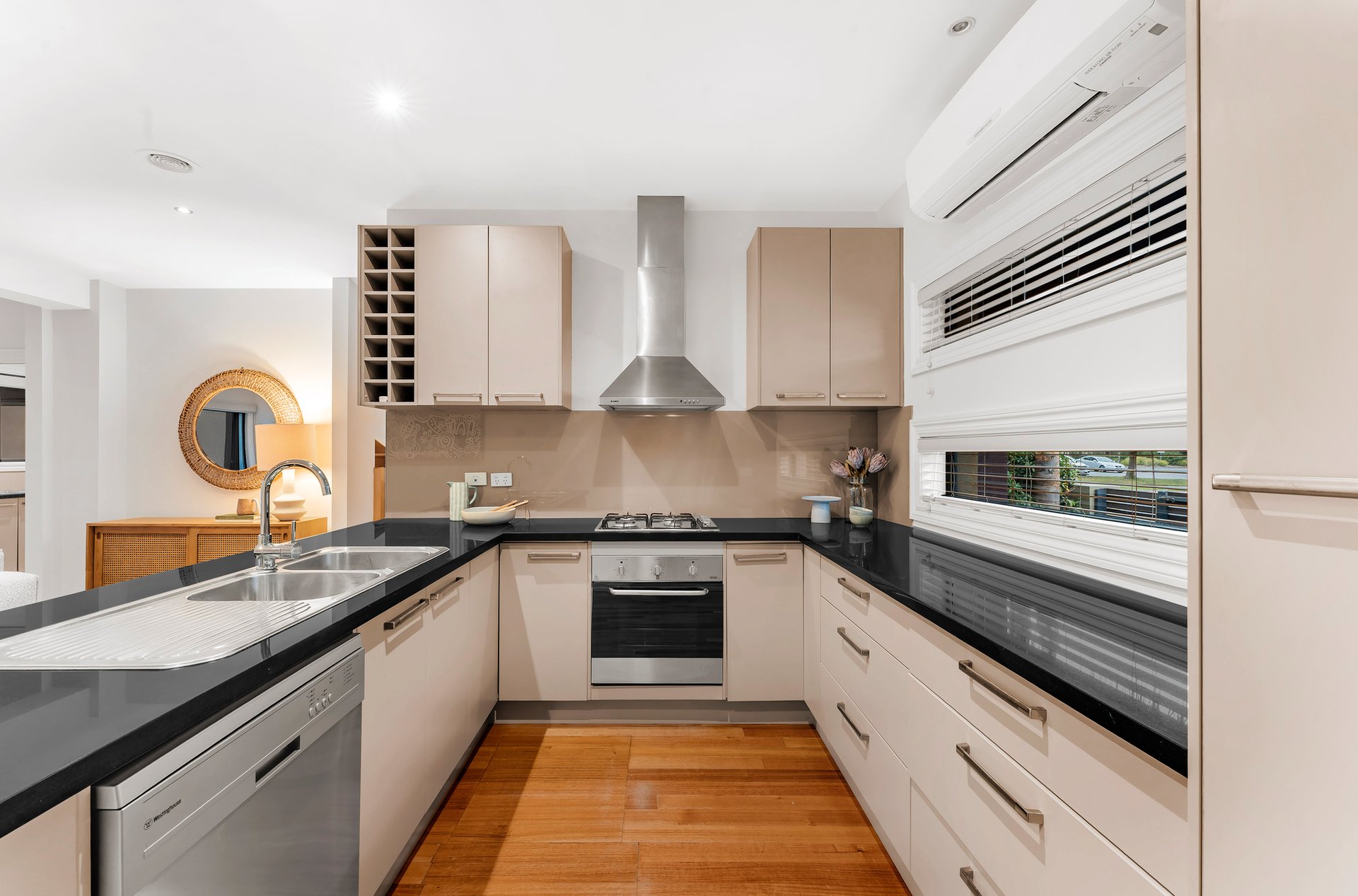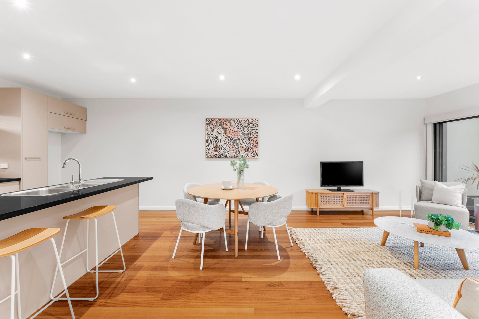 Inside, a light-filled open-plan living zone sets the tone for modern living. Natural finishes, polished timber floors and high ceilings create an inviting sense of space, while the seamless transition to a private alfresco courtyard makes entertaining effortless. The designer kitchen impresses with stone benchtops, stainless steel DeLonghi appliances and sleek cabinetry — the perfect combination of form and function.