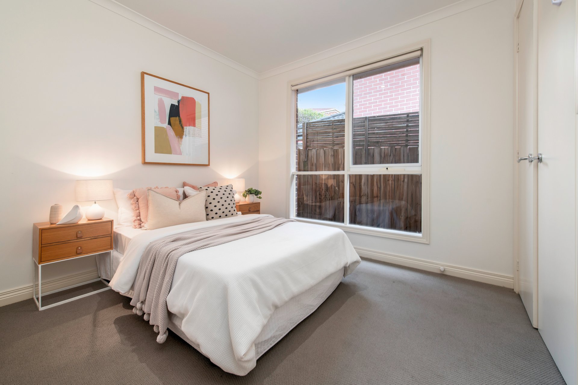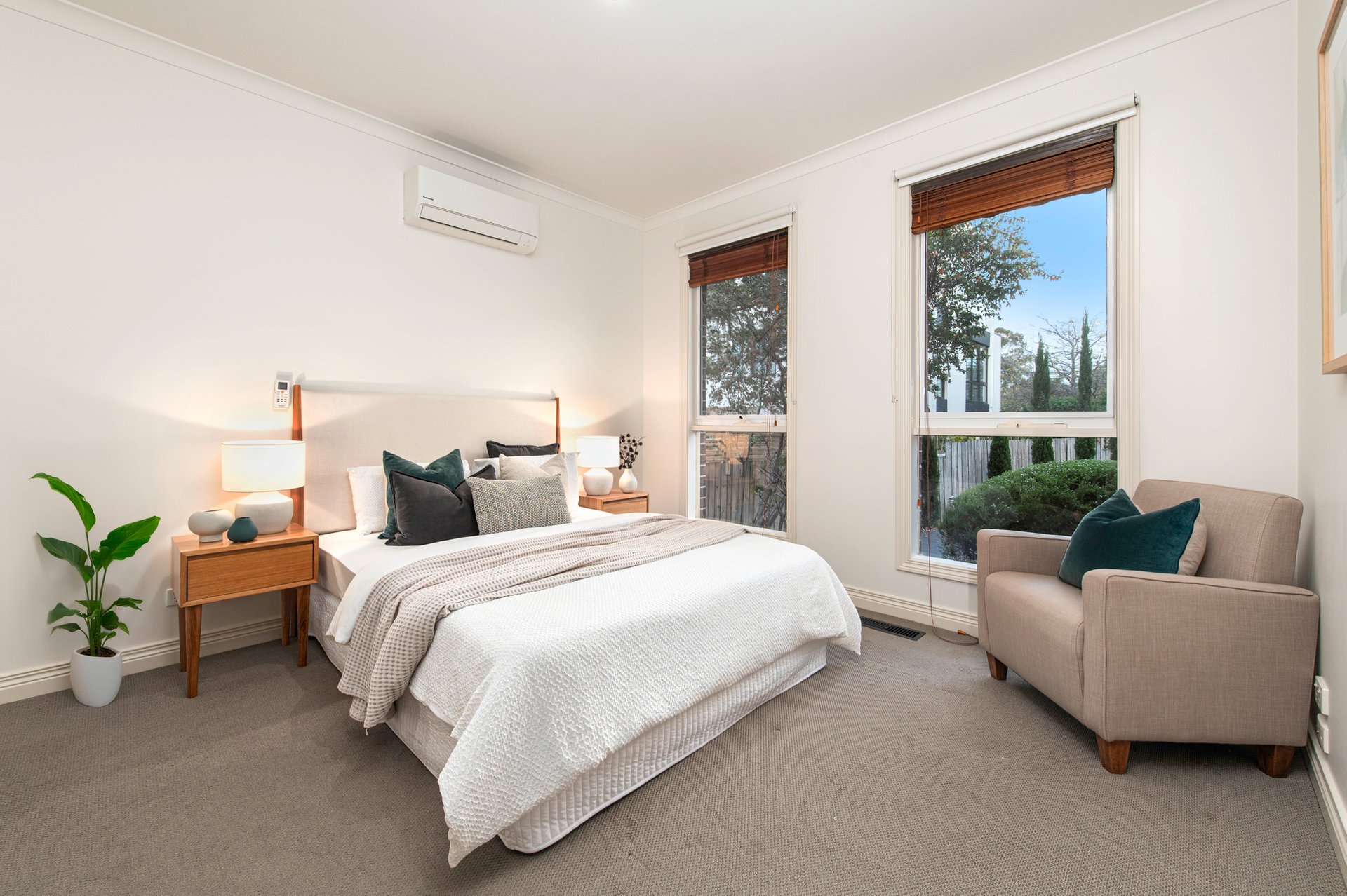The privately positioned main bedroom boasts a walk-in robe and ensuite, while two additional bedrooms with built-in robes are serviced by a central bathroom with a separate powder room. Additional highlights include a full laundry with external access, ducted heating, reverse cycle cooling, a low-maintenance garden courtyard, and a double remote garage.
