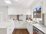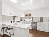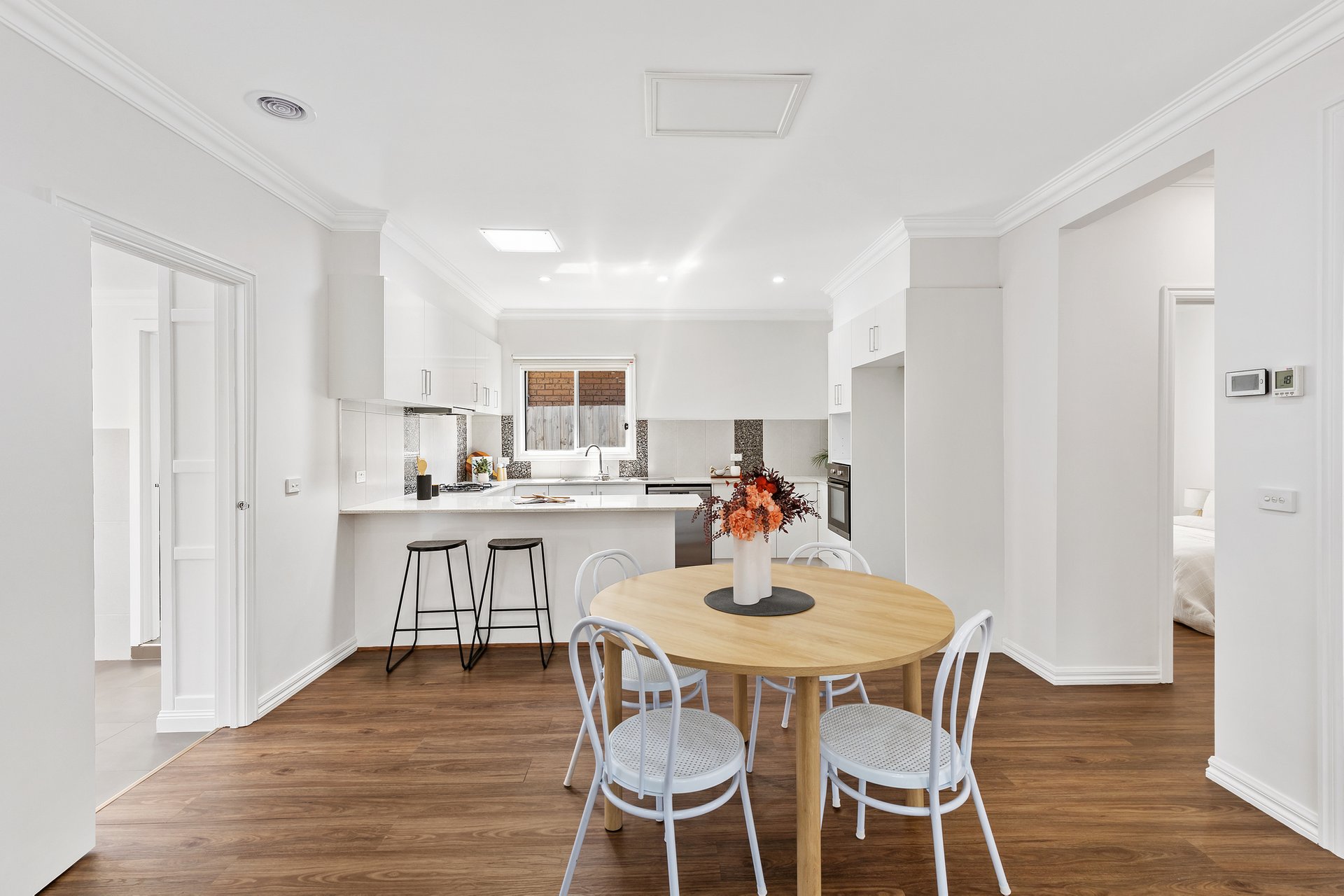Inside, the light-filled interior features new flooring throughout, fresh architraves and cornices, and a skylight that enhances natural light. The open-plan living and dining area flows seamlessly to a refreshed kitchen with refurbished cabinetry and generous storage, complemented by purpose-built bookshelves and custom laundry cabinetry for everyday convenience.