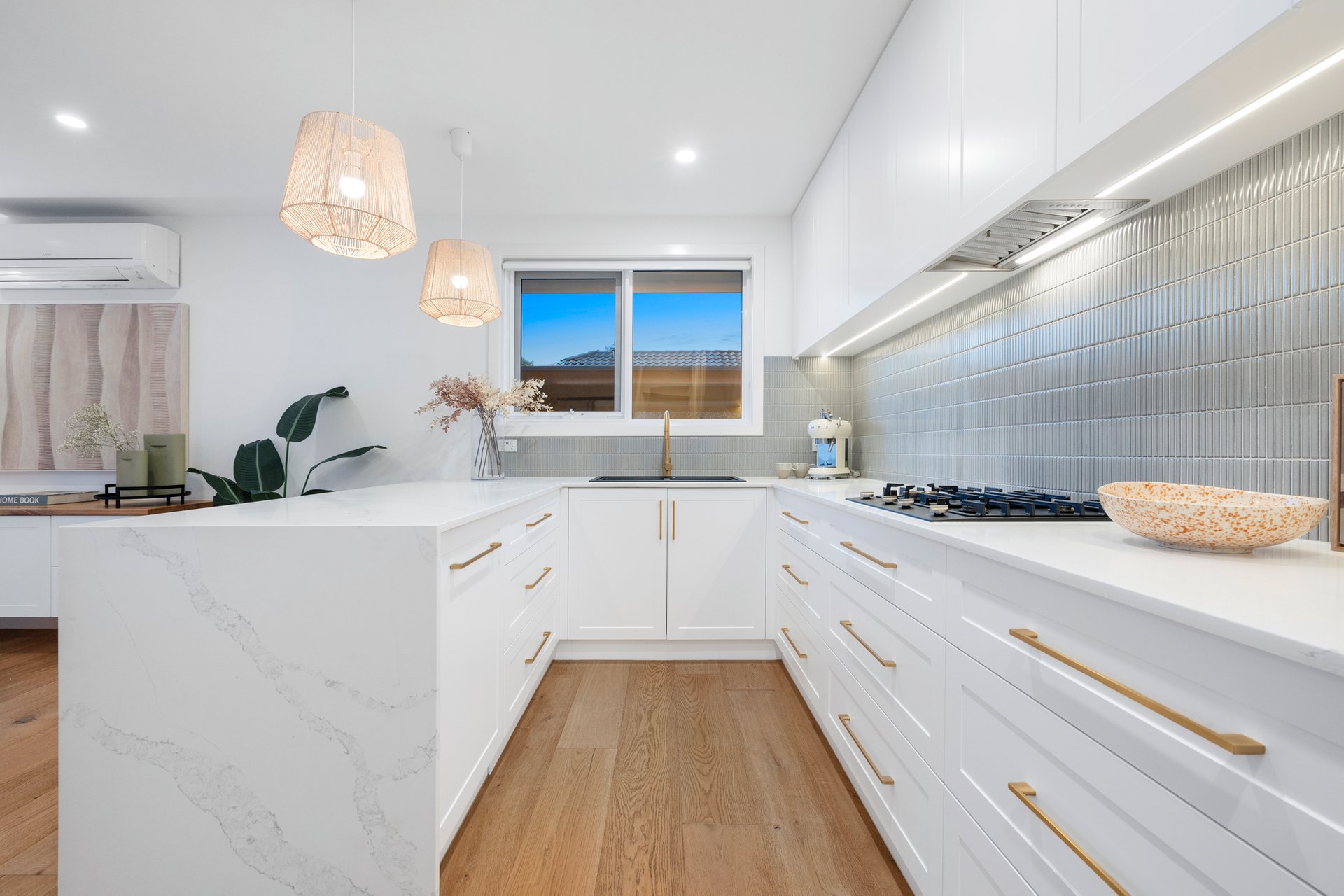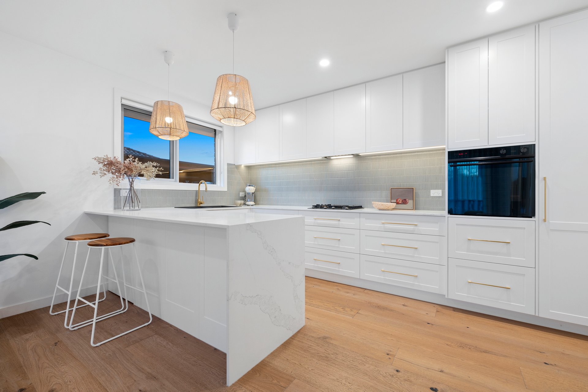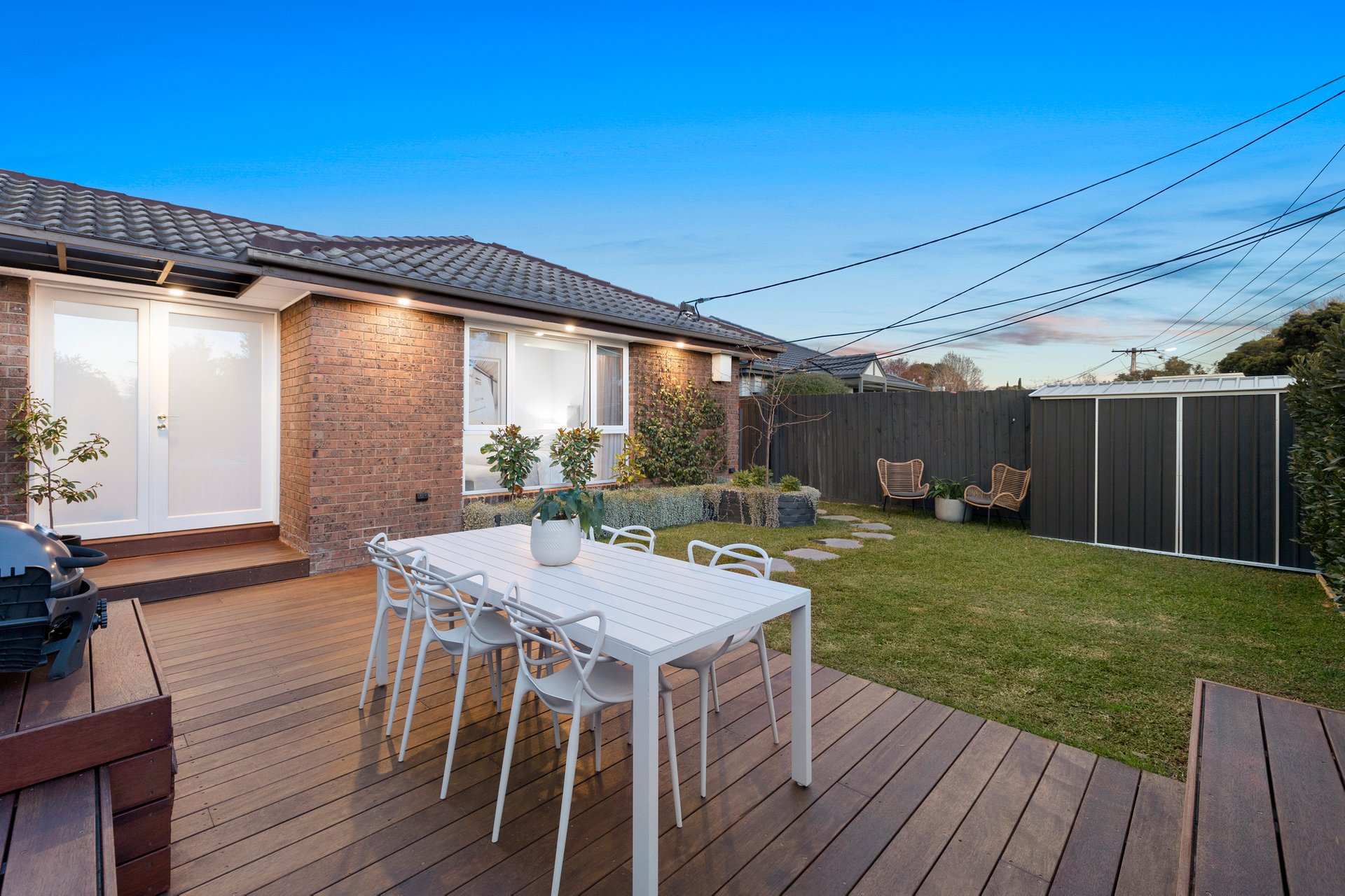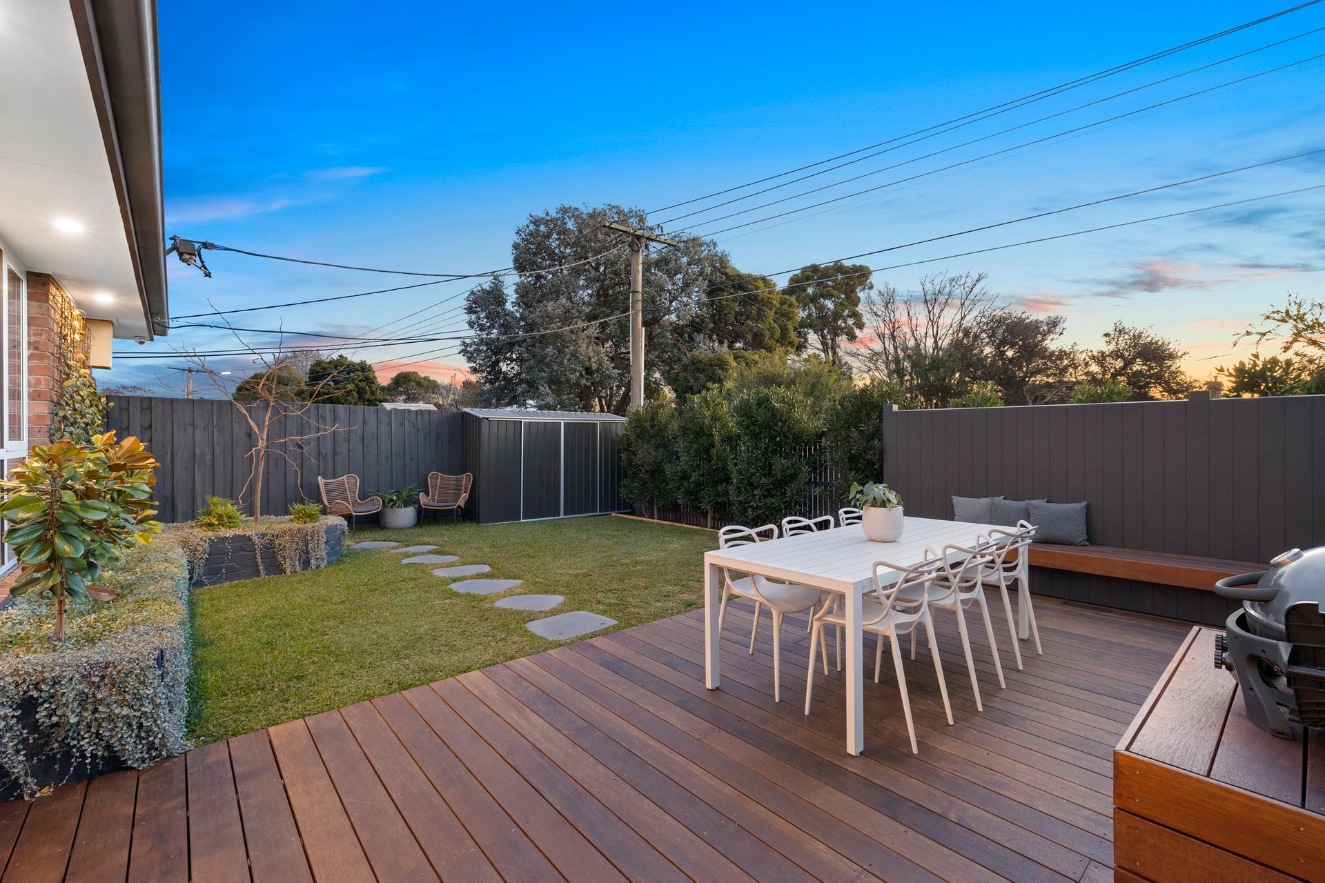 Enhanced by high-end finishes such as brushed gold fixtures, chic engineered oak flooring and quality wool carpets, the home also boasts split system heating/cooling, a European-style laundry, rear decking and carport parking. The front garden is made up of spaces to dine, relax and play – it has built-in seating, generous lawns and a storage shed along with a BBQ area for easy summertime soirees. A rare and fully enclosed outdoor storage unit also provides an ideal addition offering secure space for bikes, tools or extra belongings.