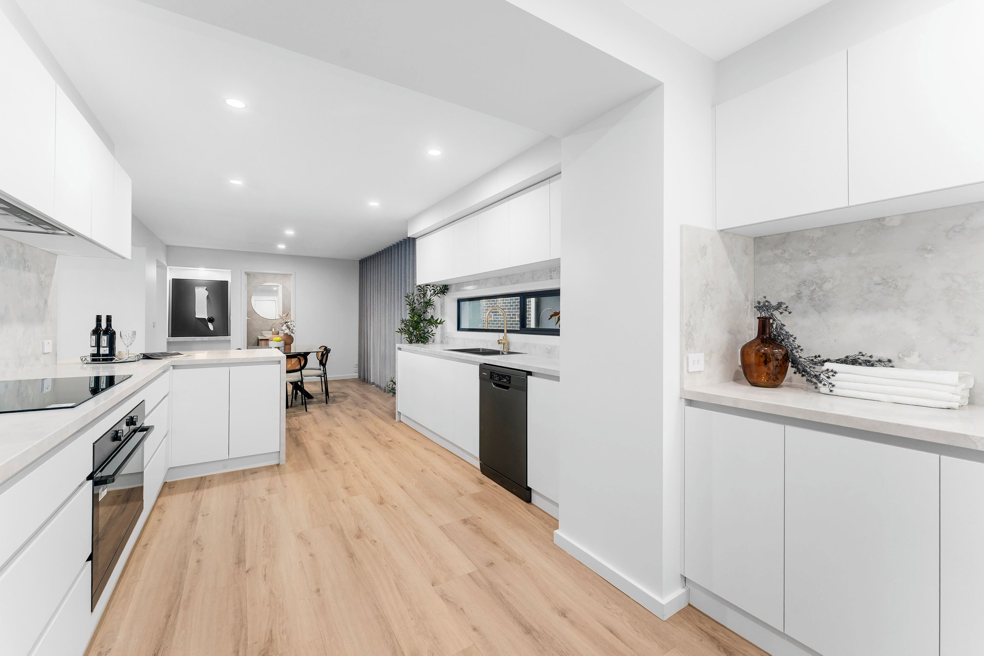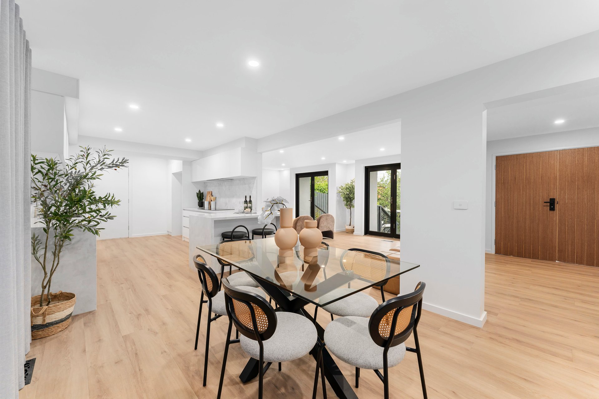 The open-plan living and dining area is bathed in natural light, anchored by a designer kitchen featuring stone benchtops and premium appliances. A seamless connection to a private courtyard makes entertaining easy year-round.