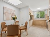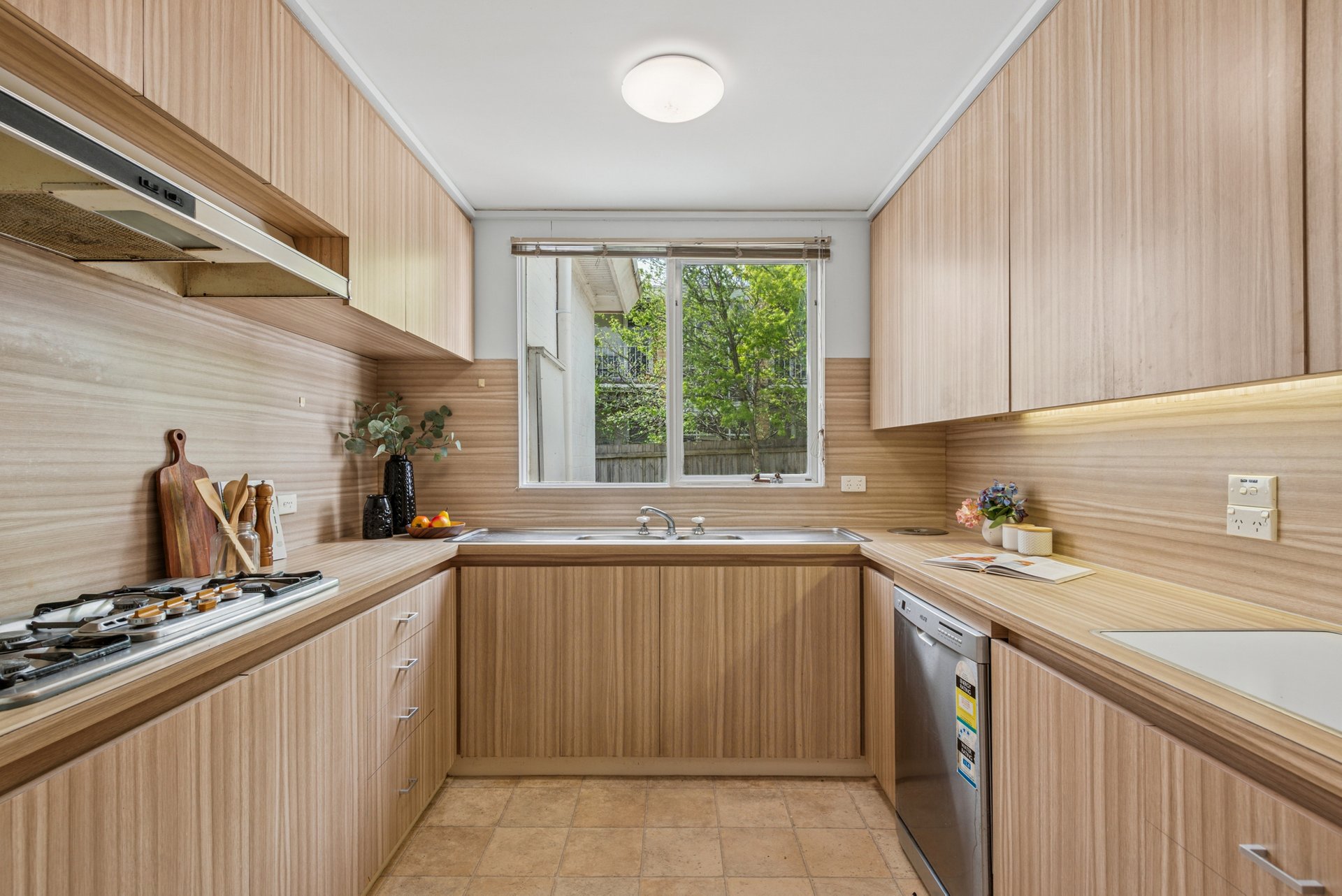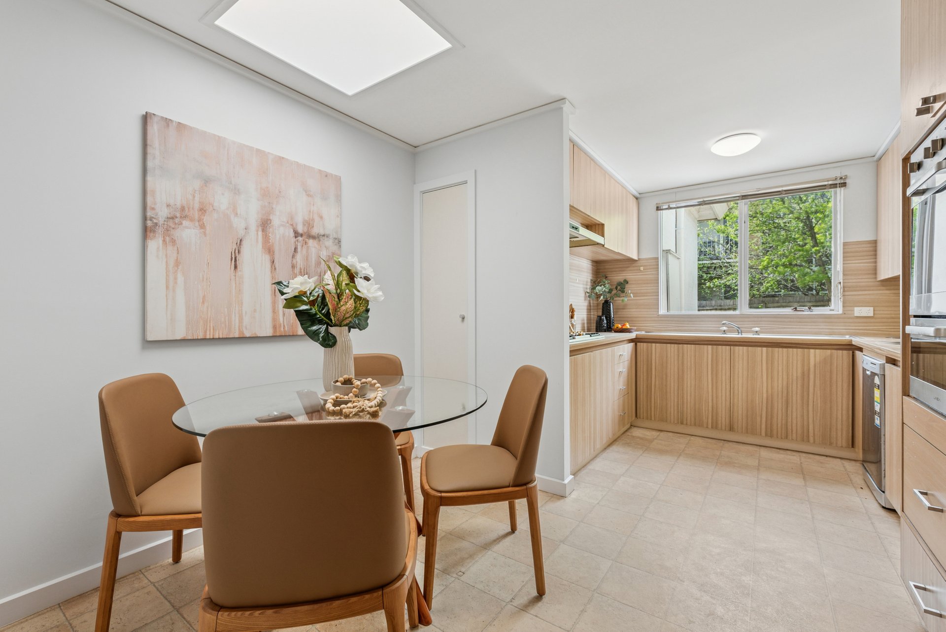 The front lounge sets an elegant tone, centred around an open fireplace and framed by leafy garden views. The adjoining dining room opens to a private patio for sunshine and quiet outdoor moments. On the opposite side, the kitchen and meals area are set together, fitted with stainless-steel appliances, gas cooktop, wall oven and dishwasher. There’s generous room to cook, chat and share daily life.