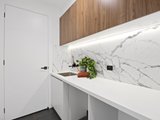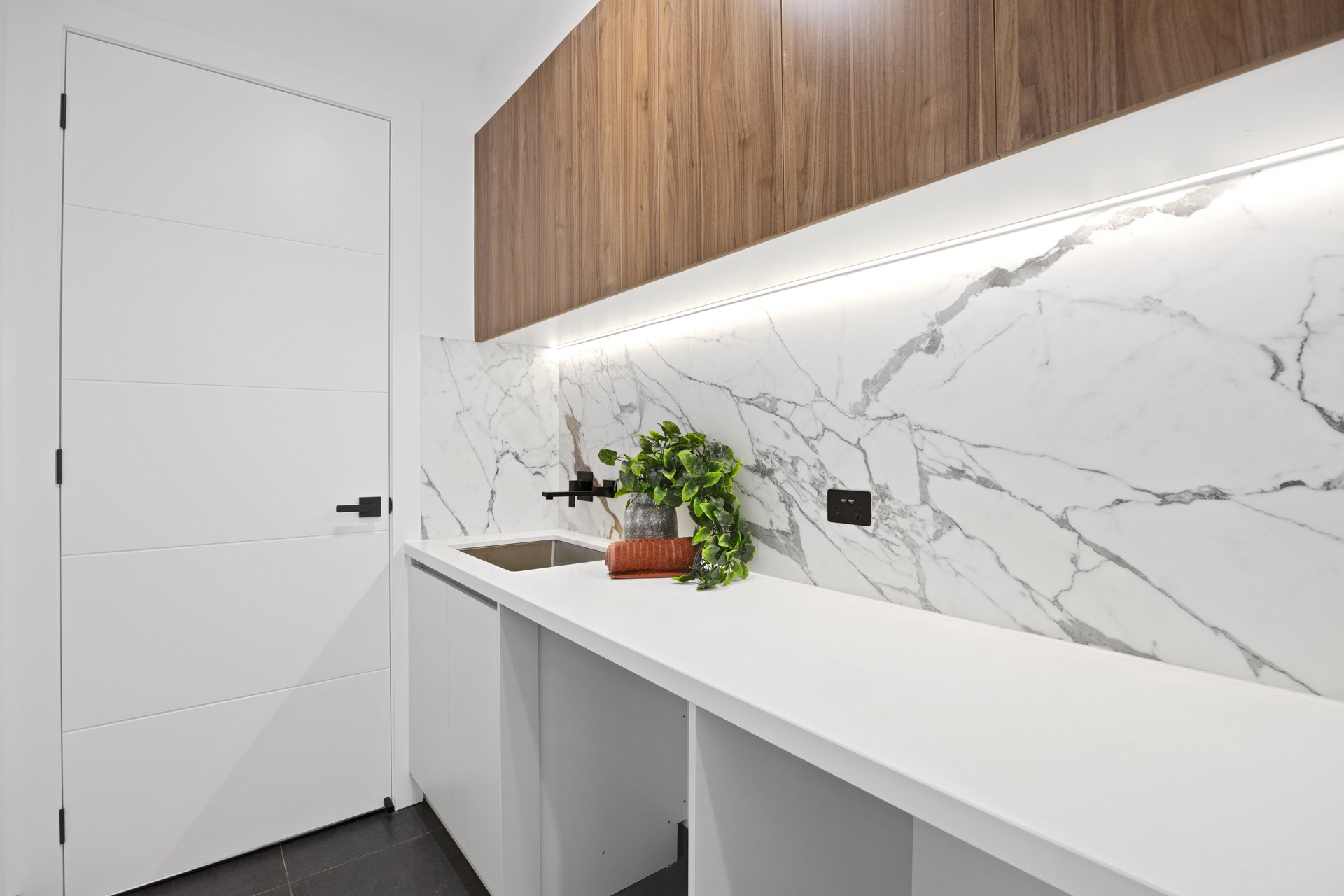 - Laundry with overhead cupboards, splash back, and LED lighting