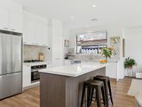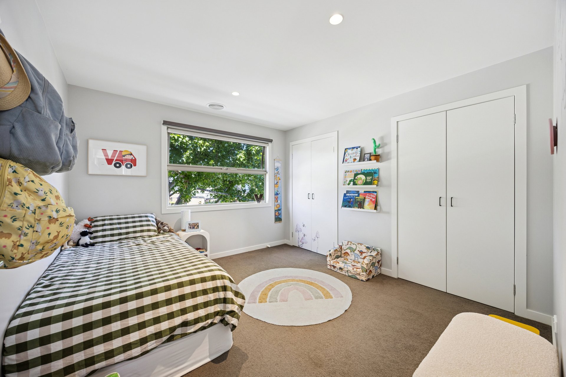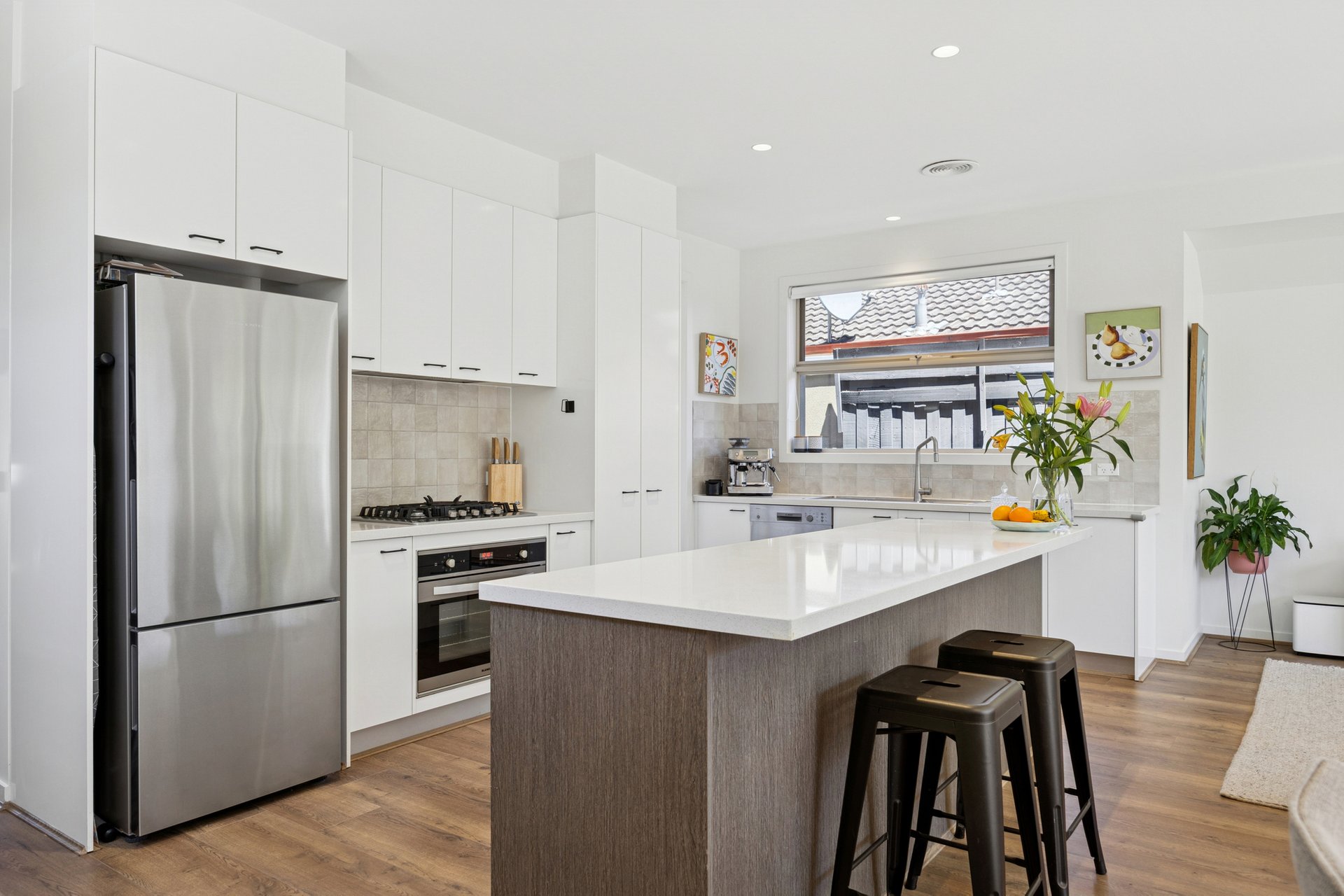 The kitchen is finished with stone benchtops, an island bench, breakfast bar and dishwasher, all positioned with clear sightlines to the living area so you’re never cooking in isolation. Sliding doors blur the line between inside and out, connecting to a sunny patio and grassed area, tailormade for everyday living and easy entertaining. A powder room, laundry and under-stair storage round out the ground level. Upstairs, two further bedrooms with robes sit on opposite sides of a central bathroom with bath, shower and separate toilet, giving everyone their own space. Comfort and efficiency are built in with ducted heating and cooling, central vacuuming, solar panels paired with a Tesla battery, and a double garage.