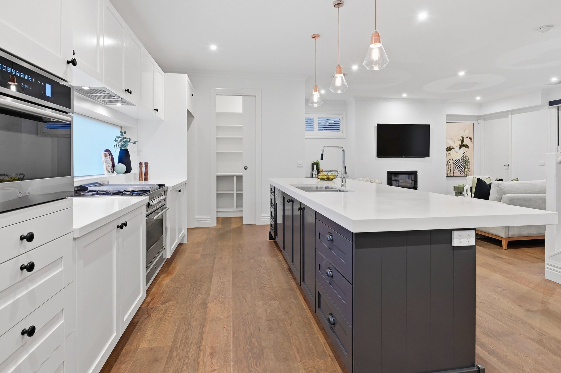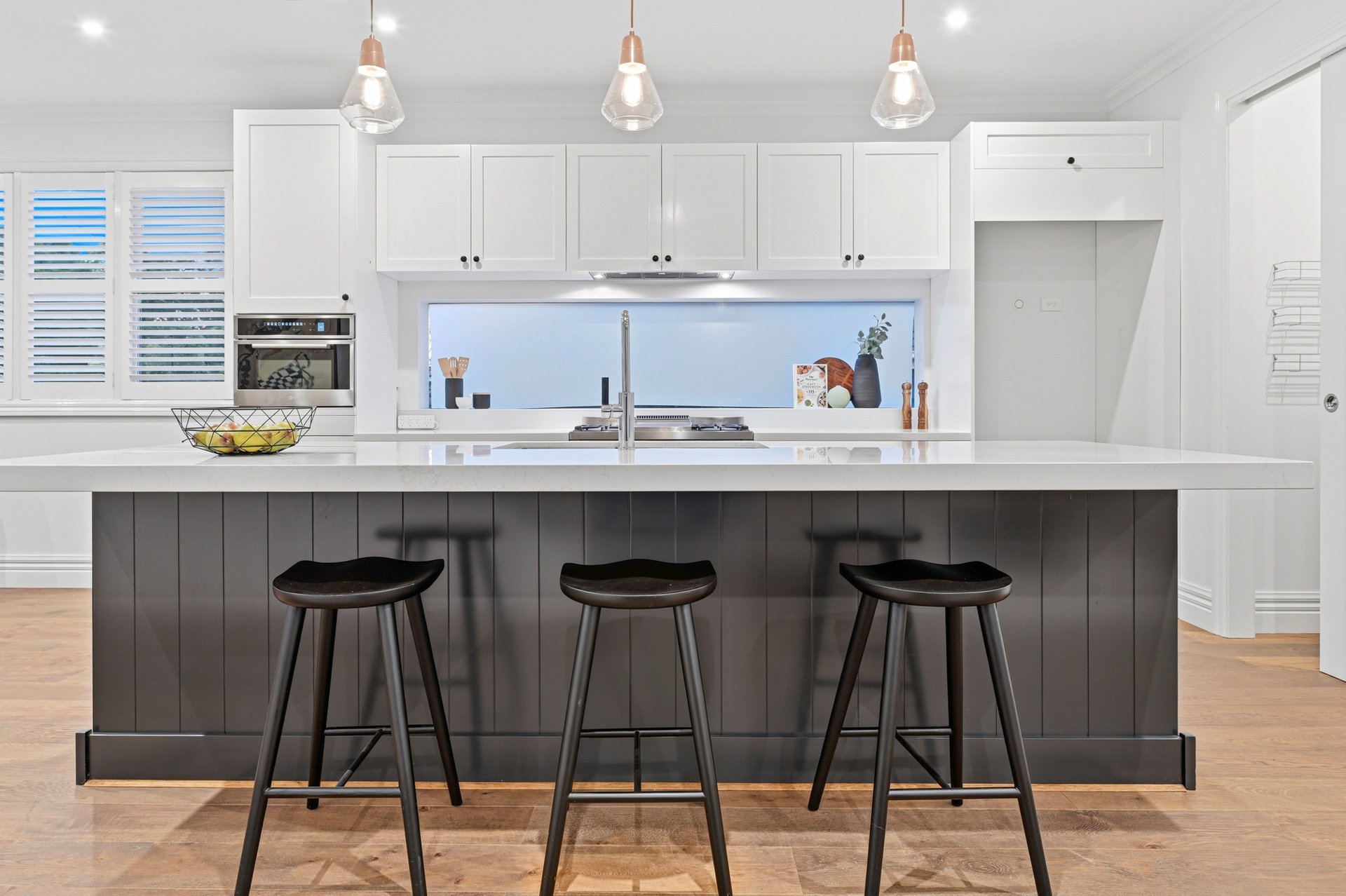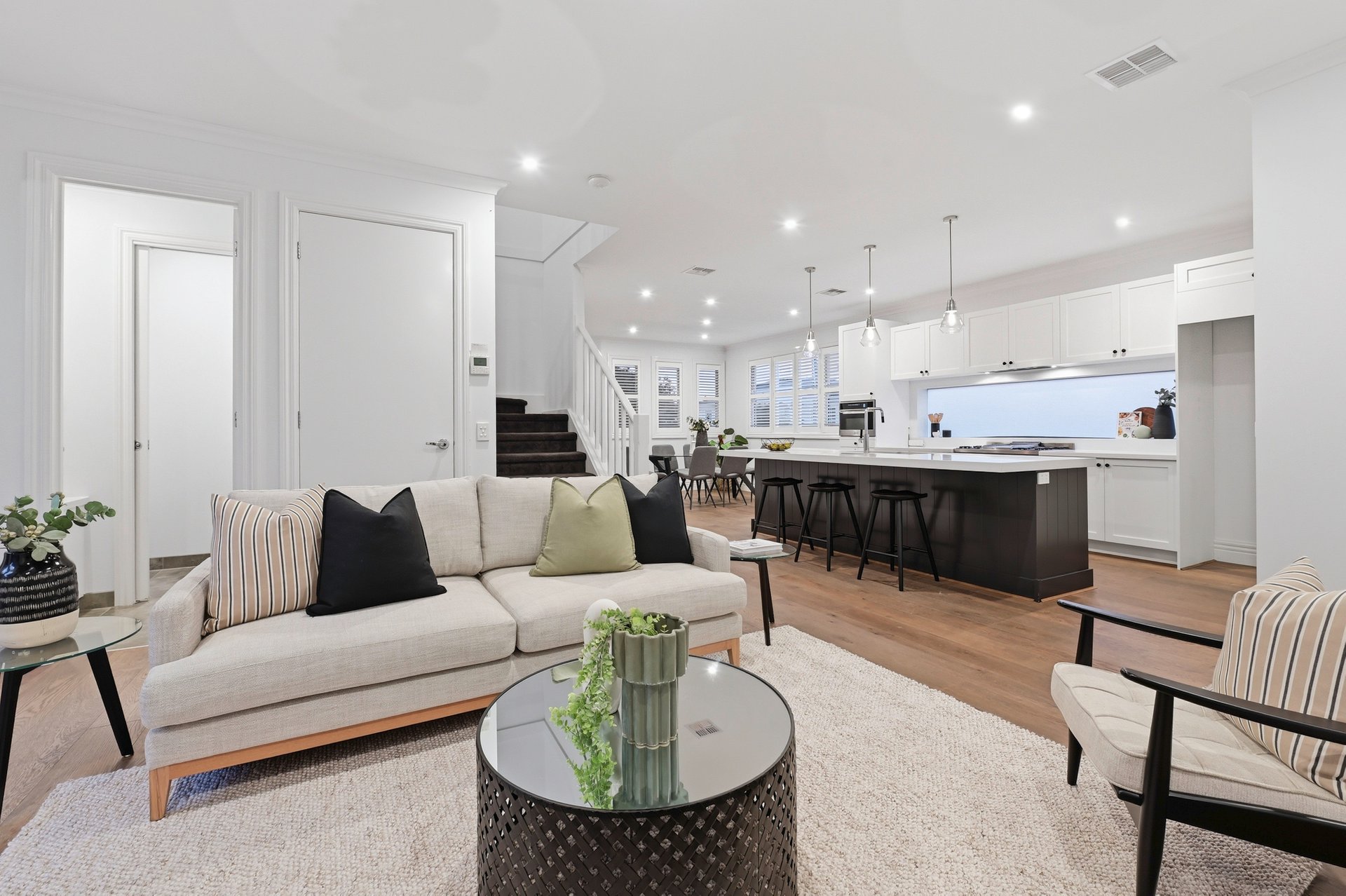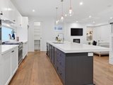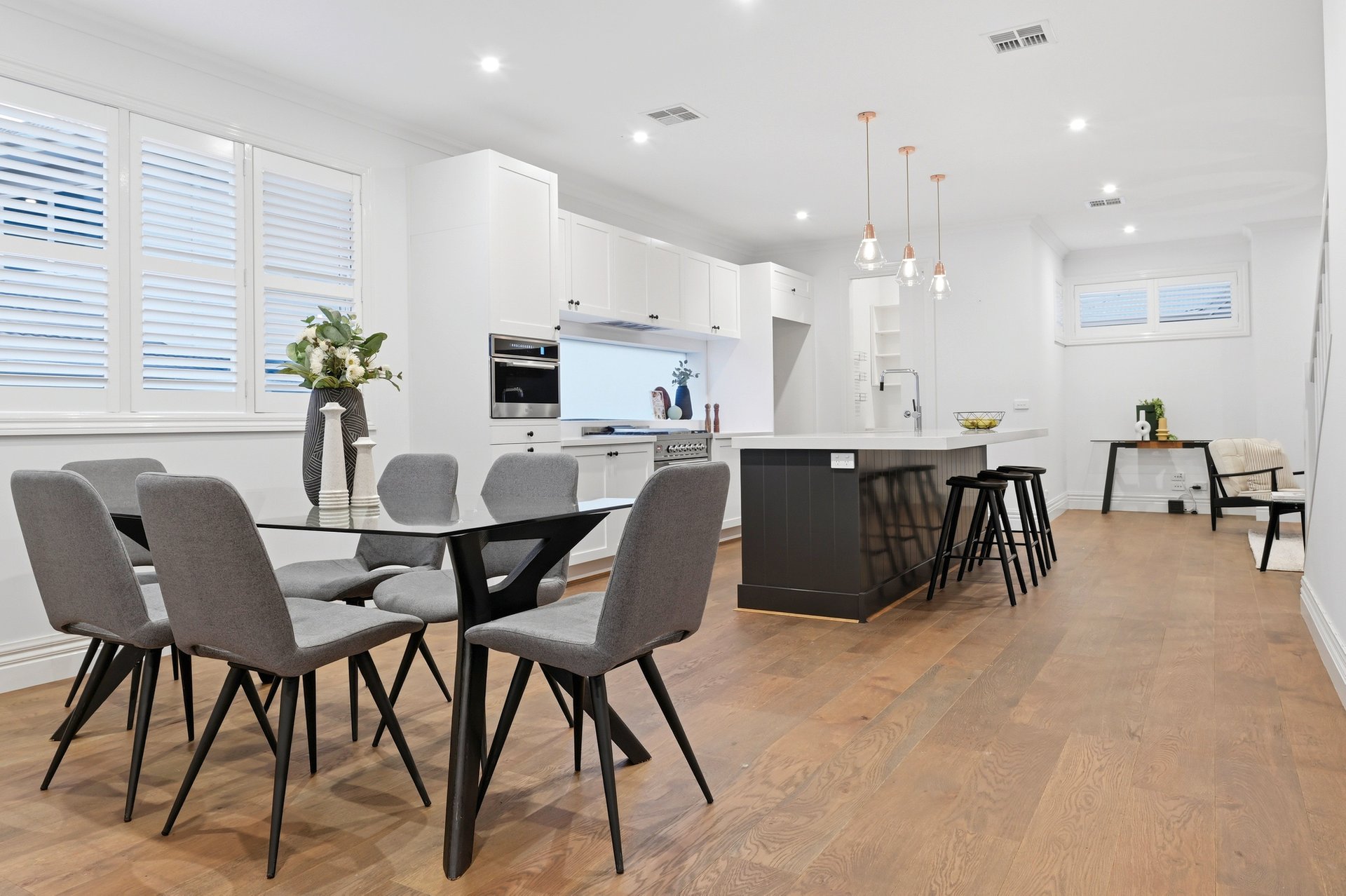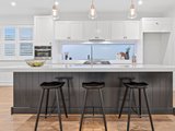 Engineered oak floors, elegant plantation shutters, and marble-look stone benchtops are just a few of the high-end details that make this such a special offering. The open plan downstairs living zone is split into family and dining areas, with the striking kitchen sitting in the heart of this space. Home chefs will appreciate all the amazing features of the kitchen that will make cooking a breeze, including soft-close drawers, a sizeable island bench (with pendant lighting), and stainless steel Miele and ILVE appliances including 900mm cooking.