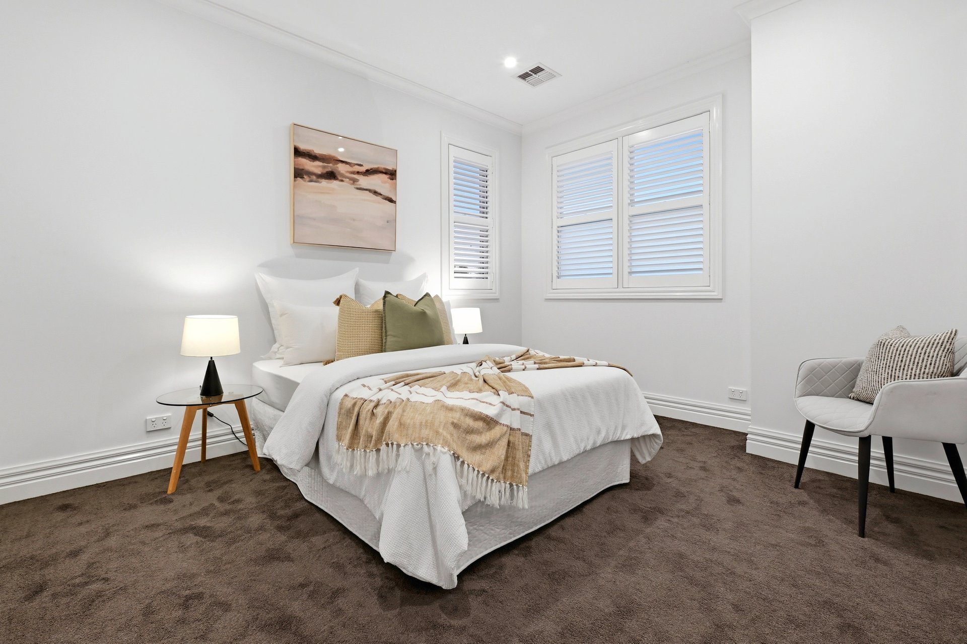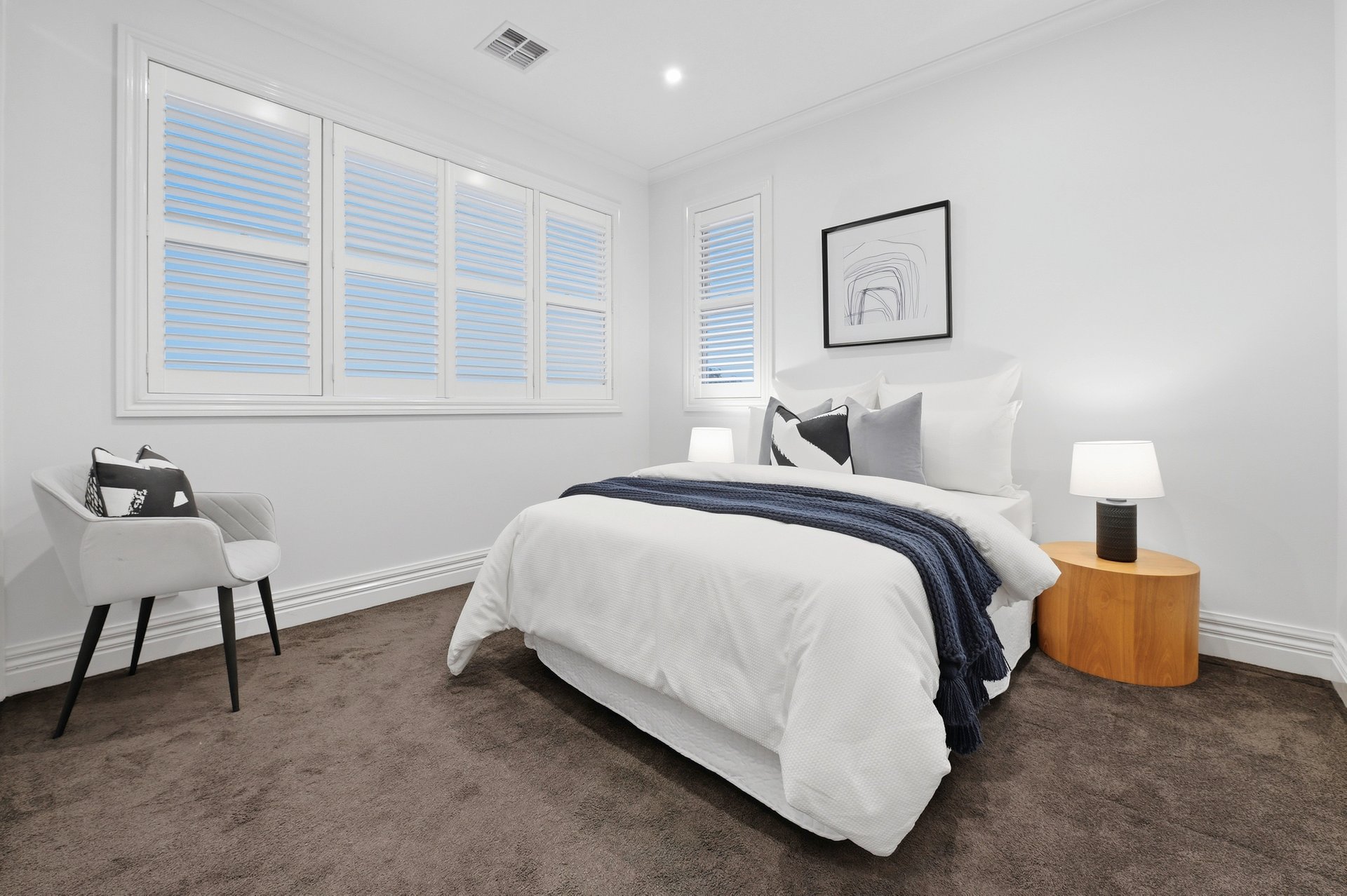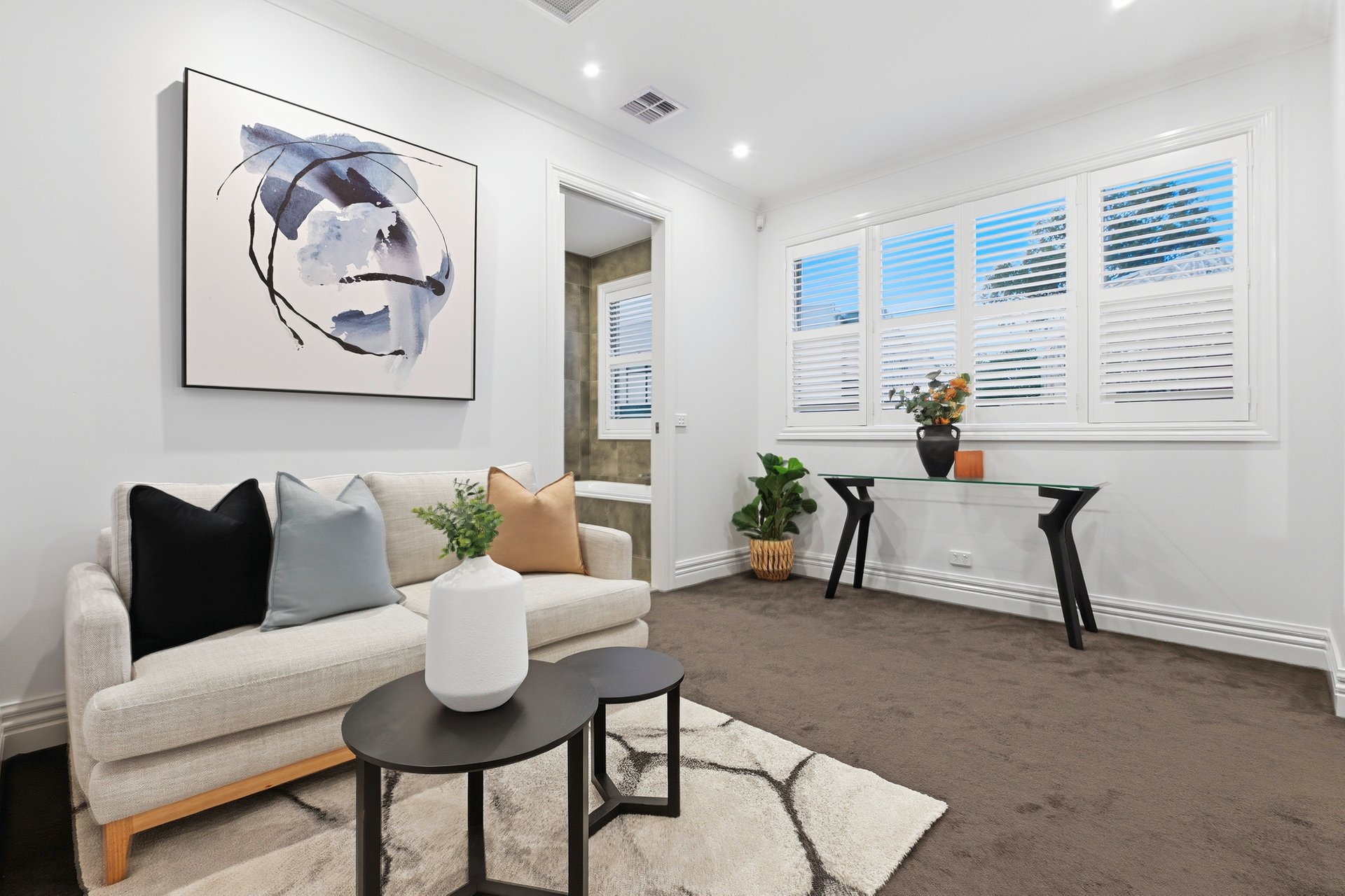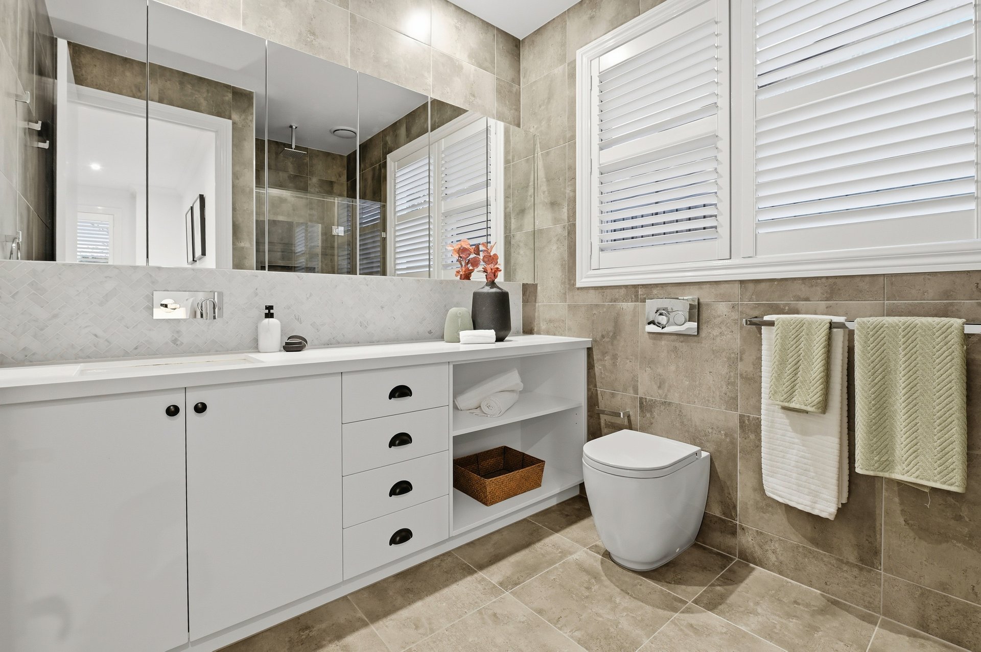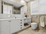 Engineered oak floors, elegant plantation shutters, and marble-look stone benchtops are just a few of the high-end details that make this such a special offering. The open plan downstairs living zone is split into family and dining areas, with the striking kitchen sitting in the heart of this space. Home chefs will appreciate all the amazing features of the kitchen that will make cooking a breeze, including soft-close drawers, a sizeable island bench (with pendant lighting), and stainless steel Miele and ILVE appliances including 900mm cooking.