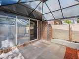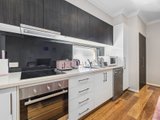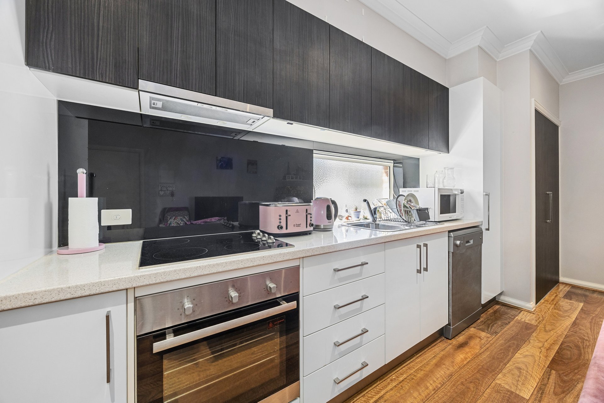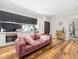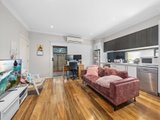 Inside, warm timber-look flooring flows from the entrance into an open plan living and dining room, where glass sliding doors extend the space to a private front courtyard for indoor-outdoor entertaining.