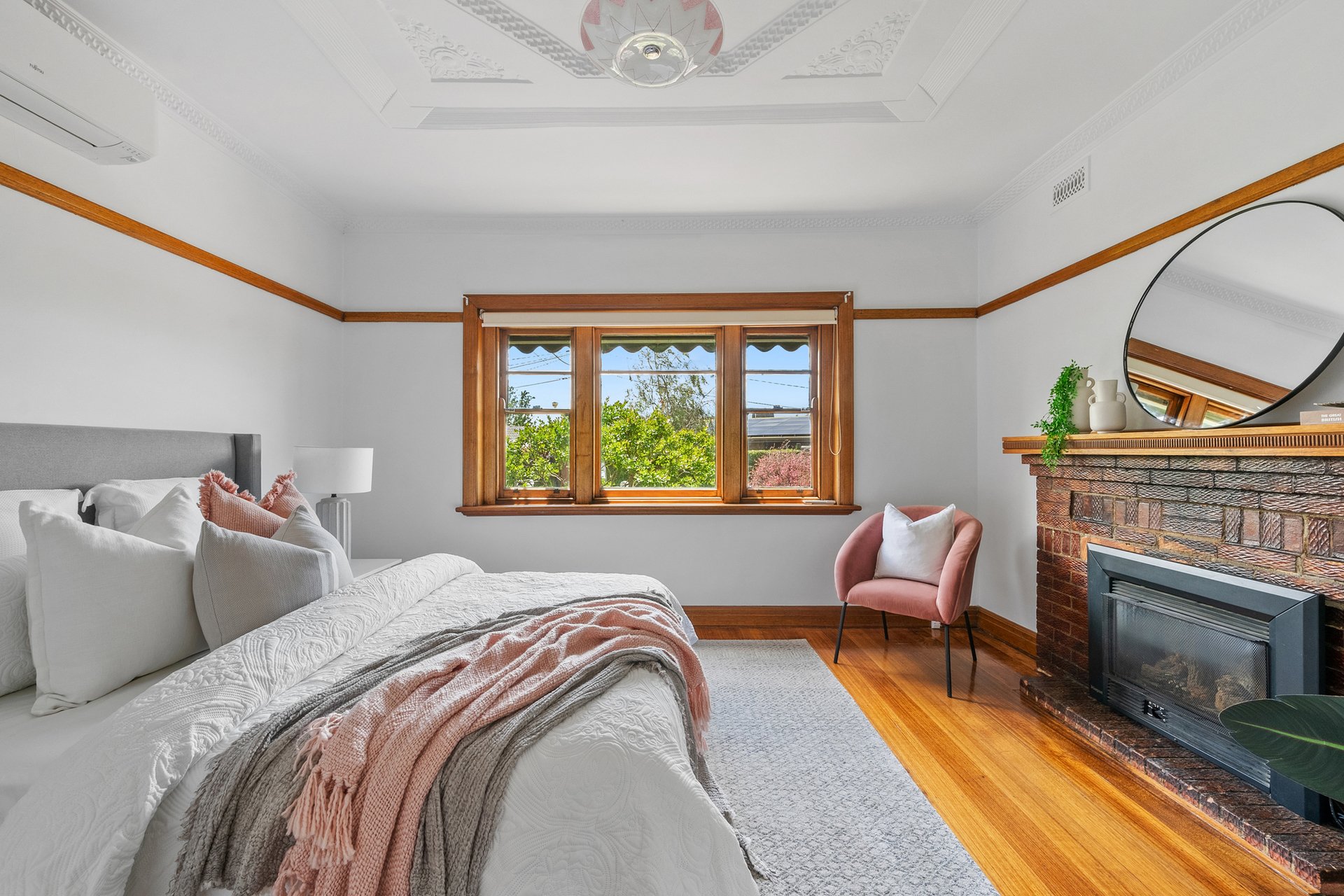 Behind its charming façade, the home opens to a welcoming hallway leading to a large front bedroom (or formal lounge) with decorative fireplace, three additional bedrooms with built-in robes, and a central bathroom. The well-appointed kitchen flows through to a generous open-plan living and dining area, complemented by split-system heating and cooling for year-round comfort.