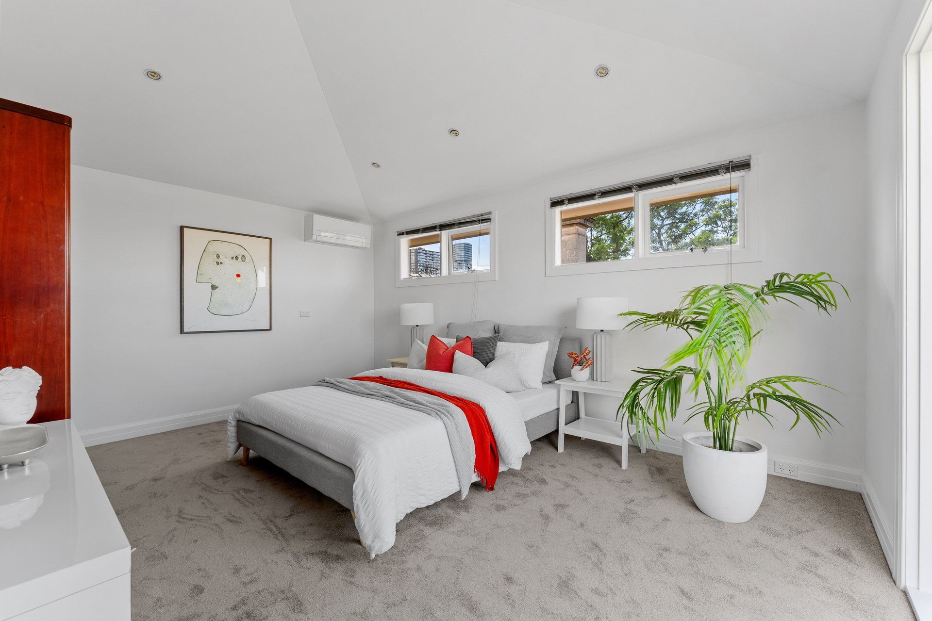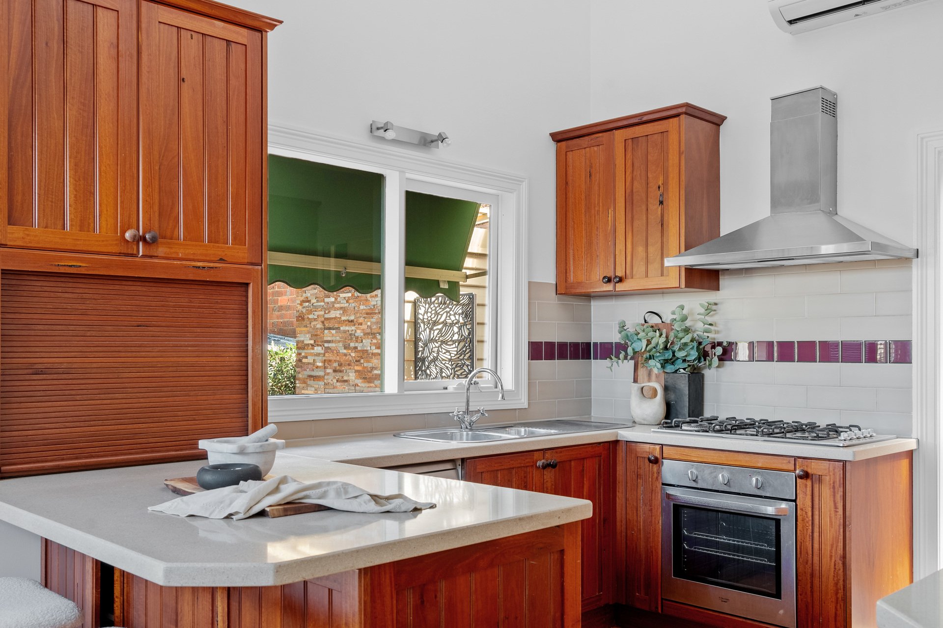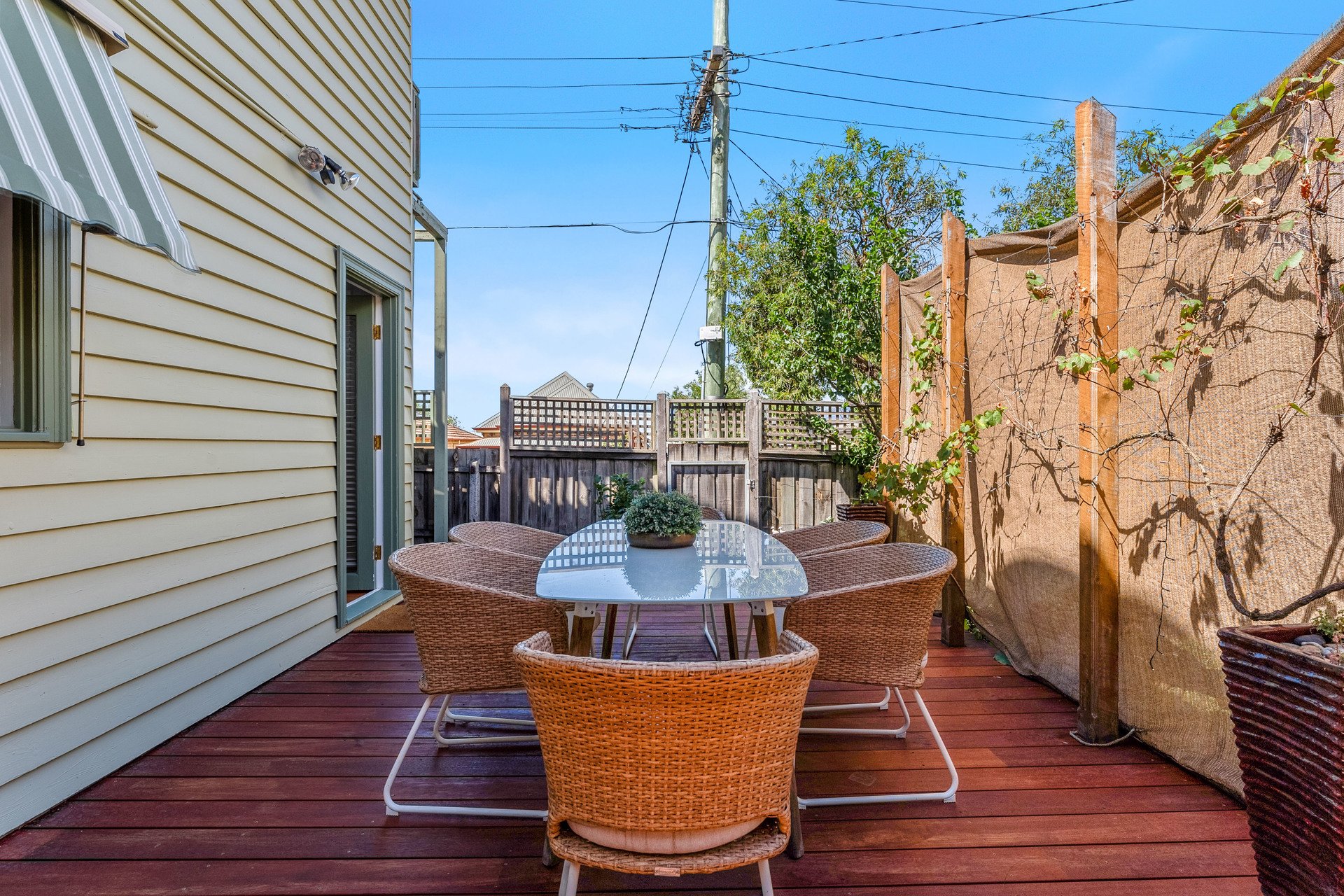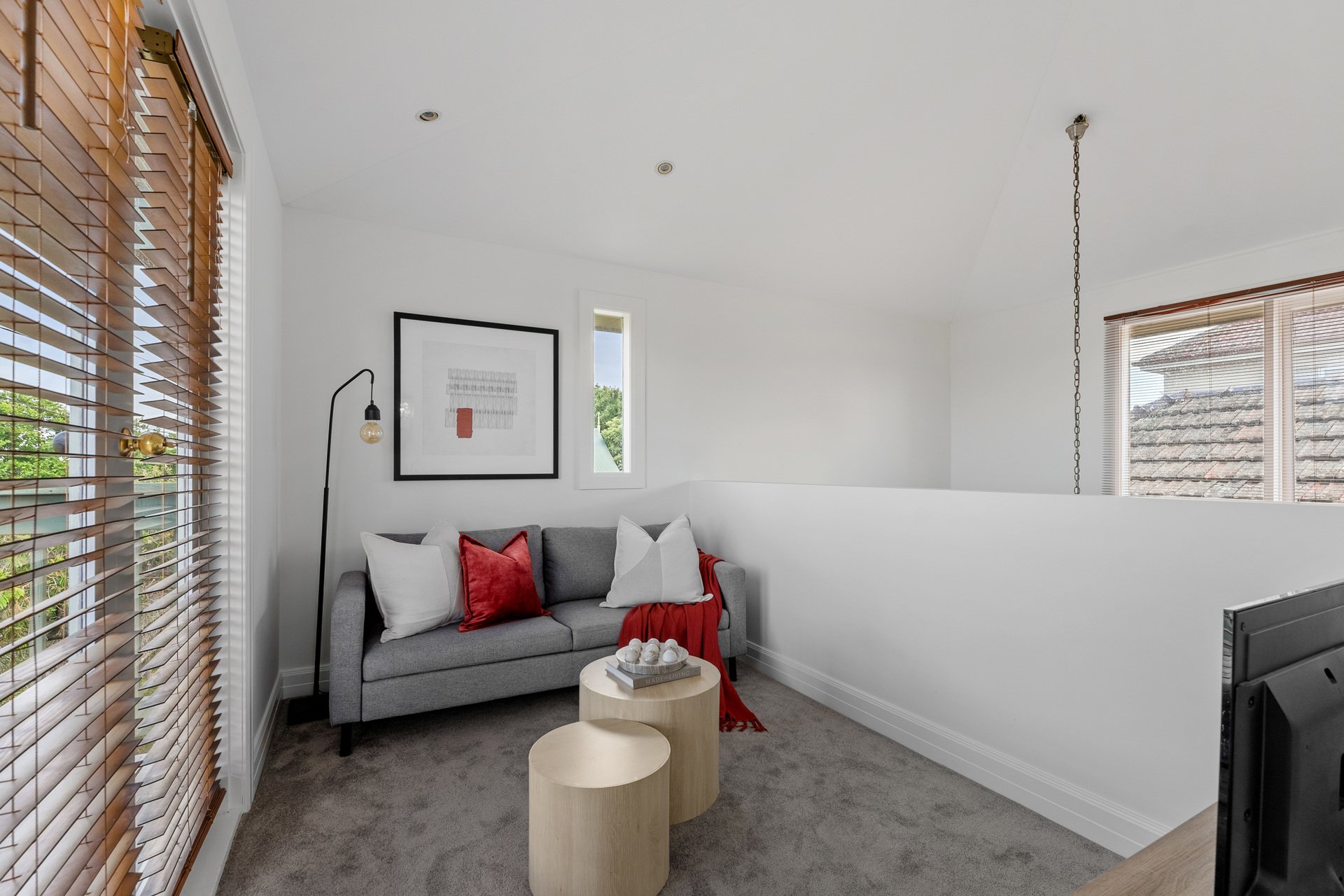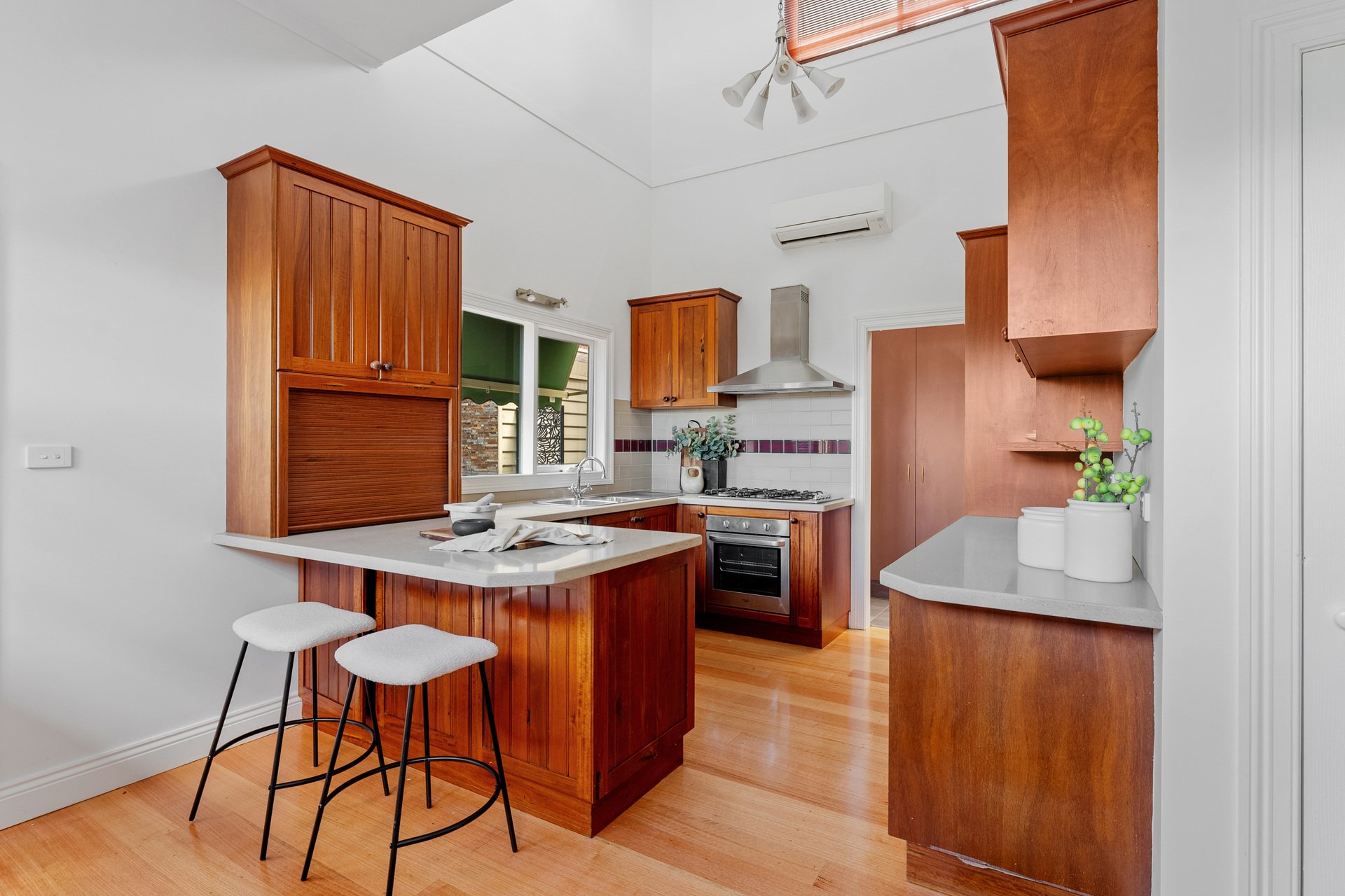Upstairs, a light-filled retreat and an oversized bedroom extend onto a balcony capturing uninterrupted panoramic views across Melbourne's most recognisable landmarks. At the heart of the home, the contemporary kitchen and meals area impress with lofty ceilings, a stone-topped breakfast bar, walk-in pantry, appliance cupboard, and premium stainless-steel appliances. This inviting space flows seamlessly to a refurbished Merbau deck, designed for relaxed outdoor entertaining.