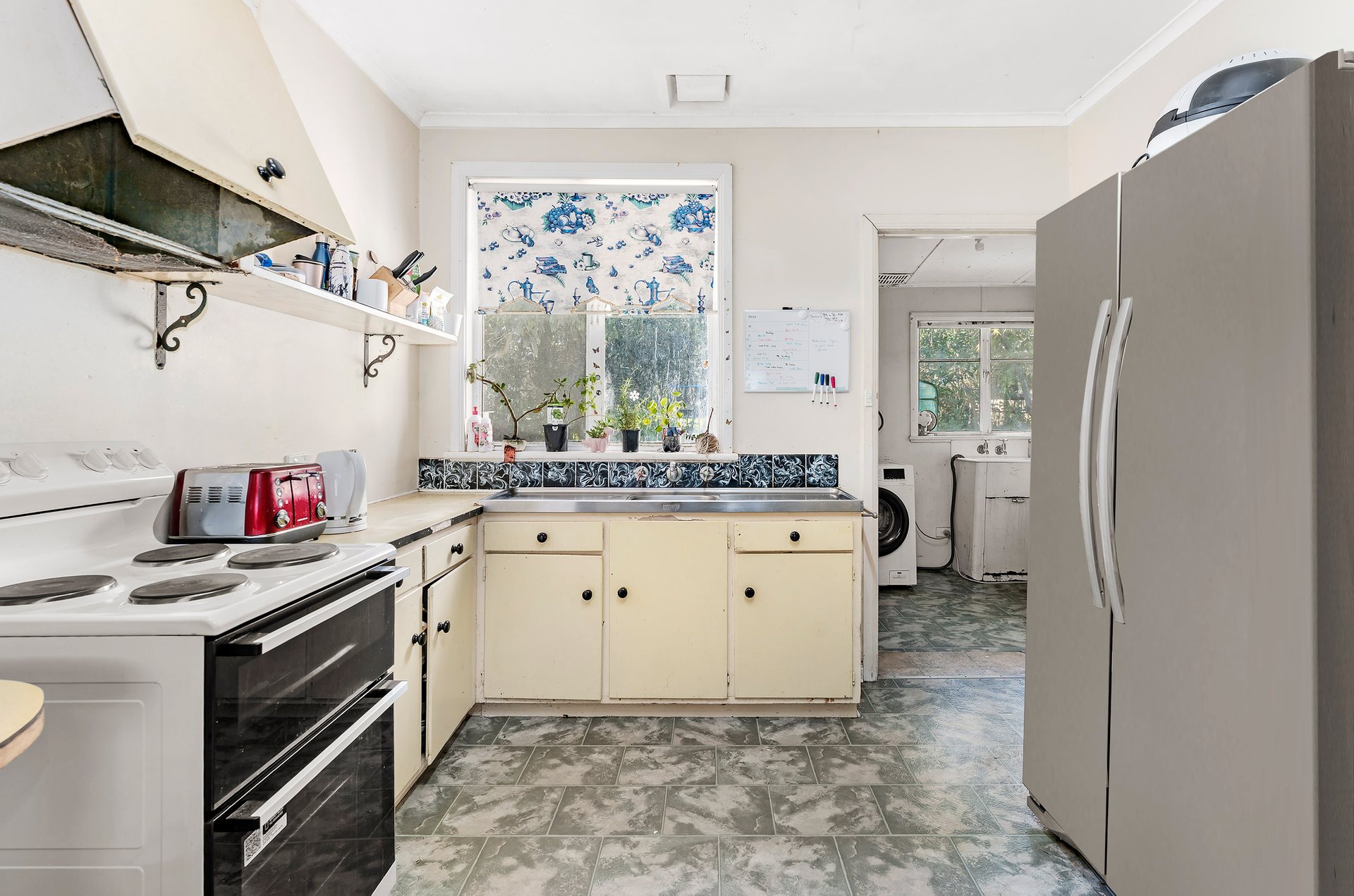 Inside, the home offers a traditional layout with a welcoming lounge, a separate dining room, and a practical kitchen with adjoining meals area. Two of the three bedrooms feature built-in robes. The house also features a full bathroom with an additional separate shower, and a full-size laundry, ensuring the home can cater for immediate living or rental while plans for improvement are considered. Large windows flood the interior with natural light and frame the façade beautifully.