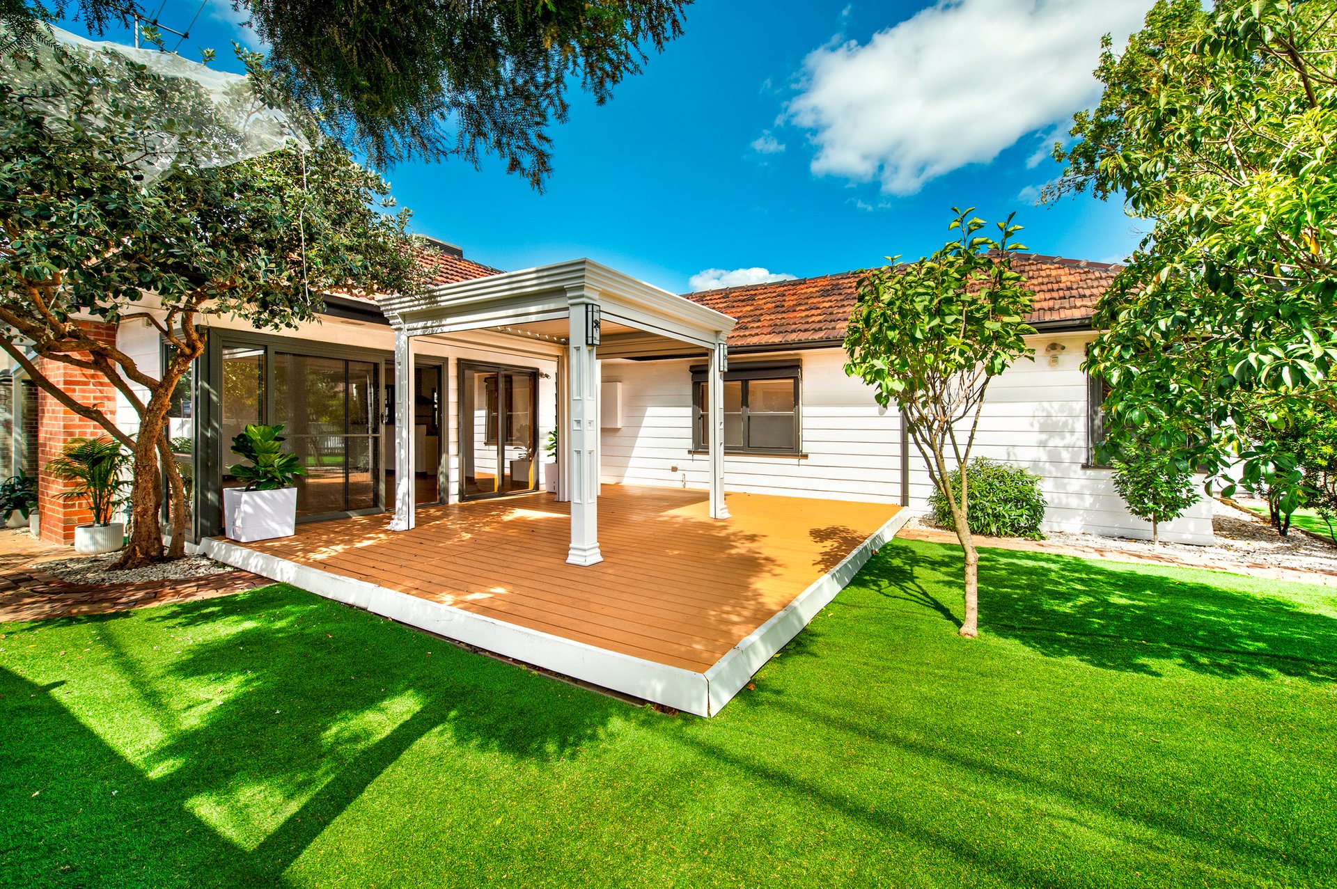 The greenery that accompanies the front of this dwelling needs to be seen to be believed, with gorgeous and low-maintenance wraparound gardens complemented by a large entertainer’s deck which has a covered pergola area. Inside, the front lounge and dining room impresses with striking timber floors and an open fireplace, with the neighbouring eye-catching kitchen featuring polished timber benchtops and stainless steel Bosch and Westinghouse appliances.