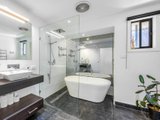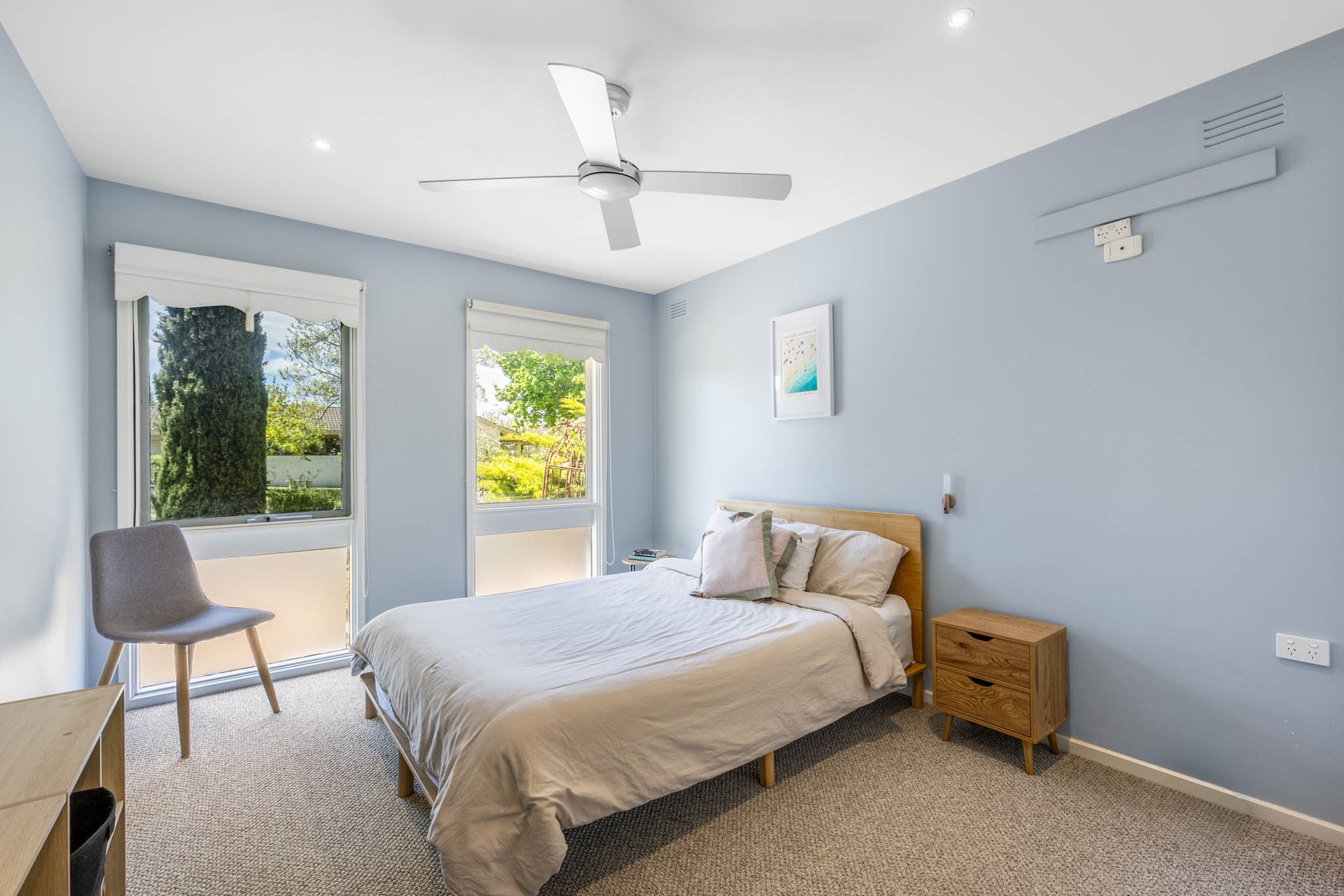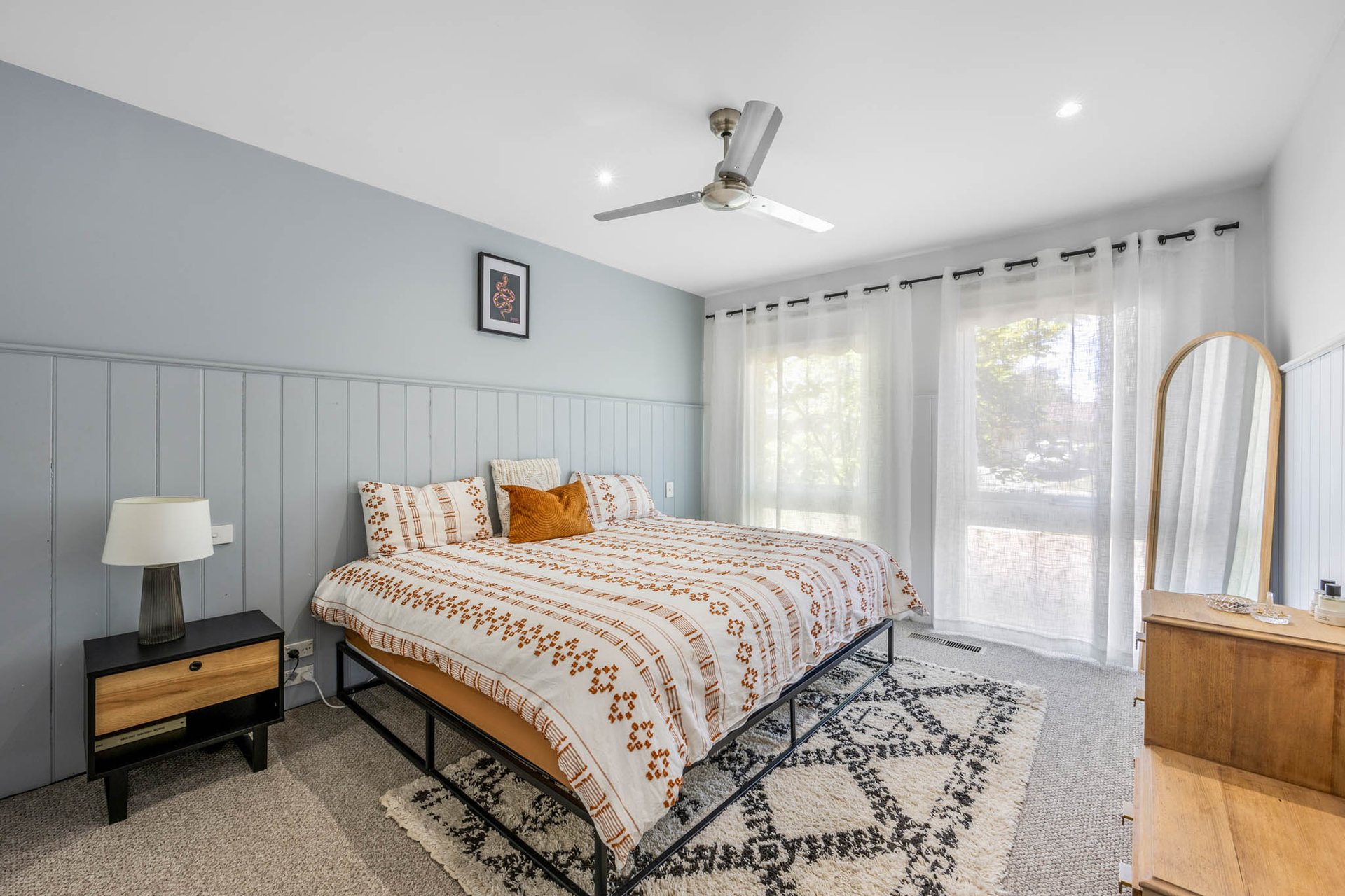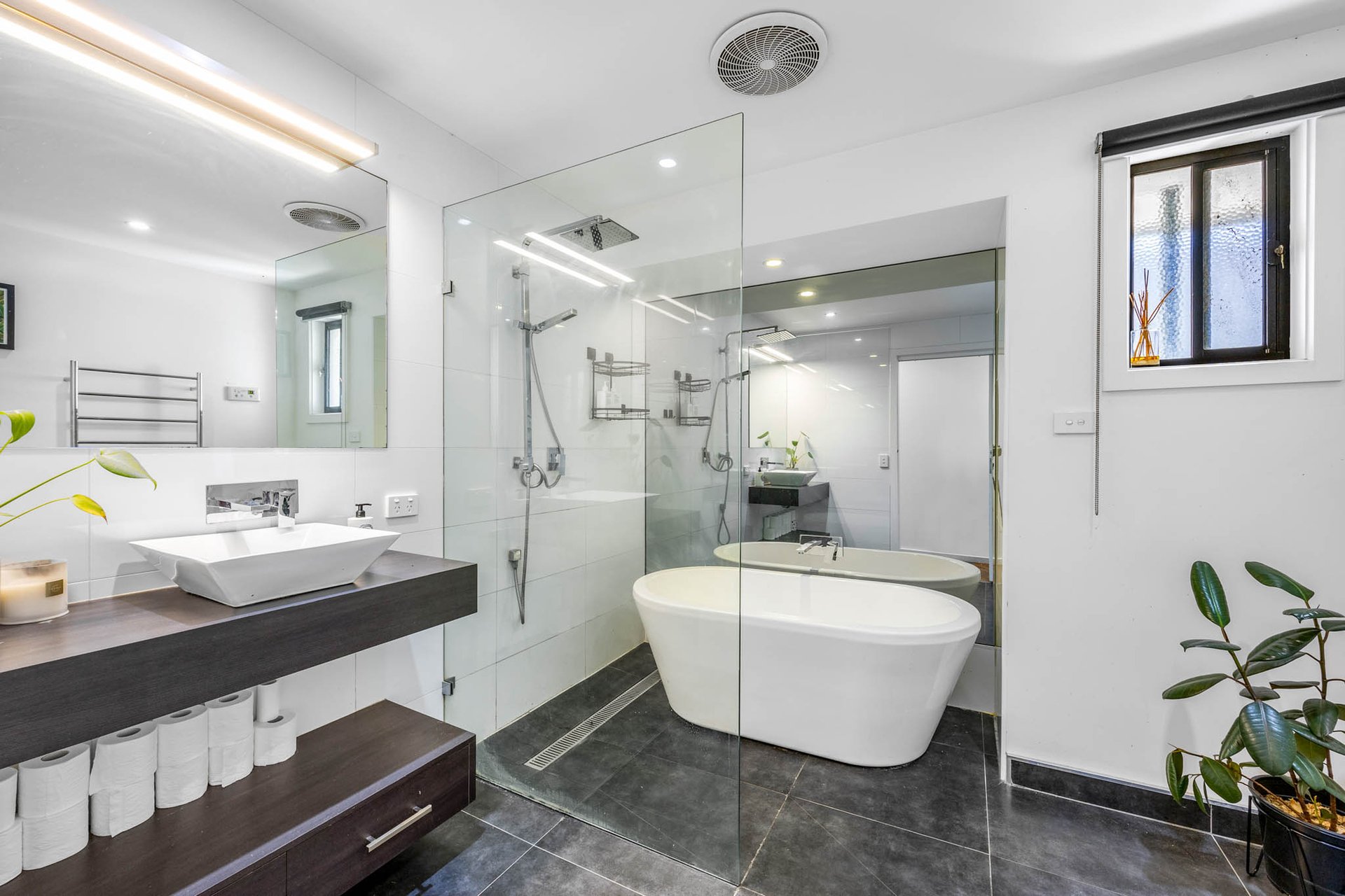Accommodation comprises four bedrooms, including a main suite with a walk-in robe and shower ensuite. The remaining three bedrooms are served by a lavish updated bathroom showcasing 600mm charcoal floor tiles, a frameless walk-in shower and bath, a heated towel rail, and panel heating.