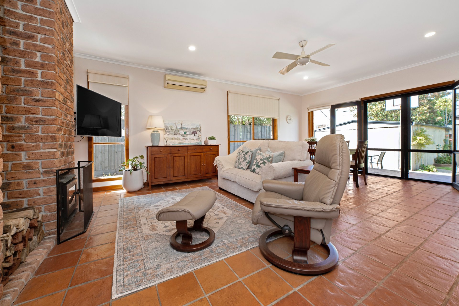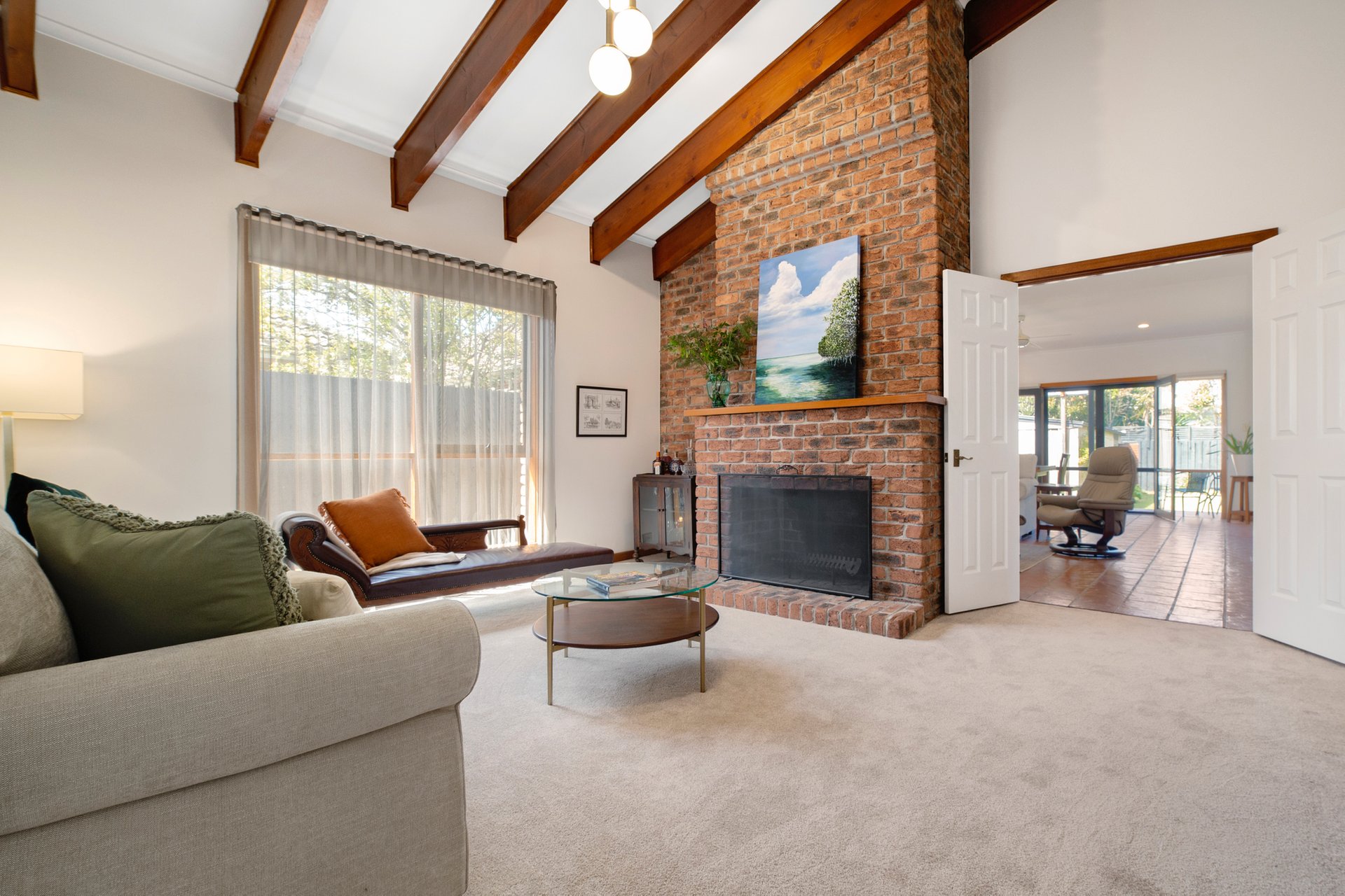 Updated with plush new carpet and crisp fresh paint, the interiors are crowned by lofty 9ft ceilings which rise up even further over the formal lounge where exposed rafters and rich brick add warmth and appeal. An open fireplace here and in the family dining zone offer inviting winter focal points whilst outside the alfresco patio looks across a good-sized established garden.