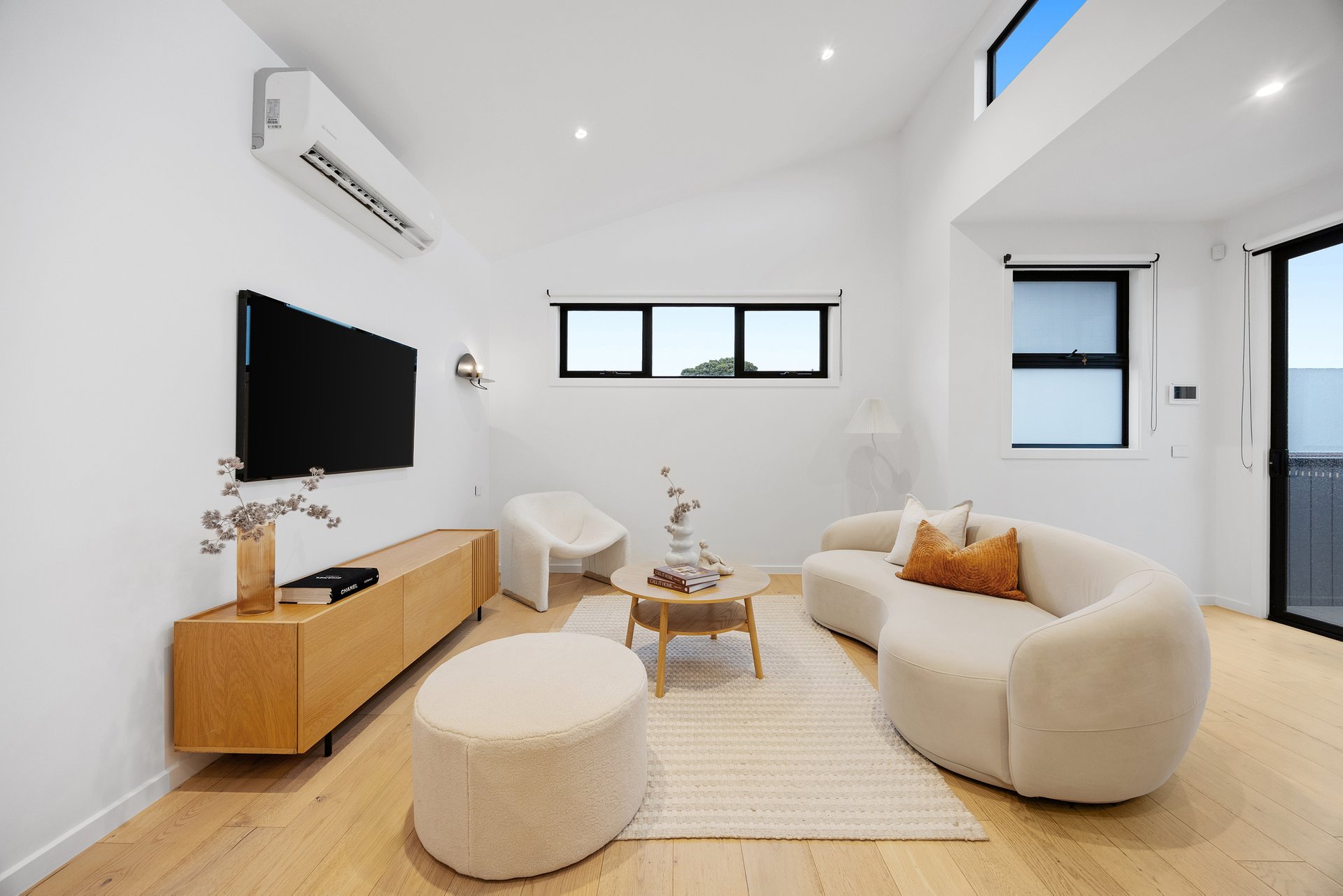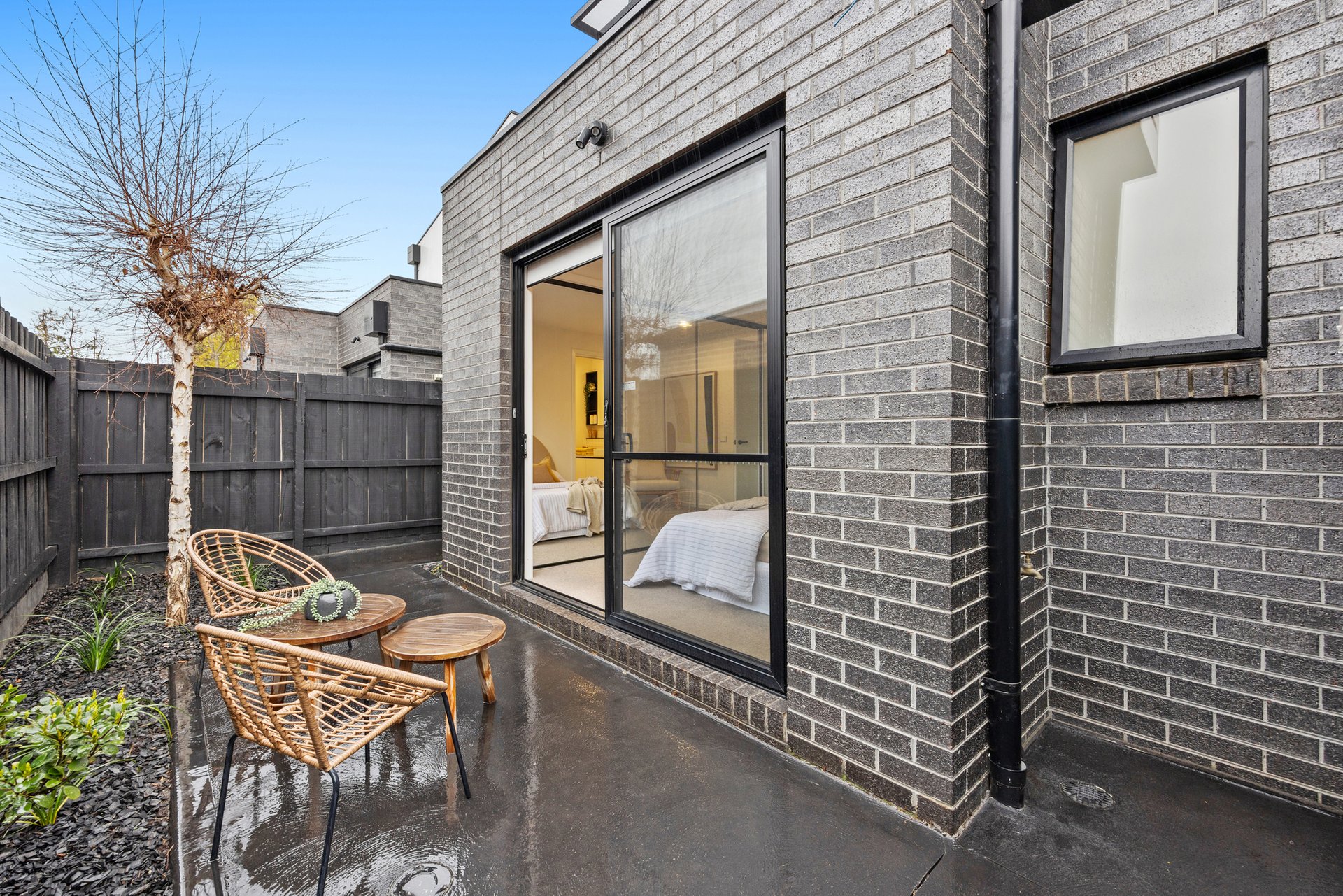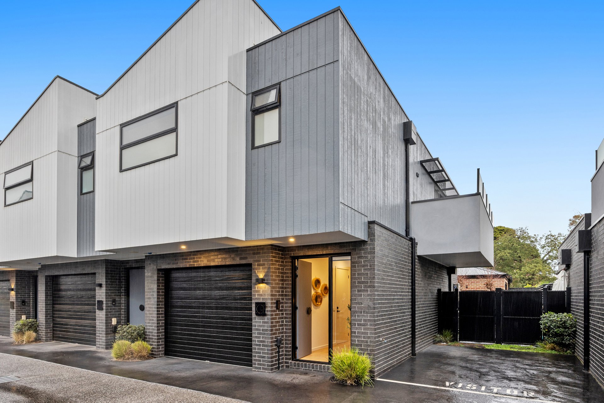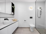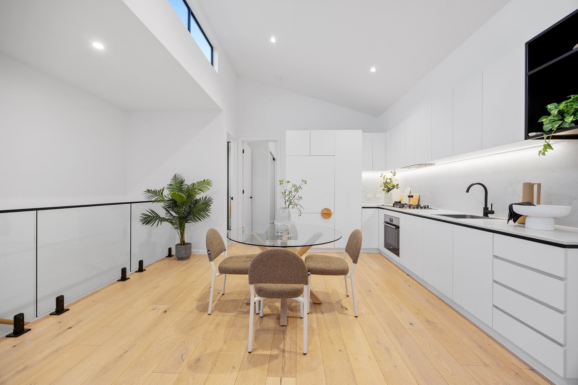 The master suite, privately positioned on the ground floor, boasts built-in robes, a modern ensuite, and direct access to a serene courtyard. Upstairs, the light-filled open-plan living, dining, and kitchen space impresses with soaring raked ceilings and a seamless connection to the balcony - ideal for relaxing or entertaining.