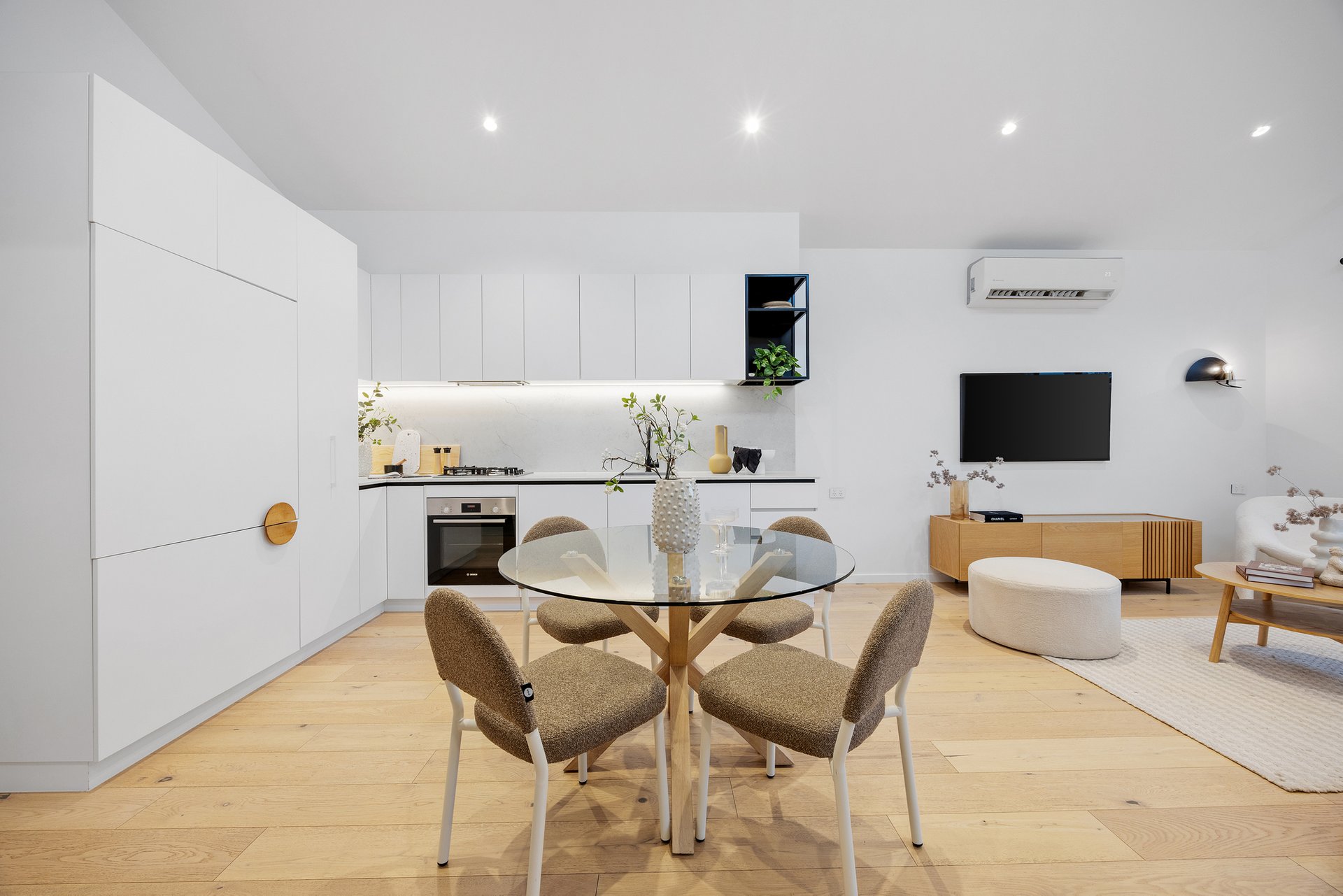 The sleek kitchen is appointed with premium appliances, including a fully integrated Fisher & Paykel fridge/freezer, Bosch electric oven, gas cooktop, and dishwasher. Stone benchtops and splash backs, ambient under-cabinet lighting, and sleek white cabinetry with ample storage combine functionality with refined style.