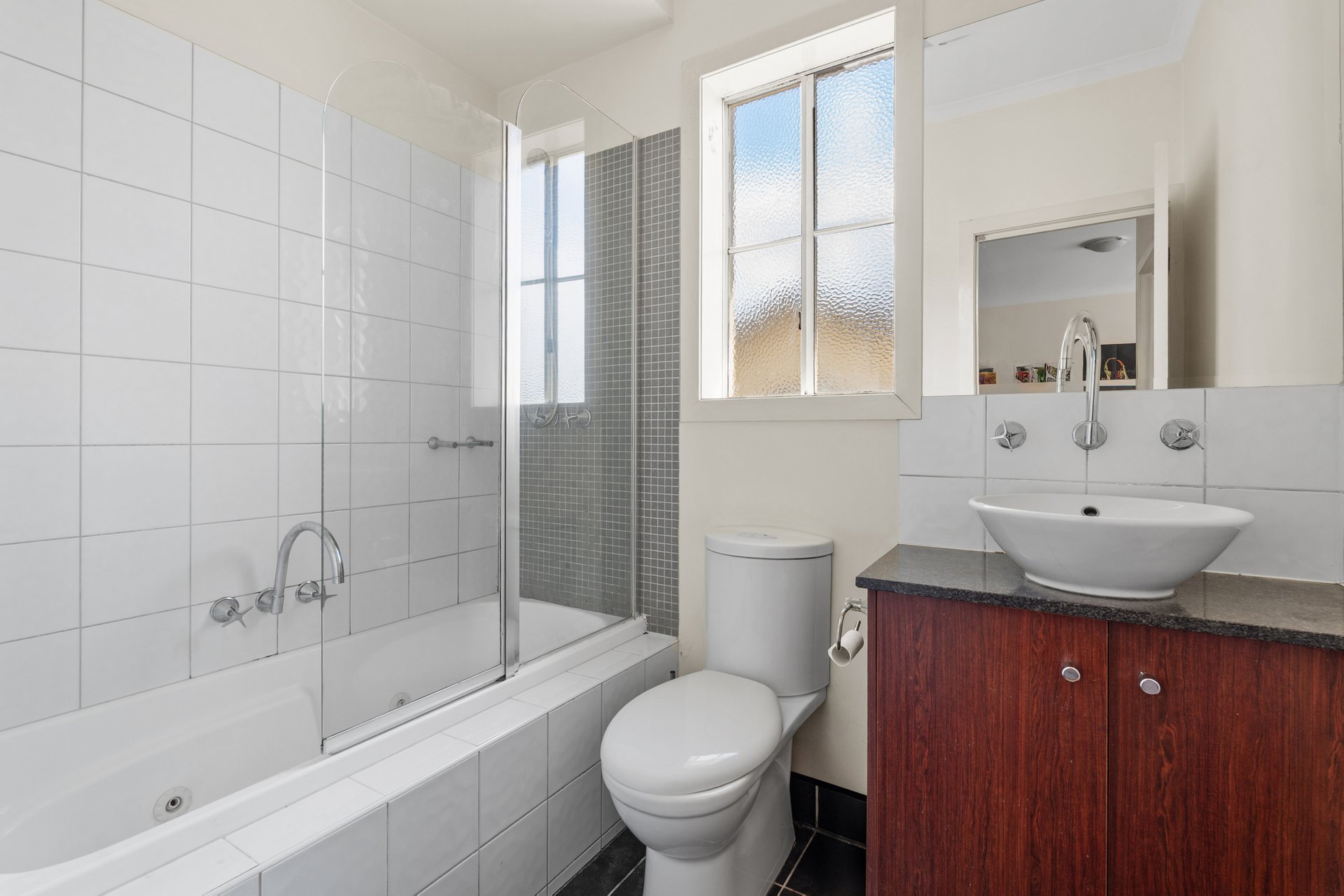 The bathroom includes a modern vanity with a bathtub-shower hybrid, and tiled flooring for a fresh, modern appeal. An inbuilt laundry area neatly tucked behind sliding doors adds everyday convenience.
