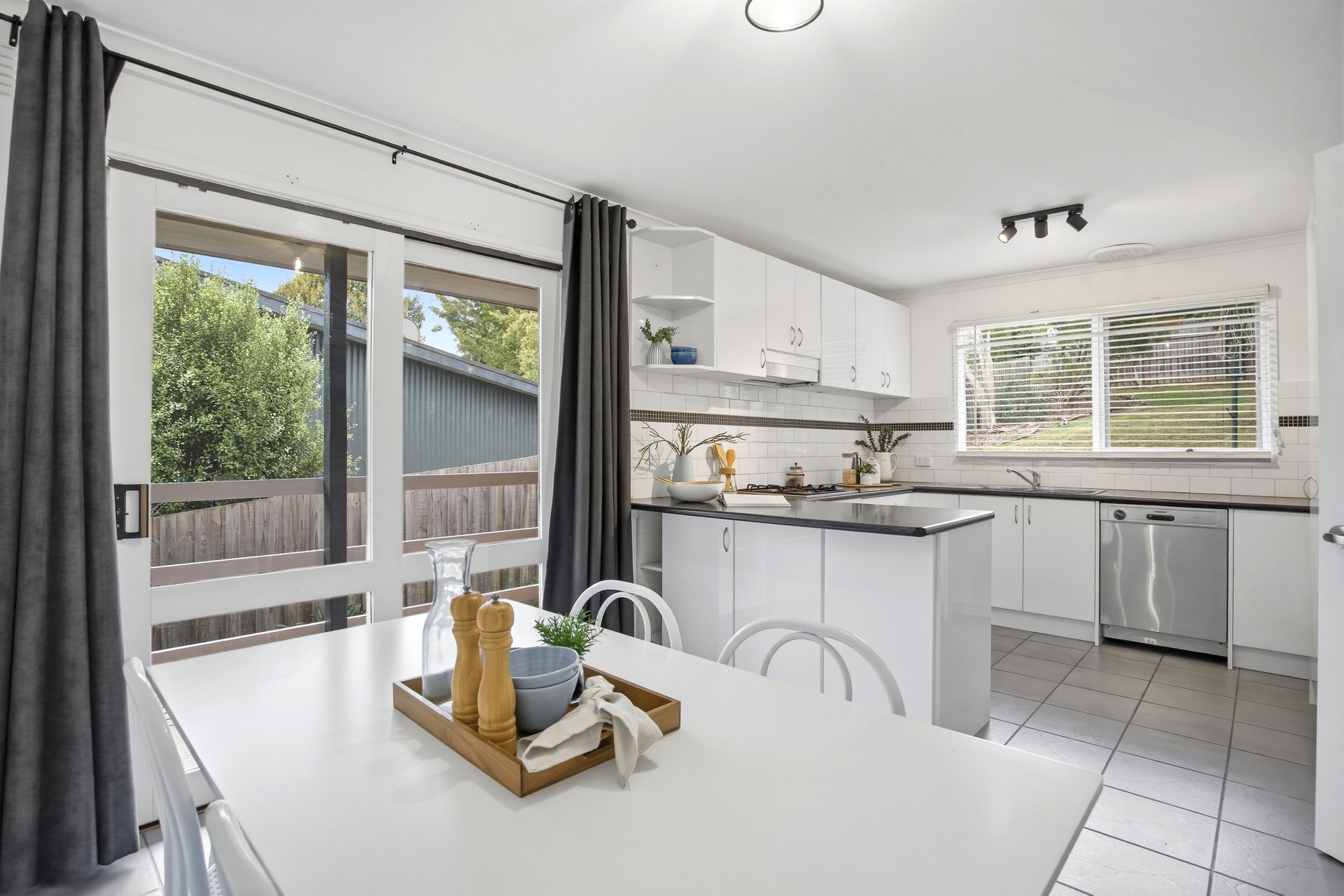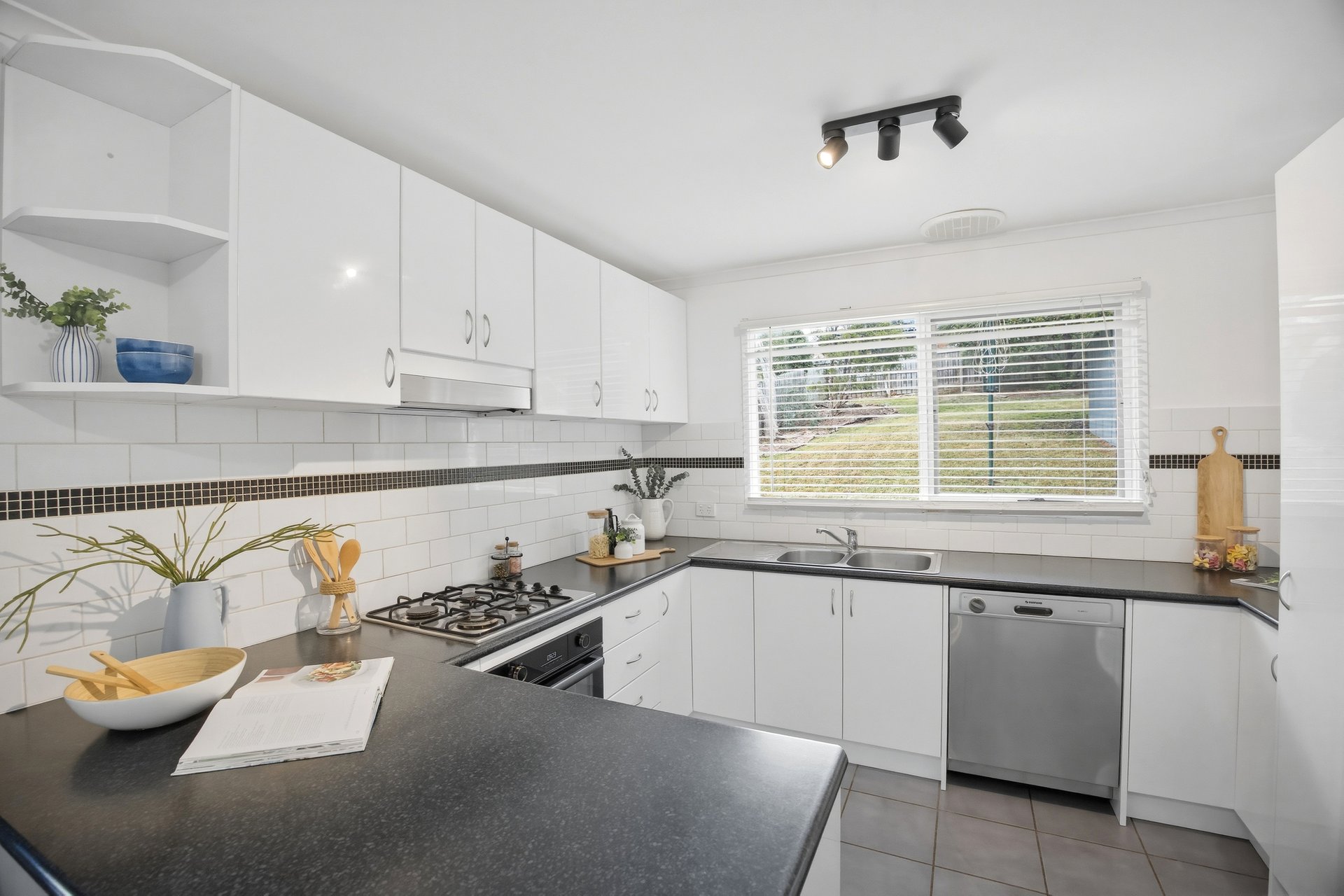 The kitchen features an abundance of bench and cupboard space, complimented by glossy white cabinetry, large pantry, stainless steel appliances including gas cook top, electric oven and dishwasher.