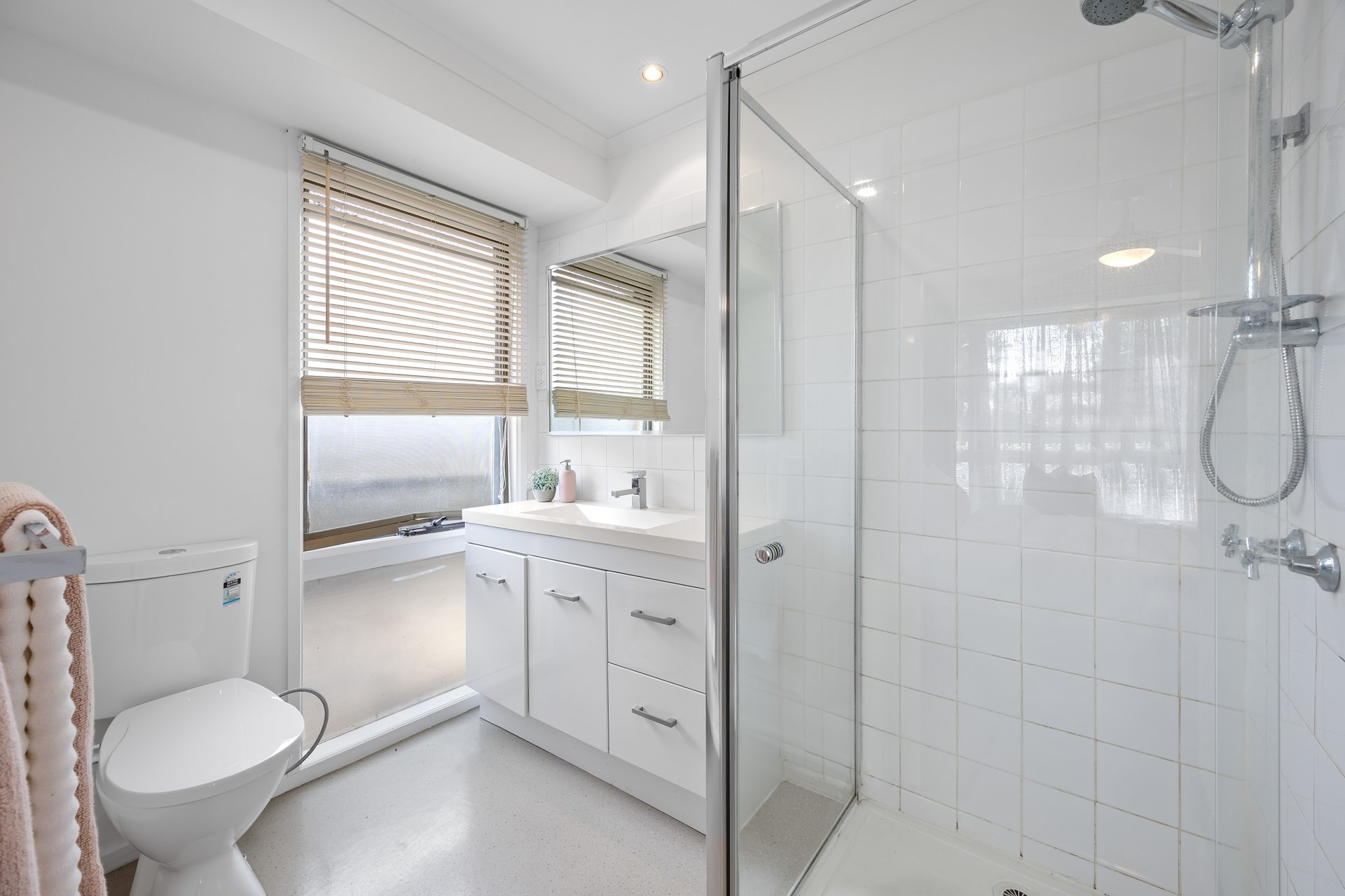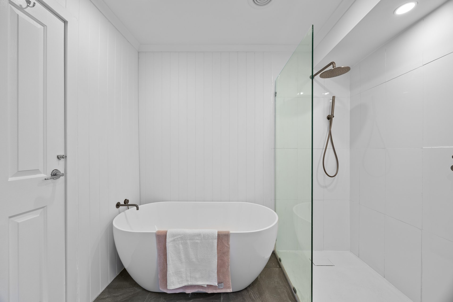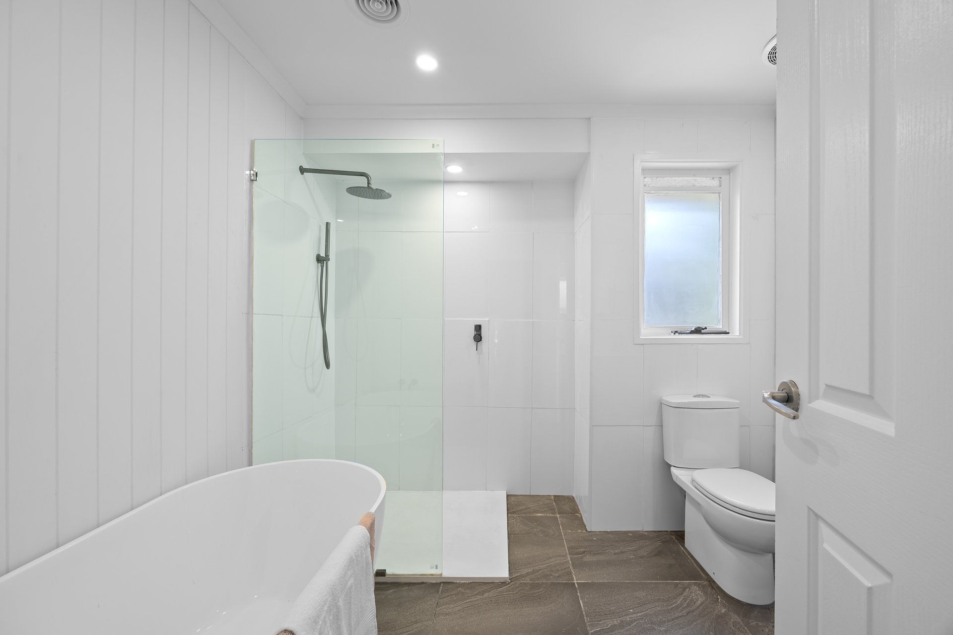- Updated central bathroom with slate-toned tiles, frameless shower, deep bathtub & heated towel rail
