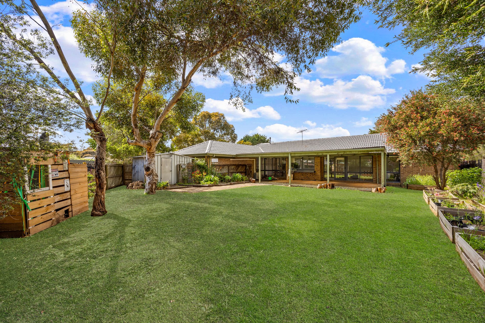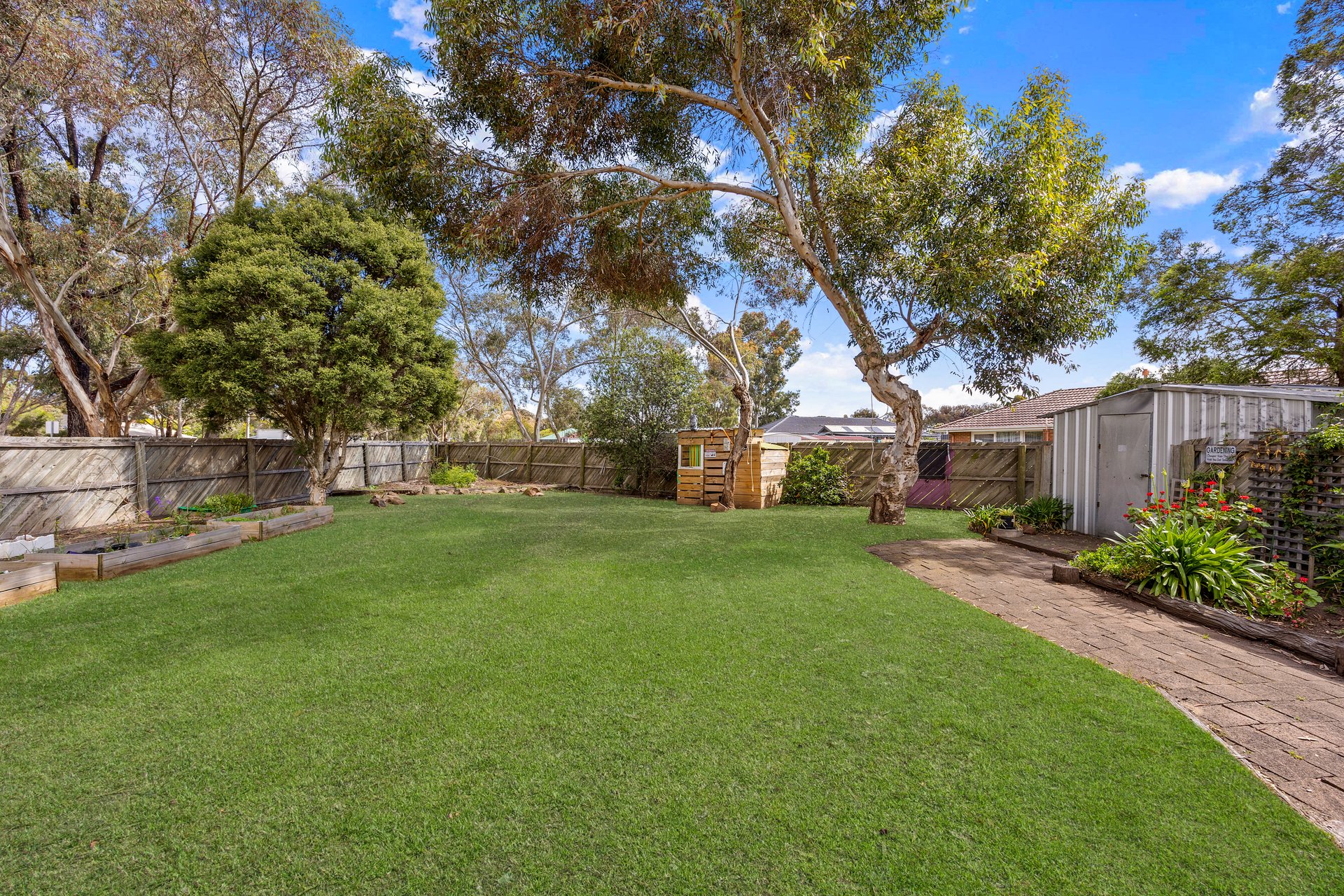- Flat lawn, established greenery & fun cubby house fort