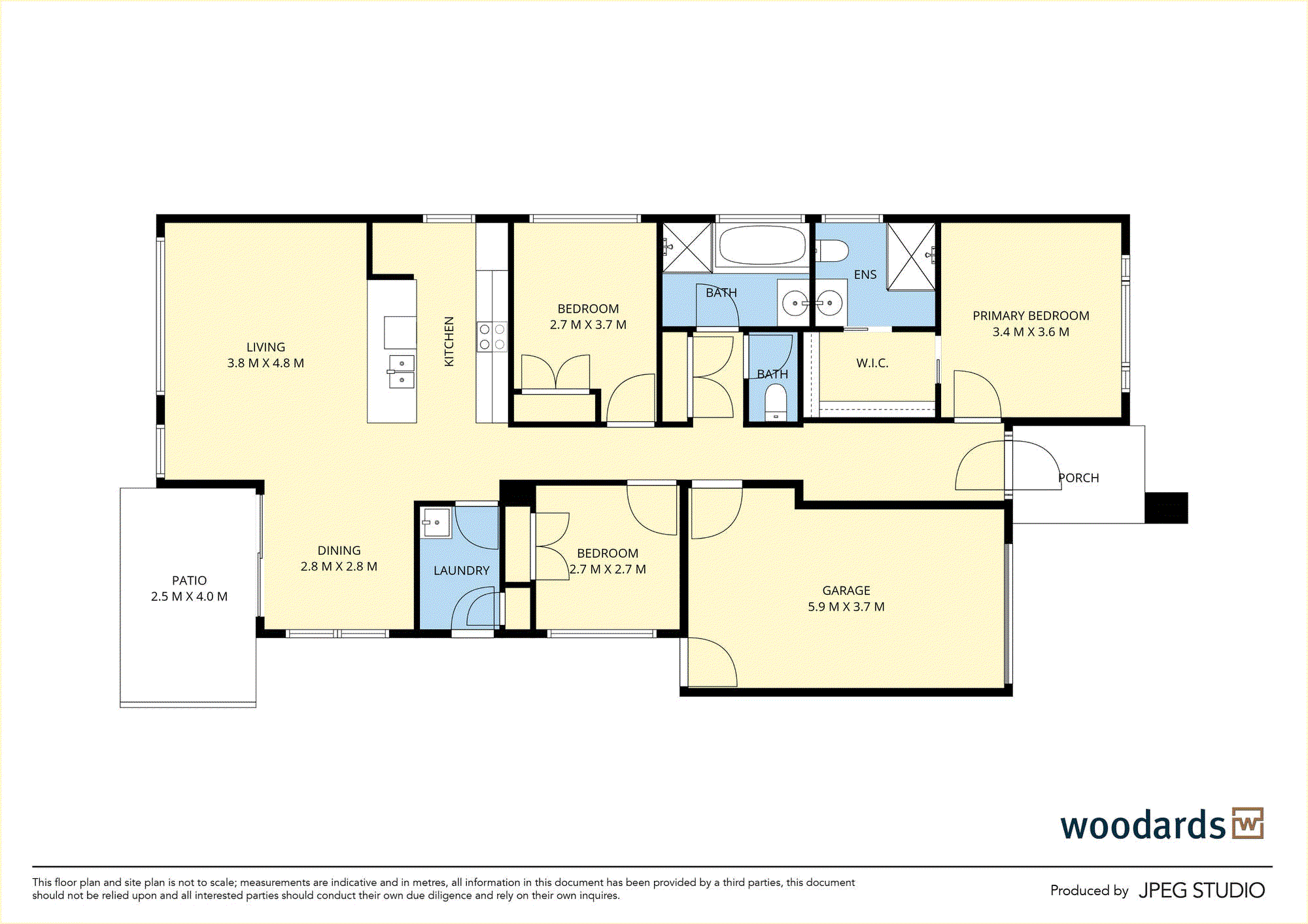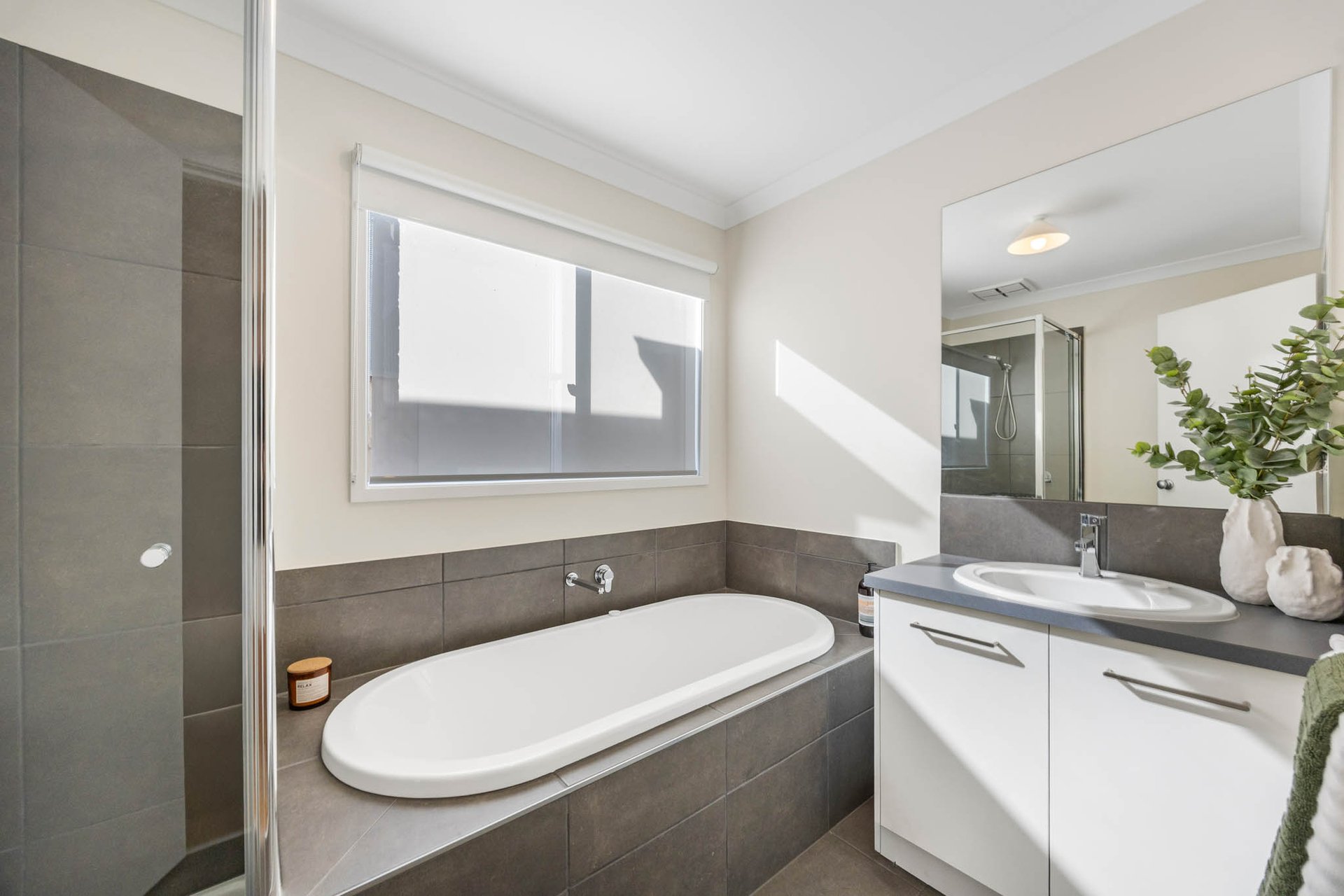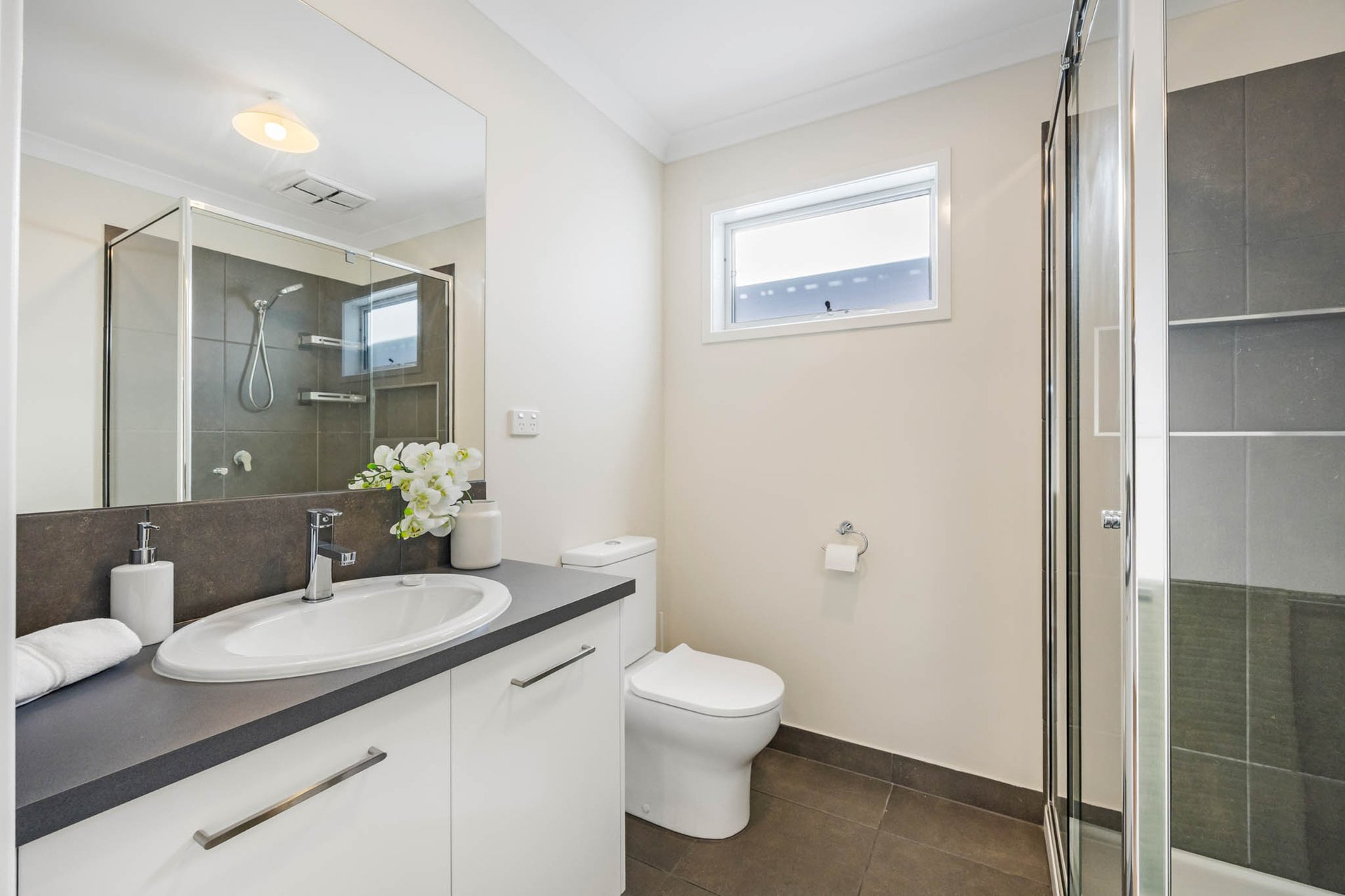 Accommodation comprises 3 bedrooms and 2 bathrooms with the primary bedroom featuring a walk-in closet and a sleek ensuite with a niched shower. Two additional bedrooms with built-in robes are paired with a stylish central bathroom offering a bath and separate shower.