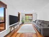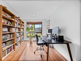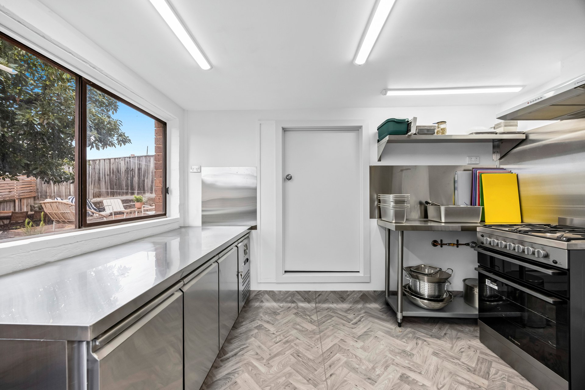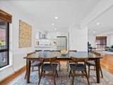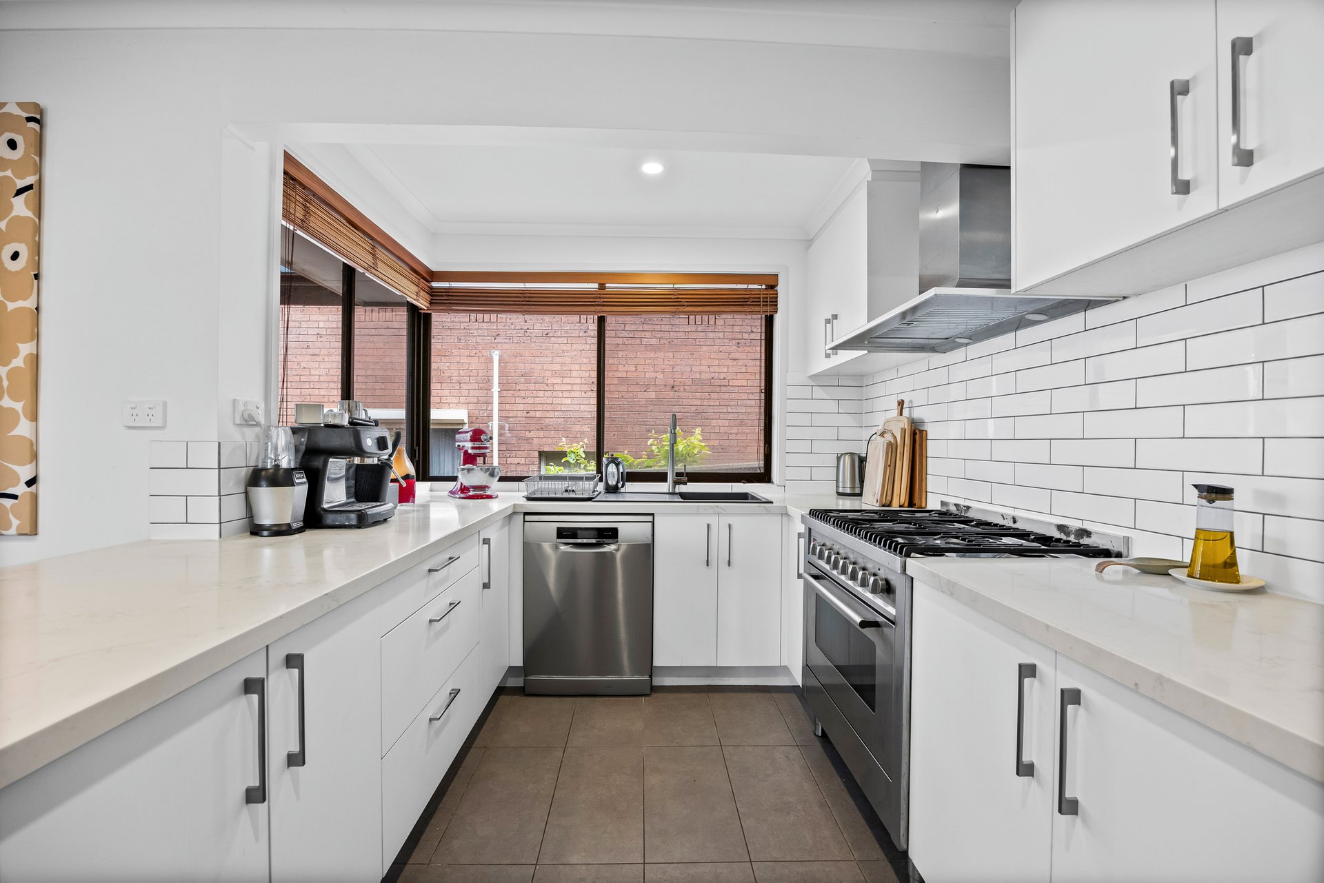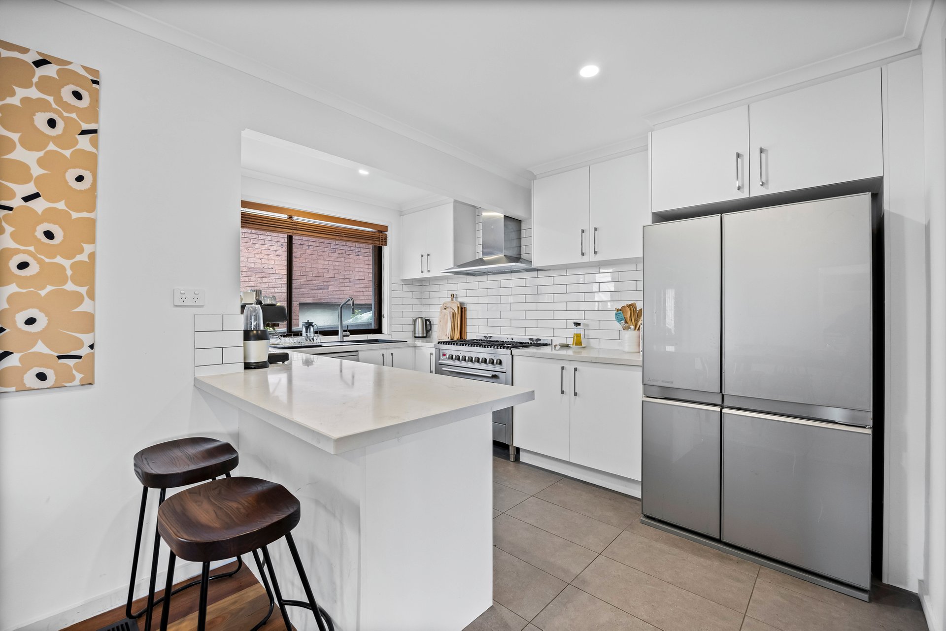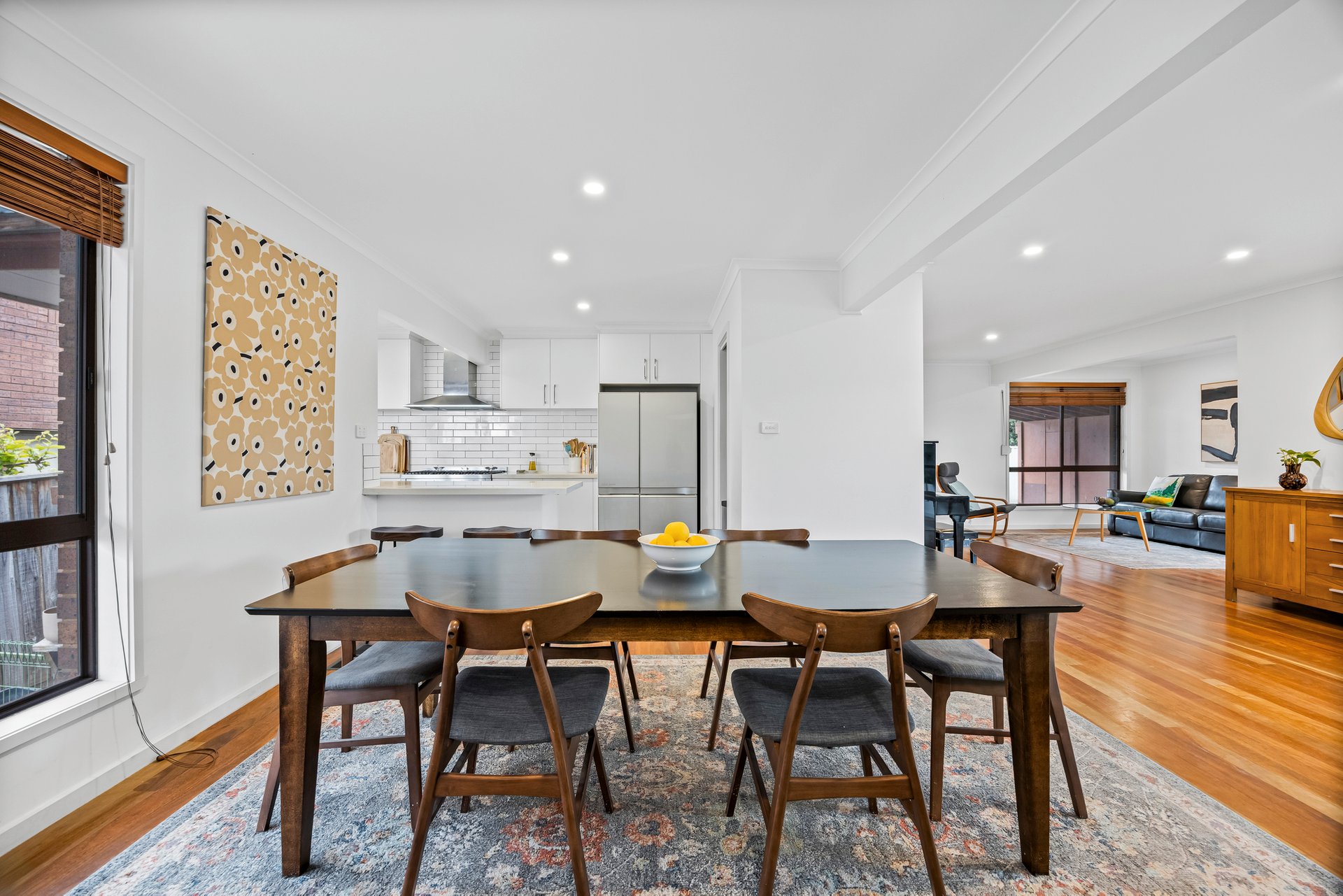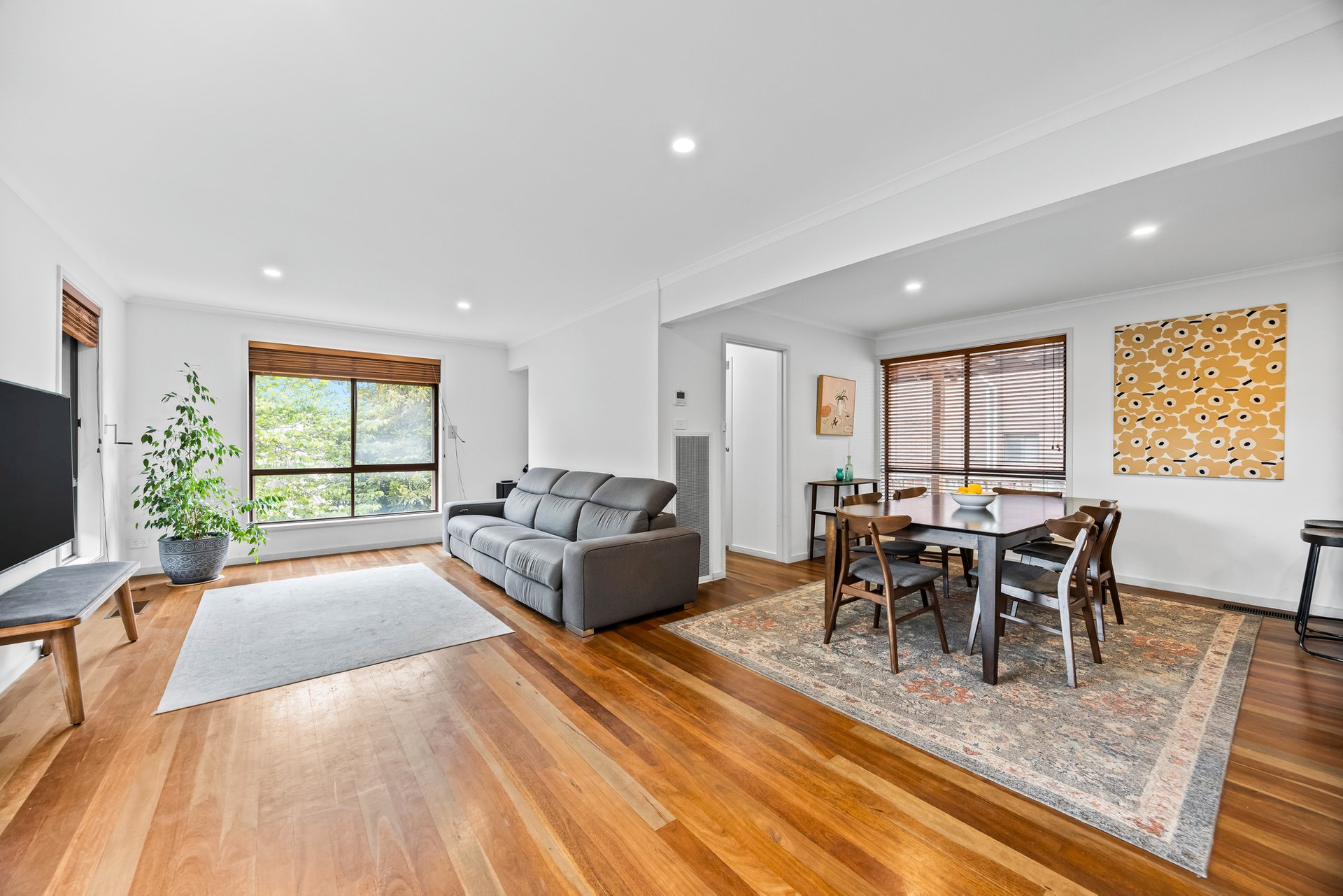 At the heart of the home, a sophisticated kitchen combines everyday function with contemporary style, featuring Kinsman cabinetry, composite stone benchtops, a freestanding gas stove with electric oven, Bosch dishwasher and generous walk-in pantry. The adjoining living and dining space extends effortlessly to a covered deck and balcony, an inviting setting for family gatherings, relaxed entertaining or quiet mornings overlooking the garden.