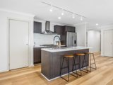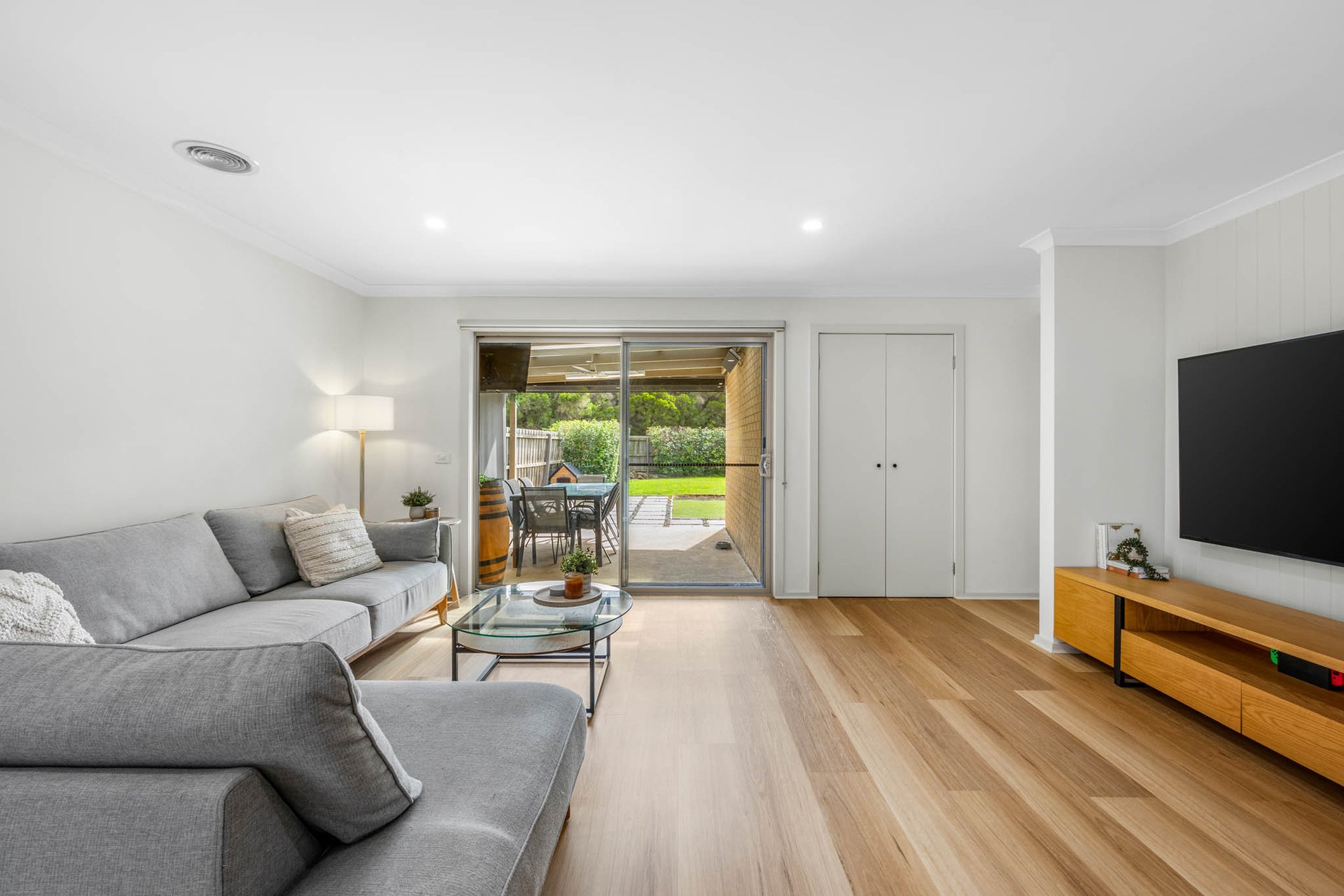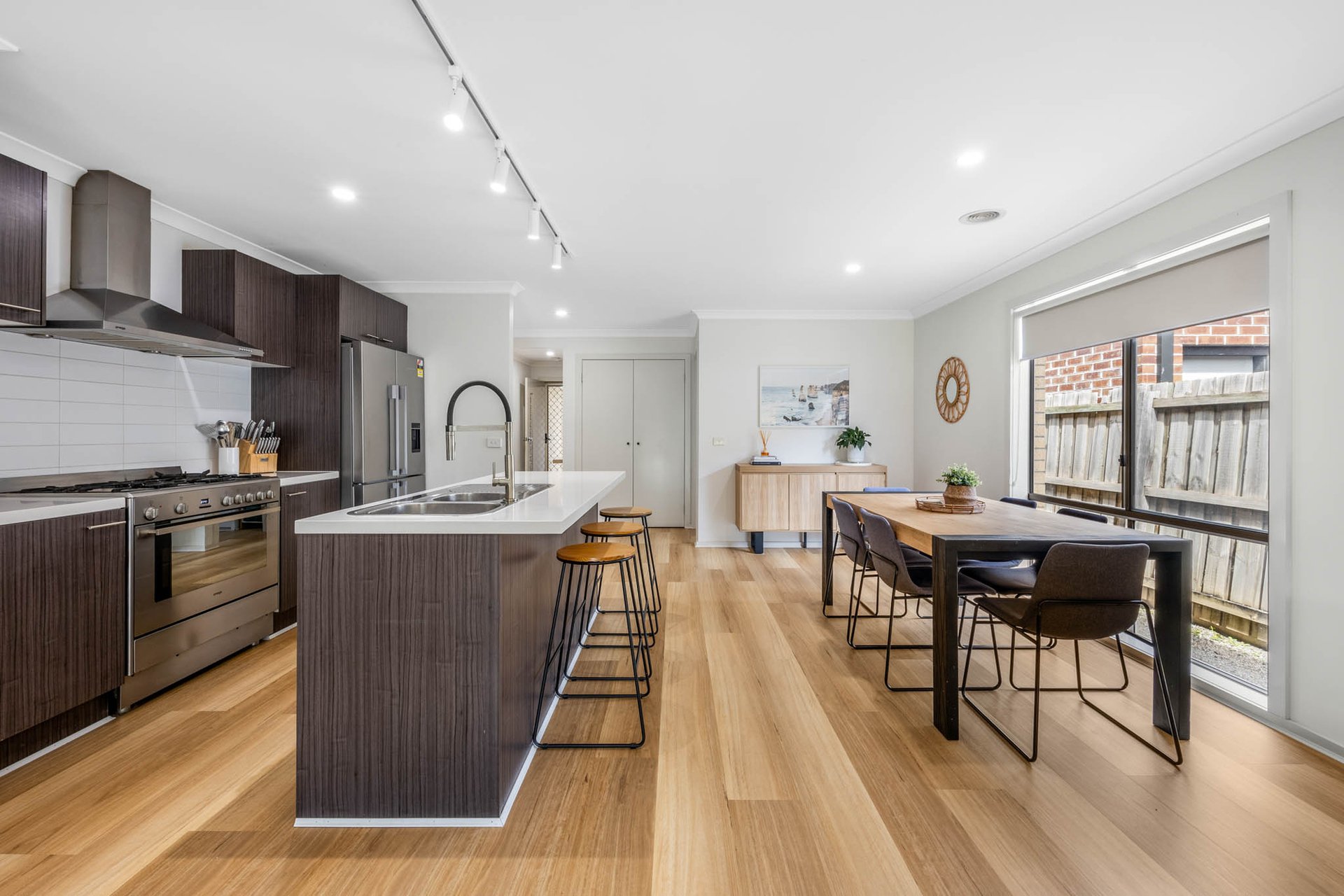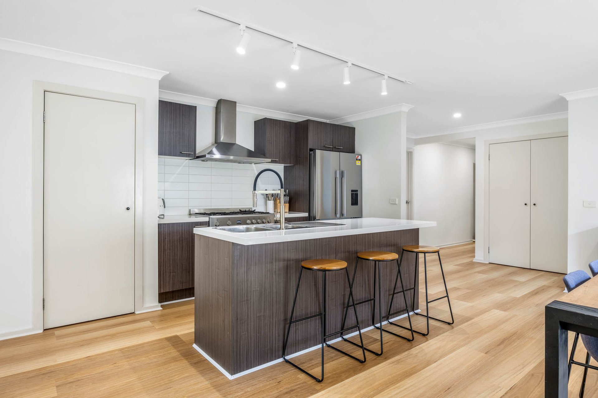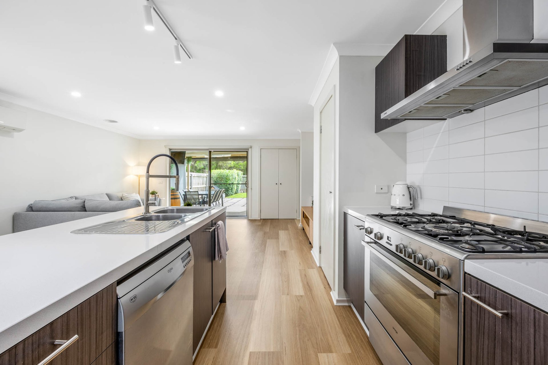 Showcasing smart wide-plank flooring, the home offers a comfortable lounge preceding a central hub showcasing a stunning kitchen featuring white stone benchtops, neutral-toned cabinetry, a 900mm upright oven and a stainless-steel dishwasher, with excellent bench space for easy meal prep.
