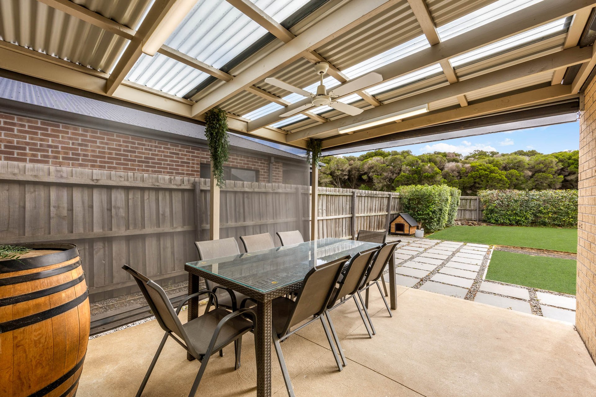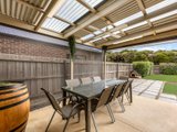 Adjoining dining and living zones effortlessly flow to a covered outdoor entertaining area fitted with an exterior fan and shade blinds. The large rear yard offers plenty of room for kids to play, combining paved zones with both grassed and astro-turfed lawns, while mature perimeter hedges provide extra greenery and privacy.