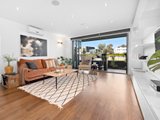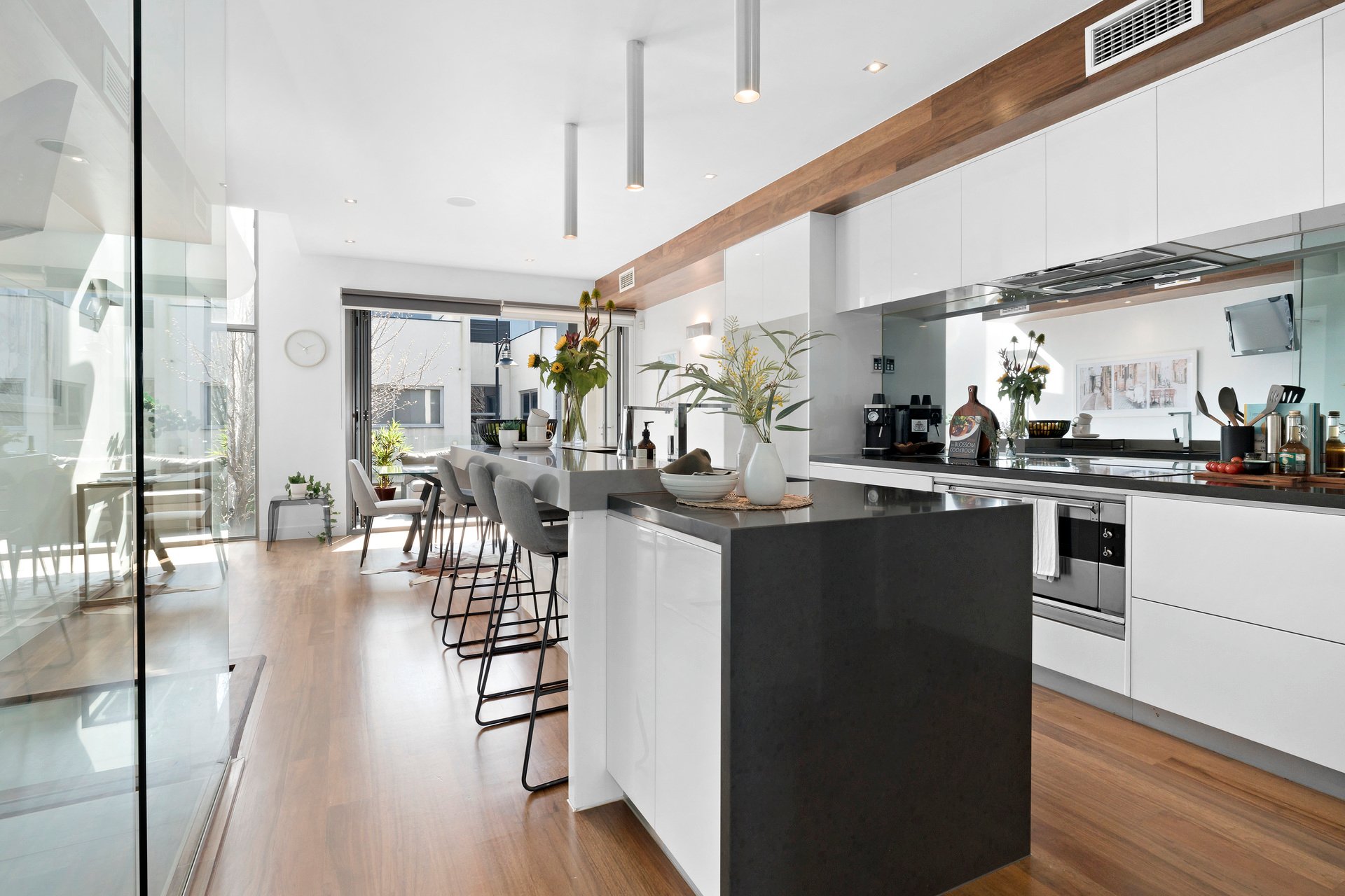 Above, living and dining areas each featuring balcony expanses are arranged either side of a stunning contemporary kitchen with stone surfaces, high-end appliances, Blum servo-drive and kicker vacuum.