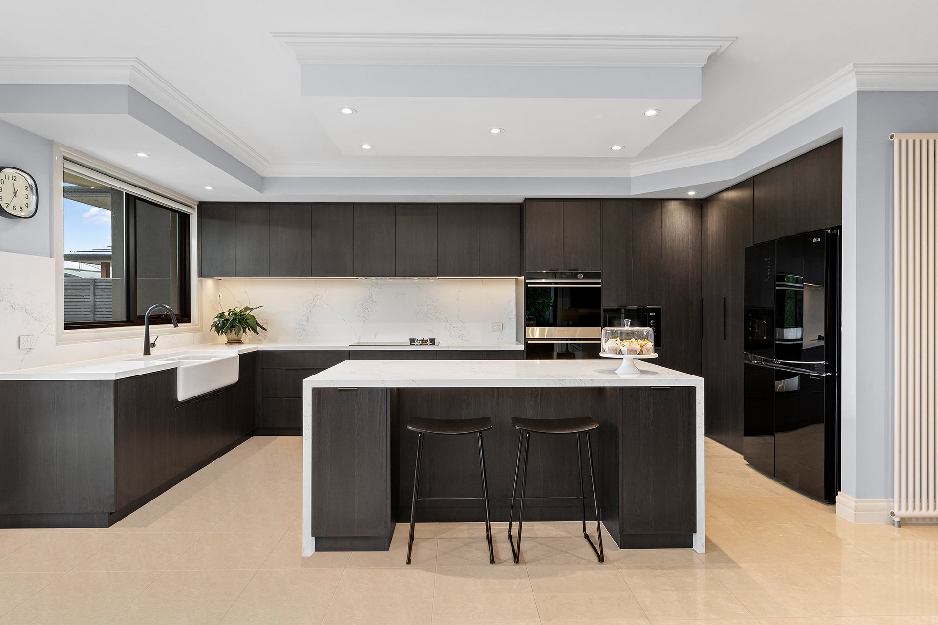 - Chef's kitchen with dual ovens, induction cook-top, ceramic double sink, stone benches, integrated dish-washer and micro wave