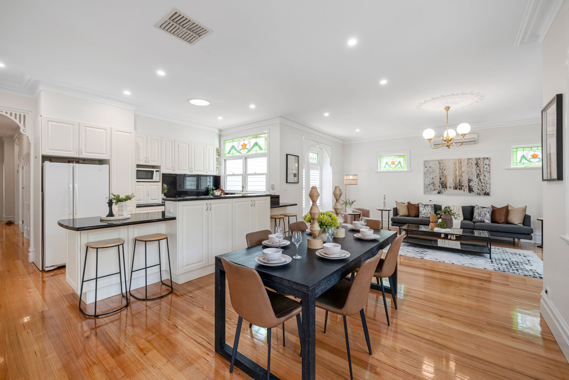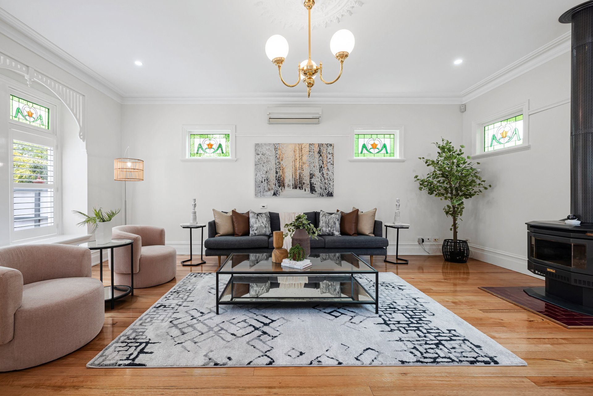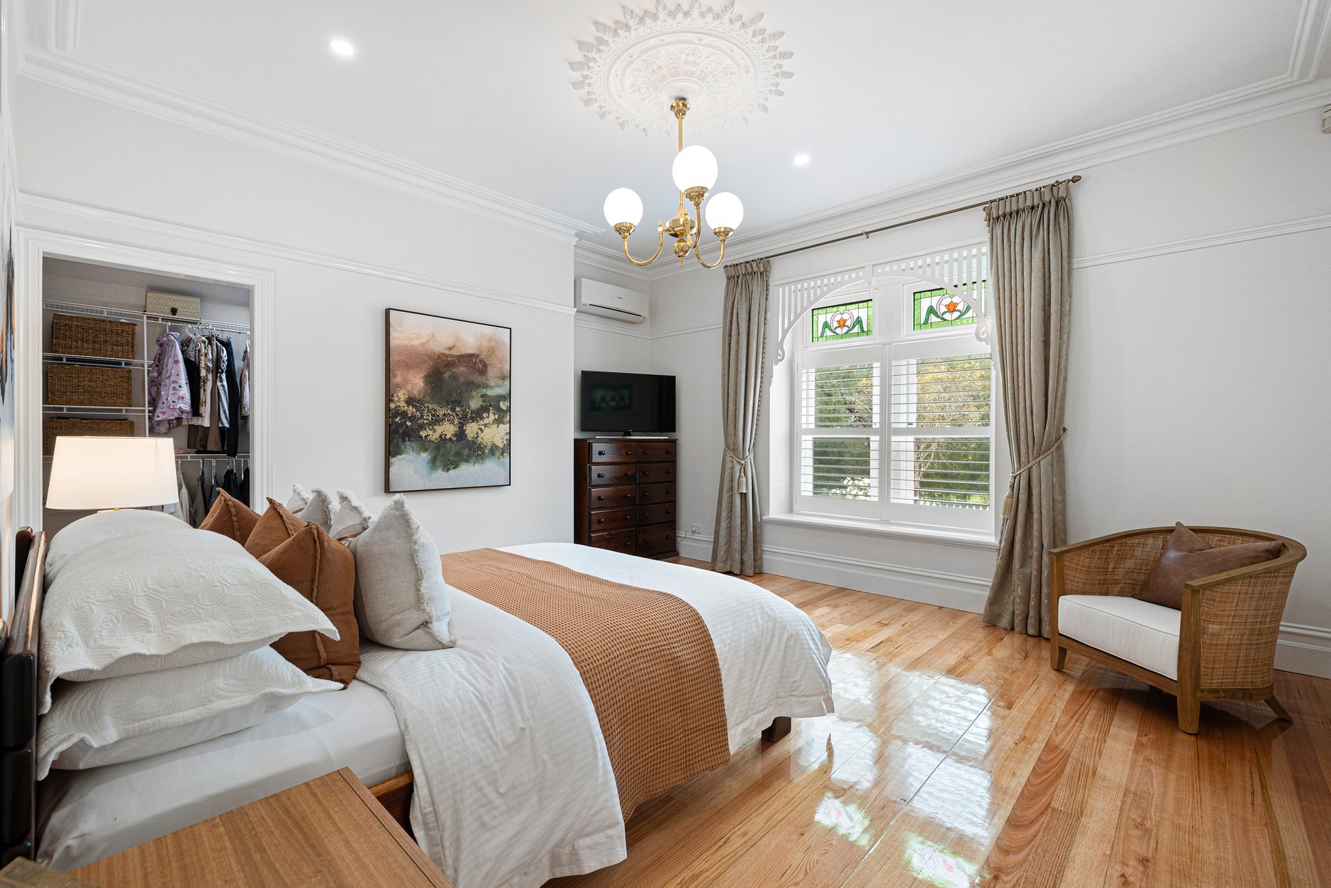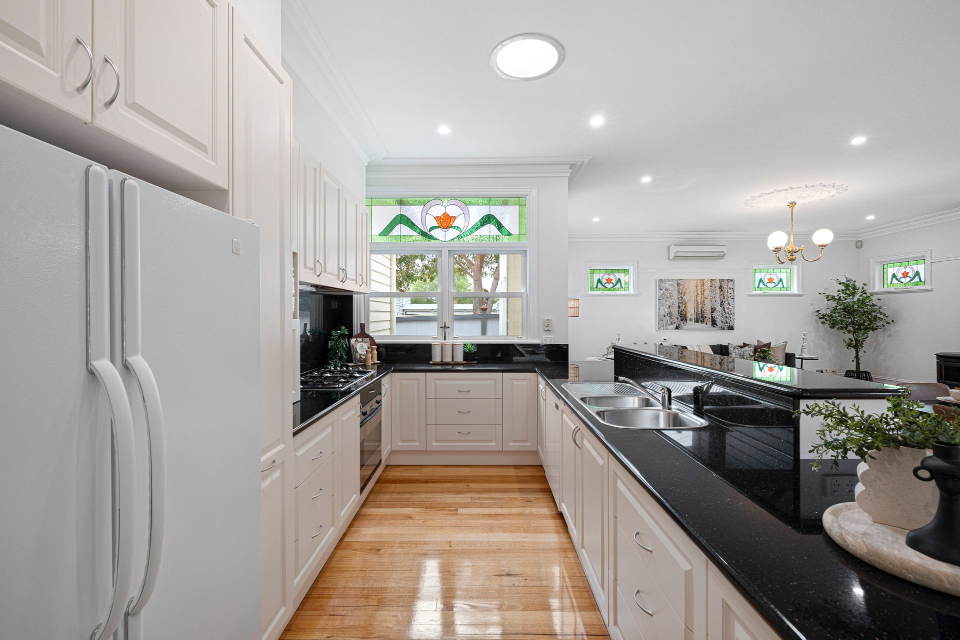 Across the shaded return verandah, the interiors are crowned by soaring ceilings, while polished hardwood floors flow seamlessly under foot. Introduced by an elegant entrance hall, there is a choice of formal living areas including the generous garden-view lounge with a heritage inspired electric fireplace. Families will be drawn to the open plan entertaining zone where there is room to relax and dine warmed by a cosy wood-burner fire. A granite kitchen appointed with European appliances will inspire hosts, while an enclosed spa room and alfresco deck overlooking the mod-grass garden give options of where to unwind.