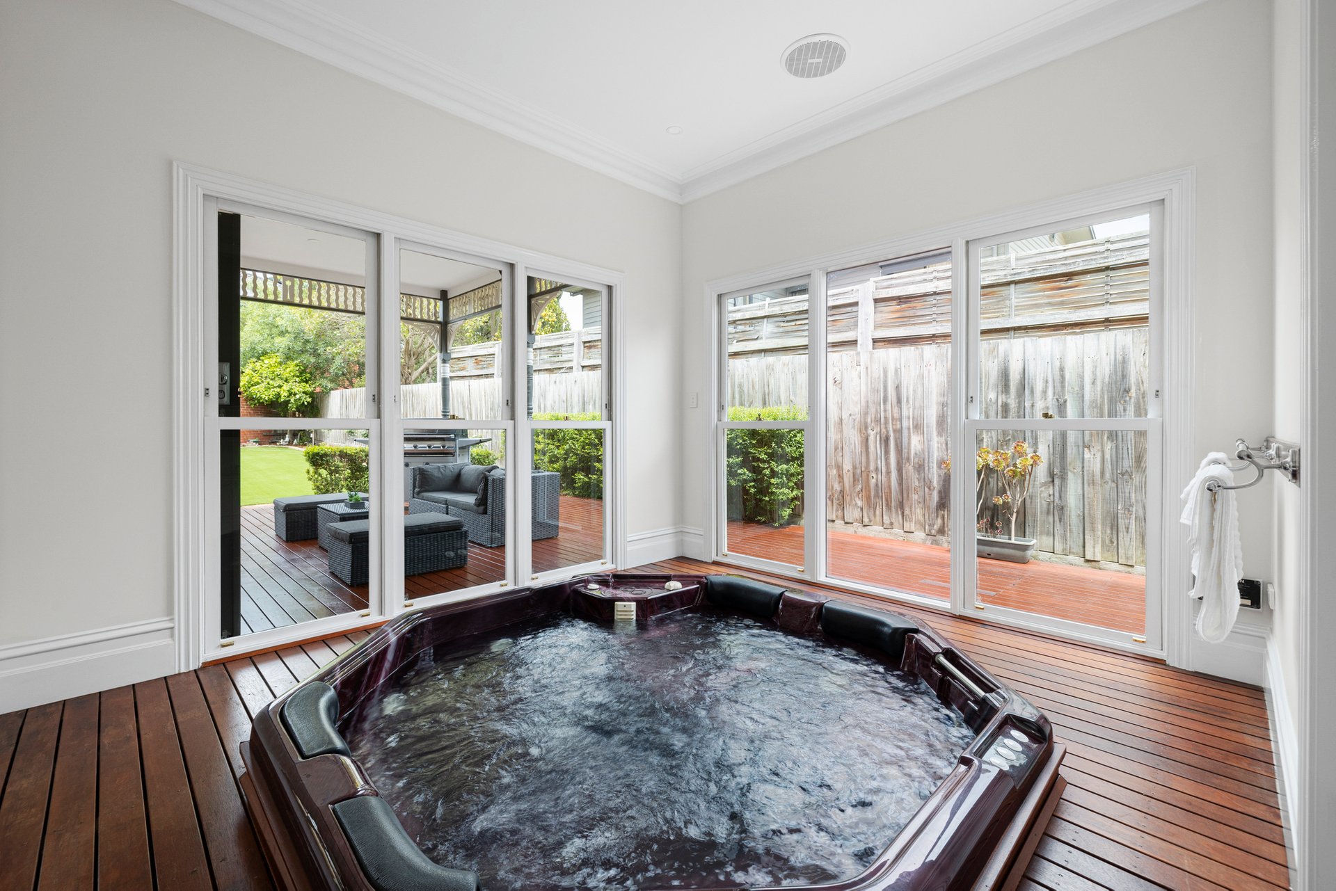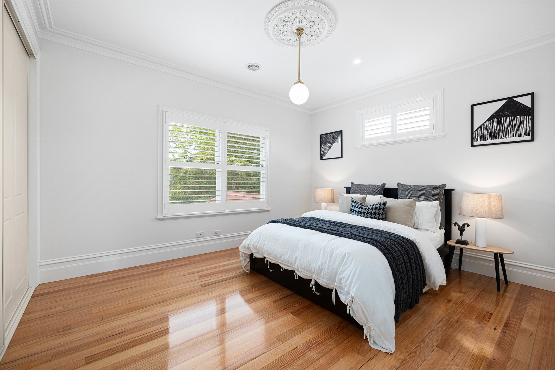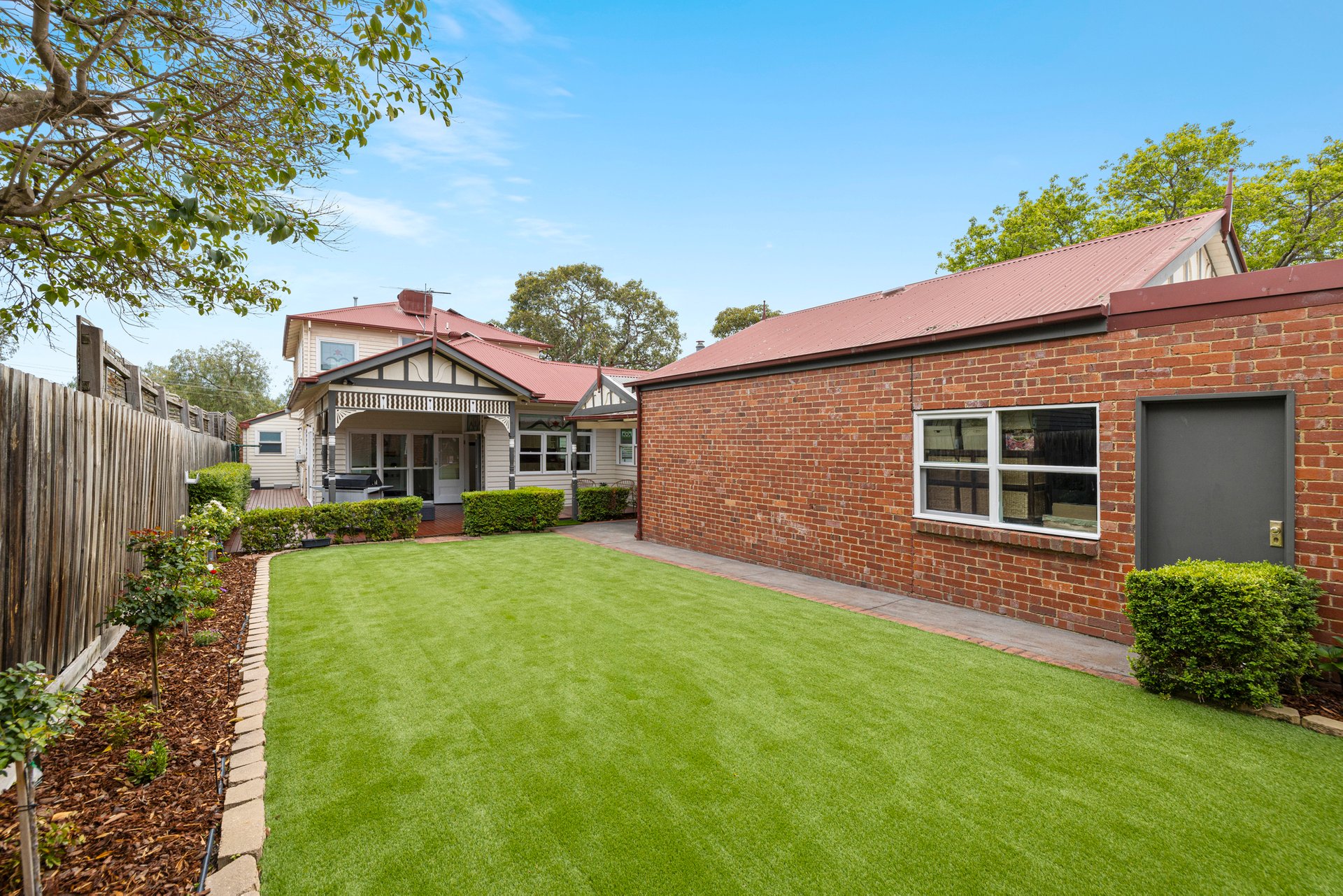 Across the shaded return verandah, the interiors are crowned by soaring ceilings, while polished hardwood floors flow seamlessly under foot. Introduced by an elegant entrance hall, there is a choice of formal living areas including the generous garden-view lounge with a heritage inspired electric fireplace. Families will be drawn to the open plan entertaining zone where there is room to relax and dine warmed by a cosy wood-burner fire. A granite kitchen appointed with European appliances will inspire hosts, while an enclosed spa room and alfresco deck overlooking the mod-grass garden give options of where to unwind.
