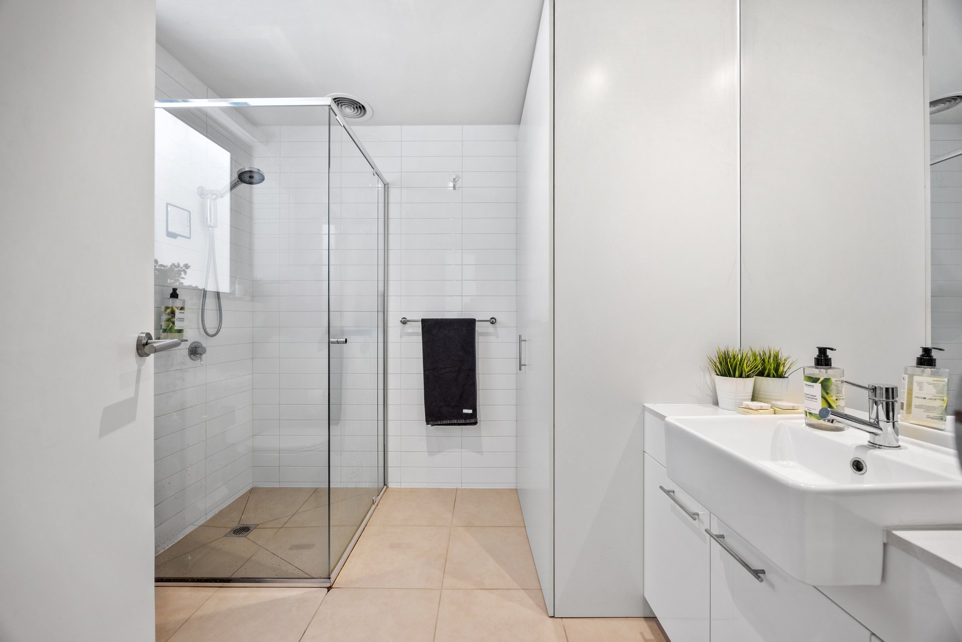 The spacious bedroom is carpeted and includes built-in robes, also benefiting from an abundance of natural light. The sleek bathroom is floor-to-ceiling tiled, featuring a stone vanity top, a single vanity, and a European laundry for added convenience. The apartment includes one car space and a storage cage, adding to the practicality of this inner-city home.