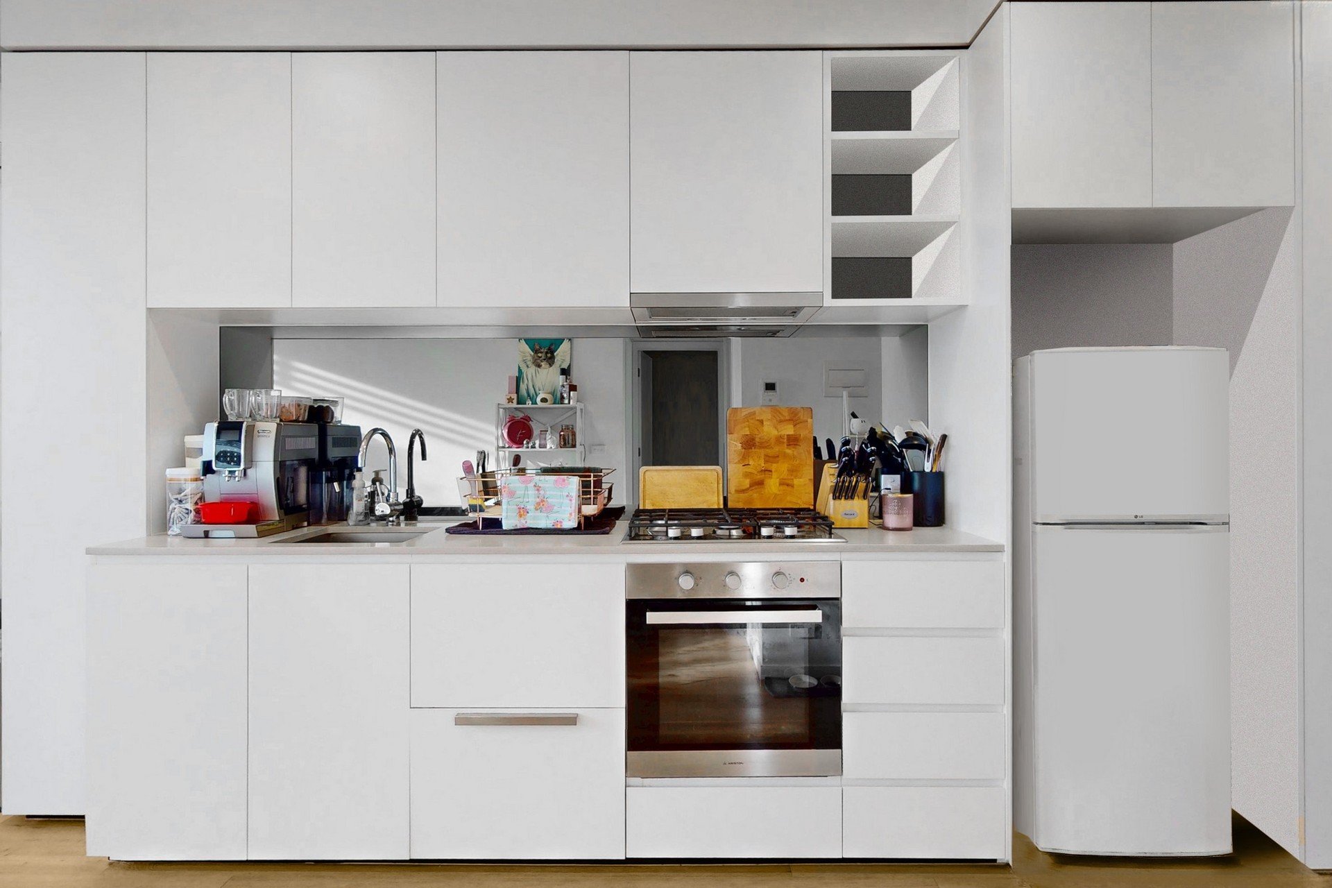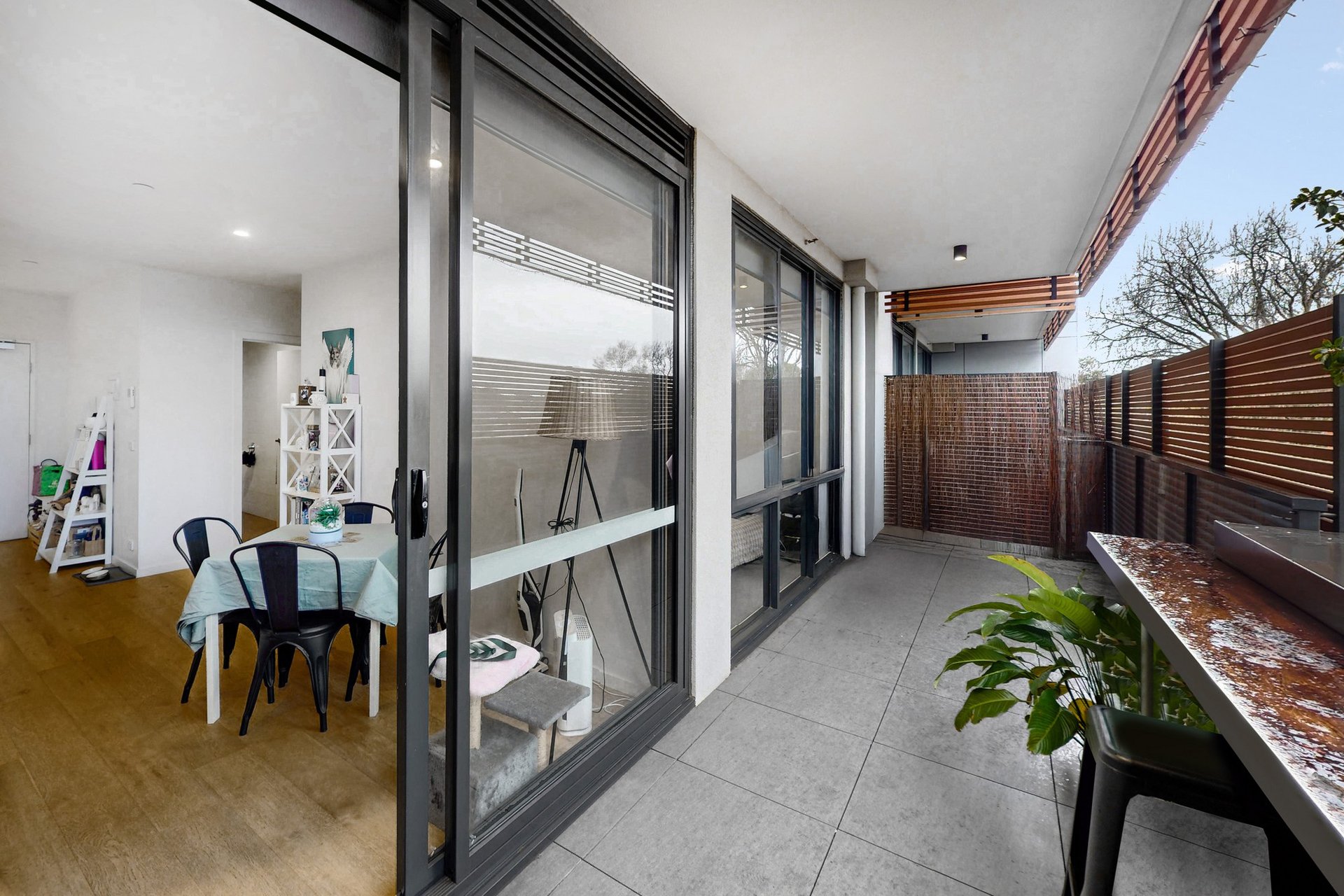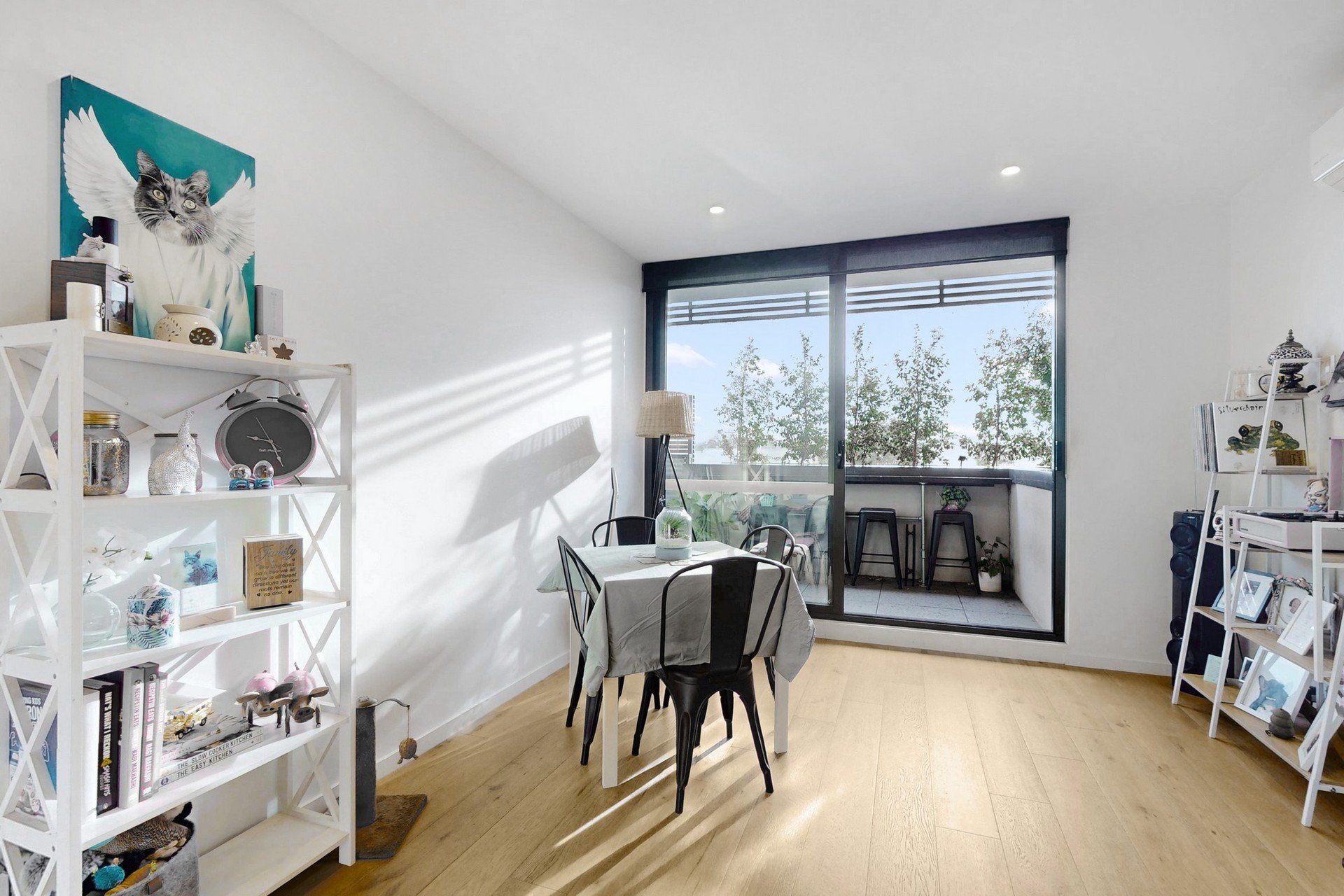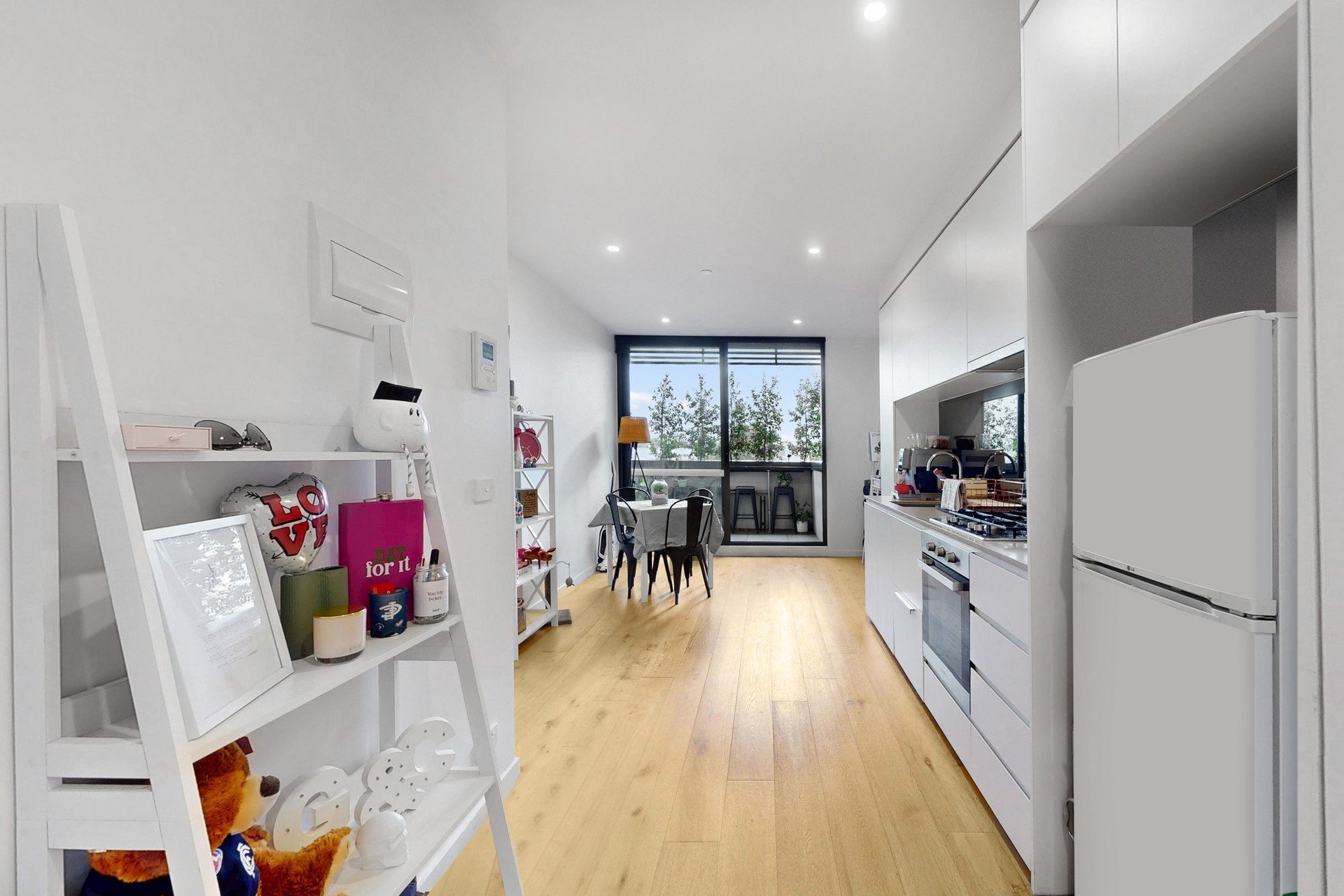 Step inside to discover a light-filled open-plan living and dining area that seamlessly connects with a contemporary kitchen, complete with stainless steel appliances, gas cooktop, mirrored splashback and ample cabinetry. The generous living space extends to a large private balcony, offering an inviting setting for alfresco dining, quiet mornings or entertaining with leafy outlooks and privacy screening.