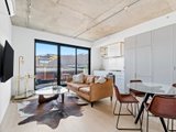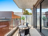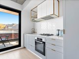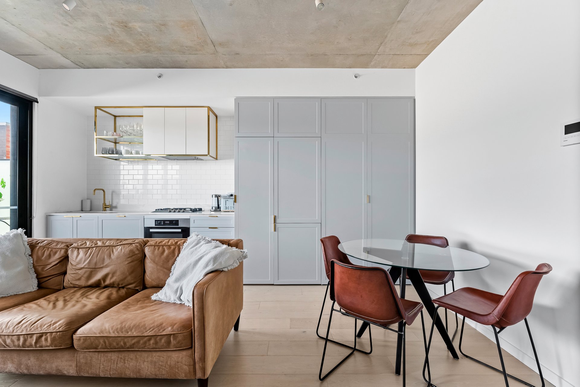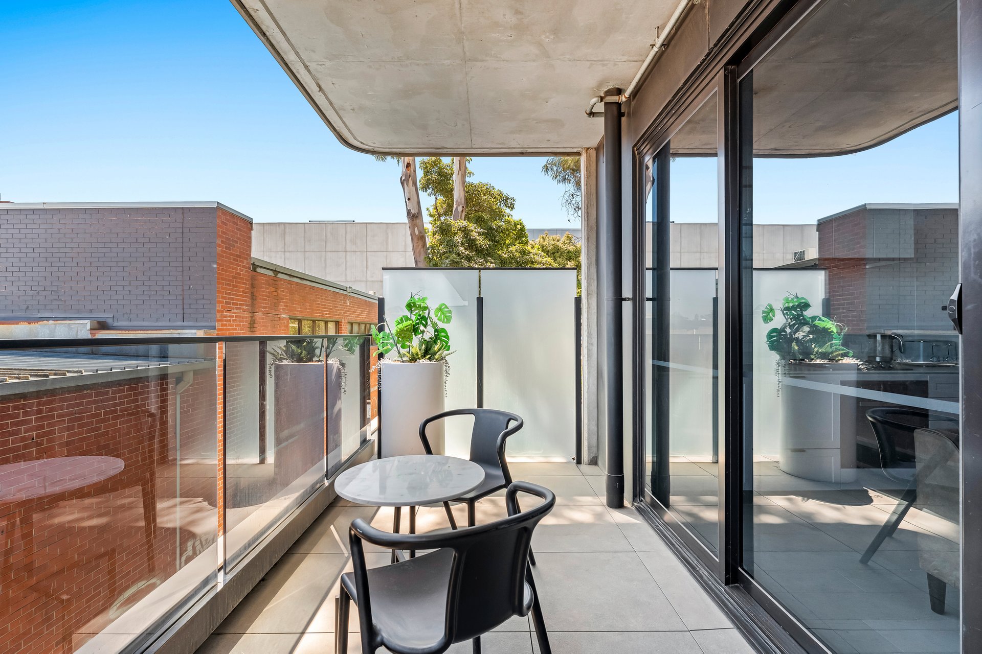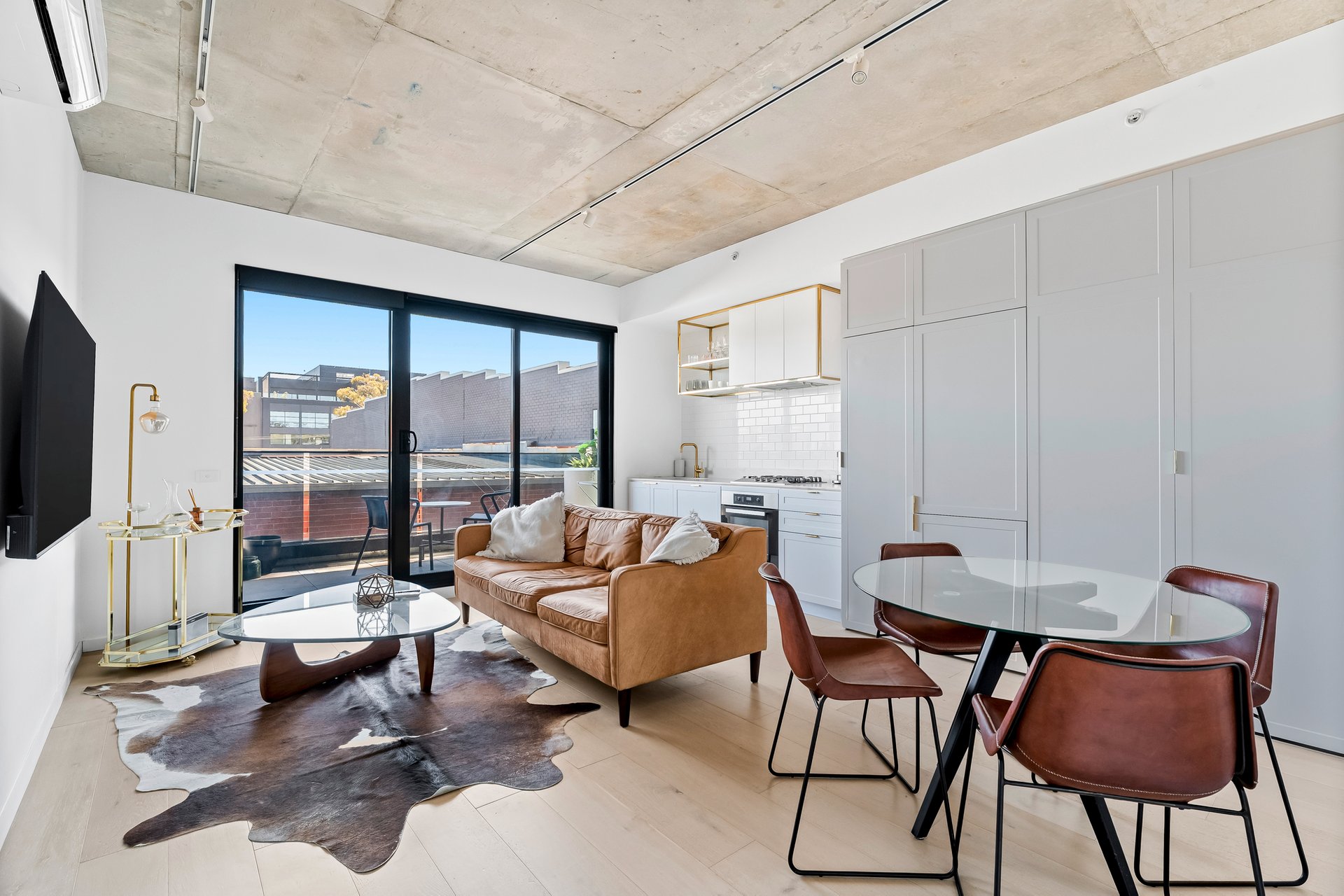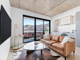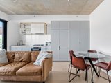 Inside, the home feels immediately spacious and refined, highlighted by exposed concrete ceilings and generous ceiling heights that enhance the sense of light and openness. The open-plan living and dining area features timber flooring, split system heating and cooling, and sliding doors that extend the space onto a private balcony, perfect for relaxed everyday living.