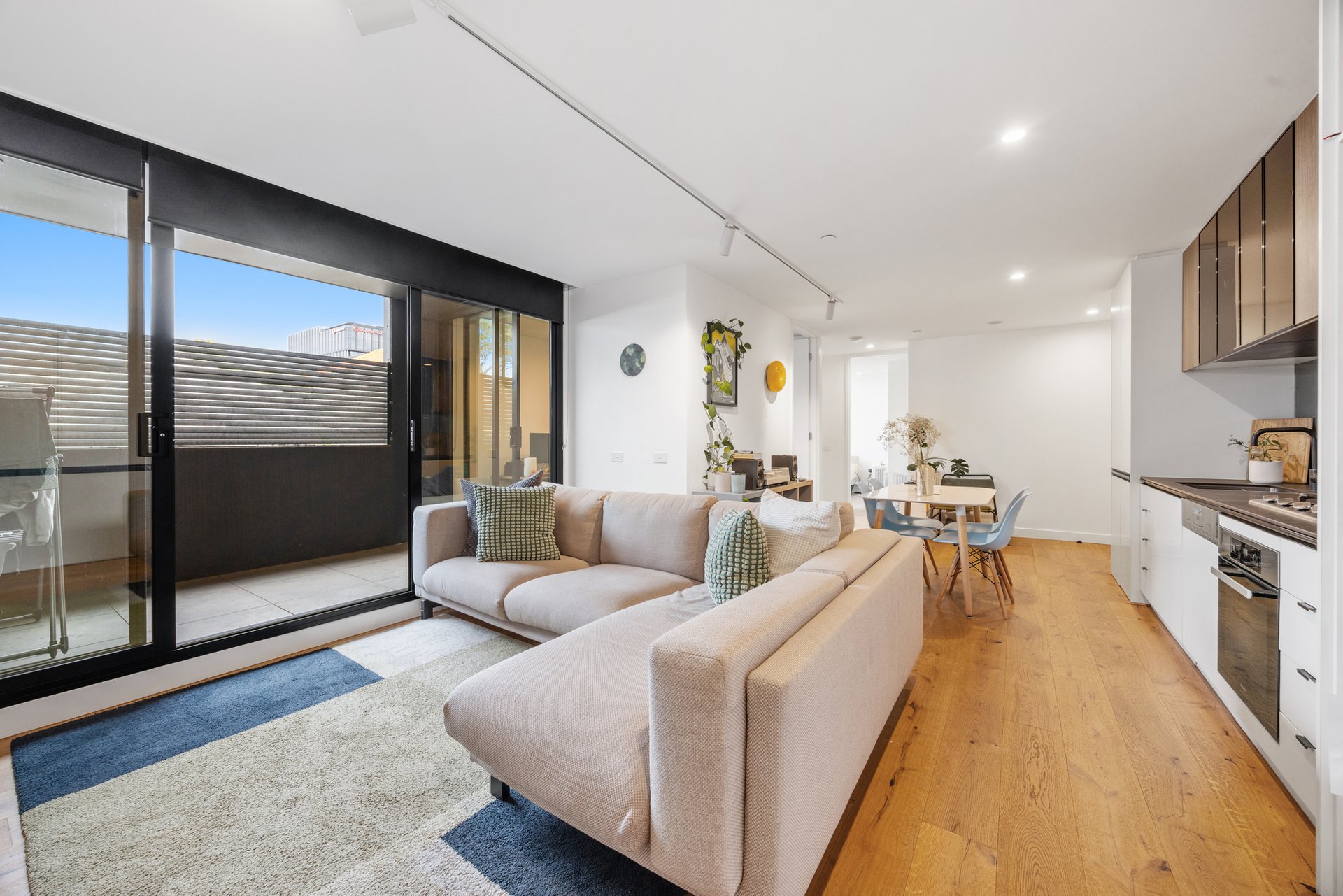 Step inside to discover spacious bedrooms with built-in robes, including a centralised bathroom showcasing floor-to-ceiling tiles and sleek contemporary fixtures. The open-plan kitchen, dining, and living area is the heart of the home, enhanced by timber floorboards and filled with natural light. Flowing seamlessly to a private balcony, it provides the perfect setting for entertaining or relaxing.