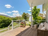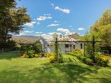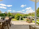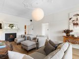 Welcoming and spacious, the main residence opens through French doors to a living area framing picture-perfect Mount Macedon views and featuring wide-plank flooring, an Art Deco-style ceiling rose, picture rails, a feature fireplace, and mantle.