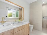 Accommodation consists of three bedrooms, with the master bedroom showcasing expansive windows with mountain views, a walk-in robe, and a tastefully updated ensuite featuring classic tapware, a twin stone vanity, 60cm large-format tiles, a walk-in niched shower, and heated towel rail. Thoughtfully updated, the central bathroom matches the same luxurious theme, and includes a stone vanity, a frameless glass shower-over-bath, and Mediterranean-style floor tiles. The home also includes air-conditioning and ceiling fans.