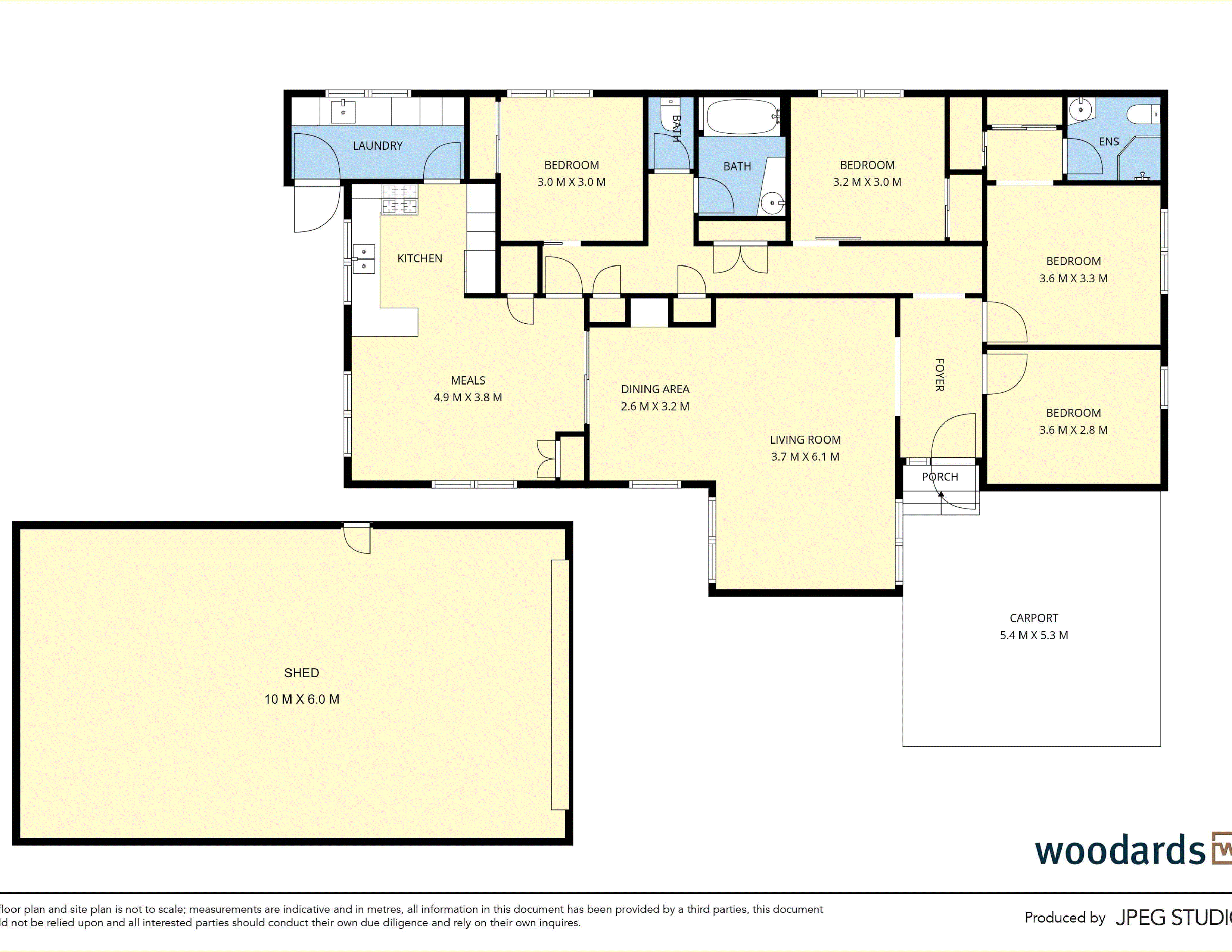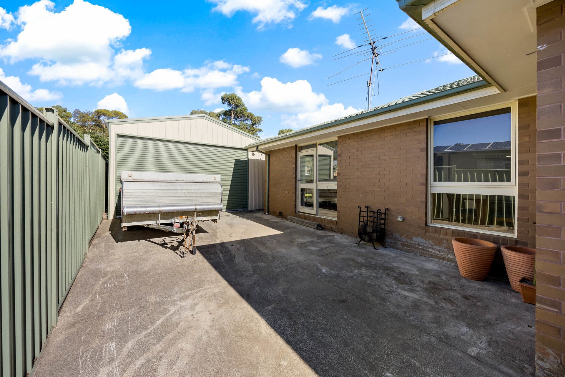 A carport with gated side access leads to a substantial 6m x 10m powered shed/garage featuring a 6m x 3m mezzanine within for storage, complemented by a garden shed and a range of inclusions that enhance everyday comfort including ducted vacuum, ducted heating, evaporative cooling, and a 6kW solar panel array.