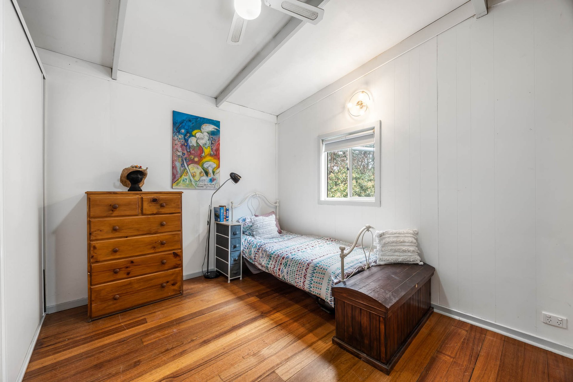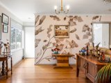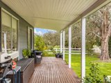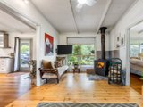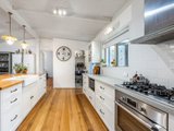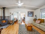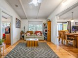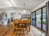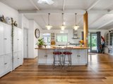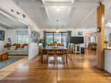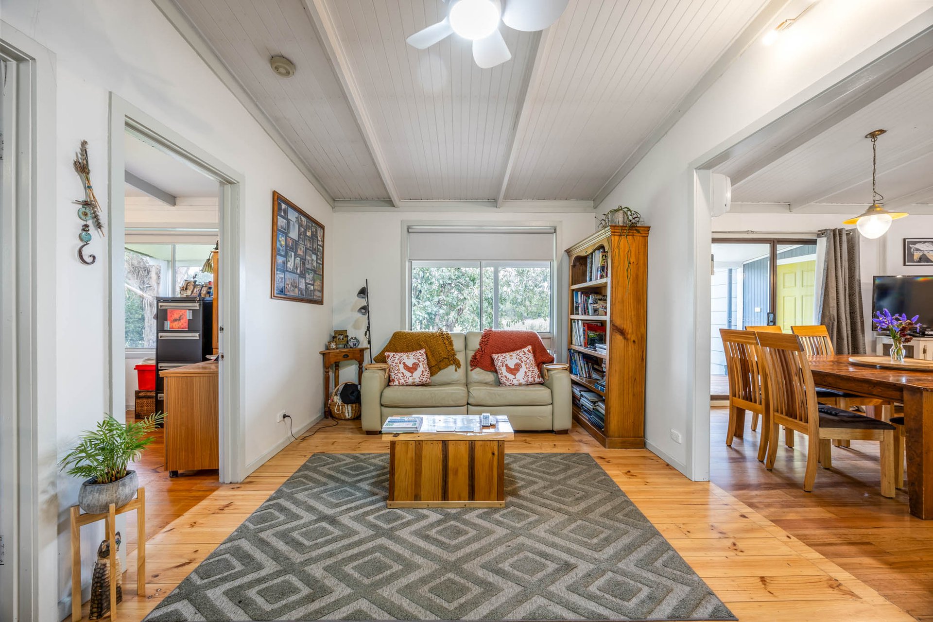 A gently raked ceiling with exposed beams heightens volume and light, with dining and living areas offering excellent space for gatherings, and effortless flow through glass sliders to the rear veranda. A lounge with Coonara wood heater adds winter comfort, while a 2nd lounge-styled with Grafico floral wallpaper and vertical-joinery feature walls-extends the home's relaxed, refined mood.