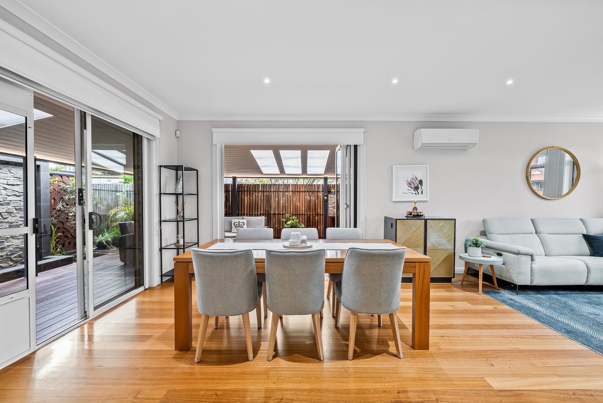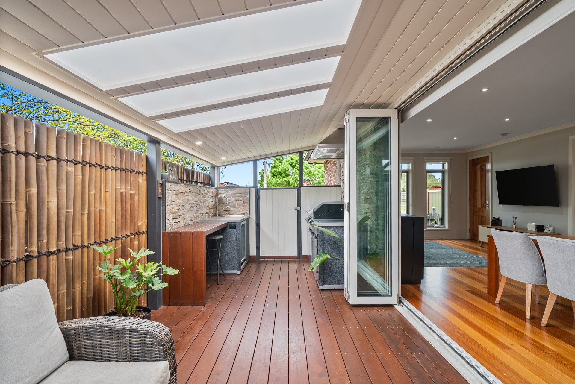The open-plan dining and living room is enhanced by timber flooring, large tinted double-glazed windows, and a seamless connection to the outdoors. Bifold doors extend the interior to a newly installed entertainer’s deck complete with an outdoor kitchen, BBQ, bar, LED lighting, and a waterfall fountain, complemented by a garden pocket for added greenery. A covered alfresco ensures year-round enjoyment.