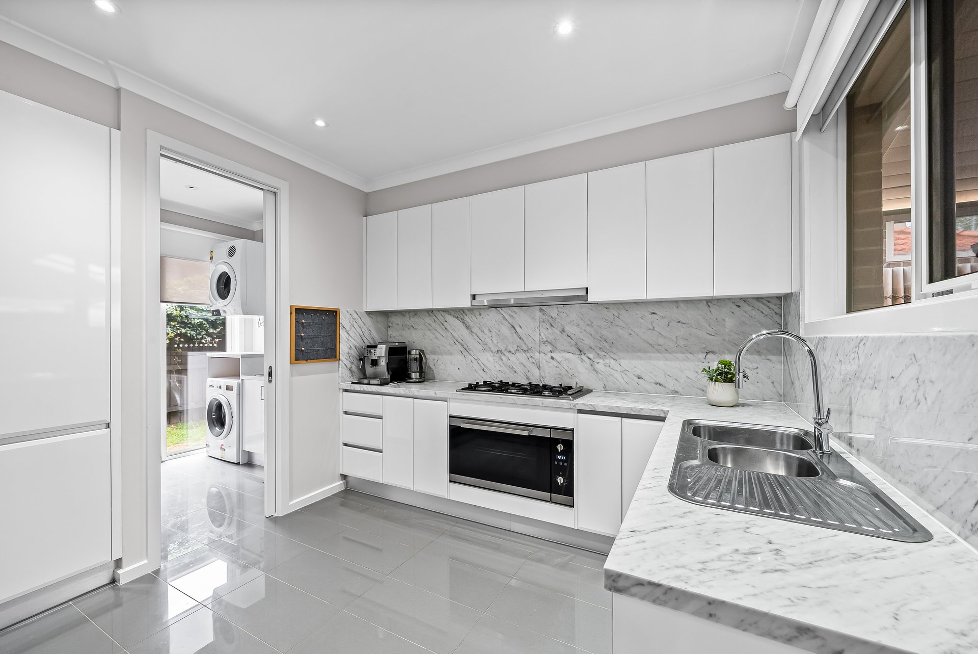 The kitchen is well appointed with an Omega stove and oven, stone benchtops, double sink, Asko dishwasher, and direct access to the laundry. The laundry also connects through to the single garage, which includes attic ladder storage and an external clothesline area. An additional water closet is neatly positioned within the living zone.