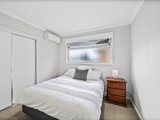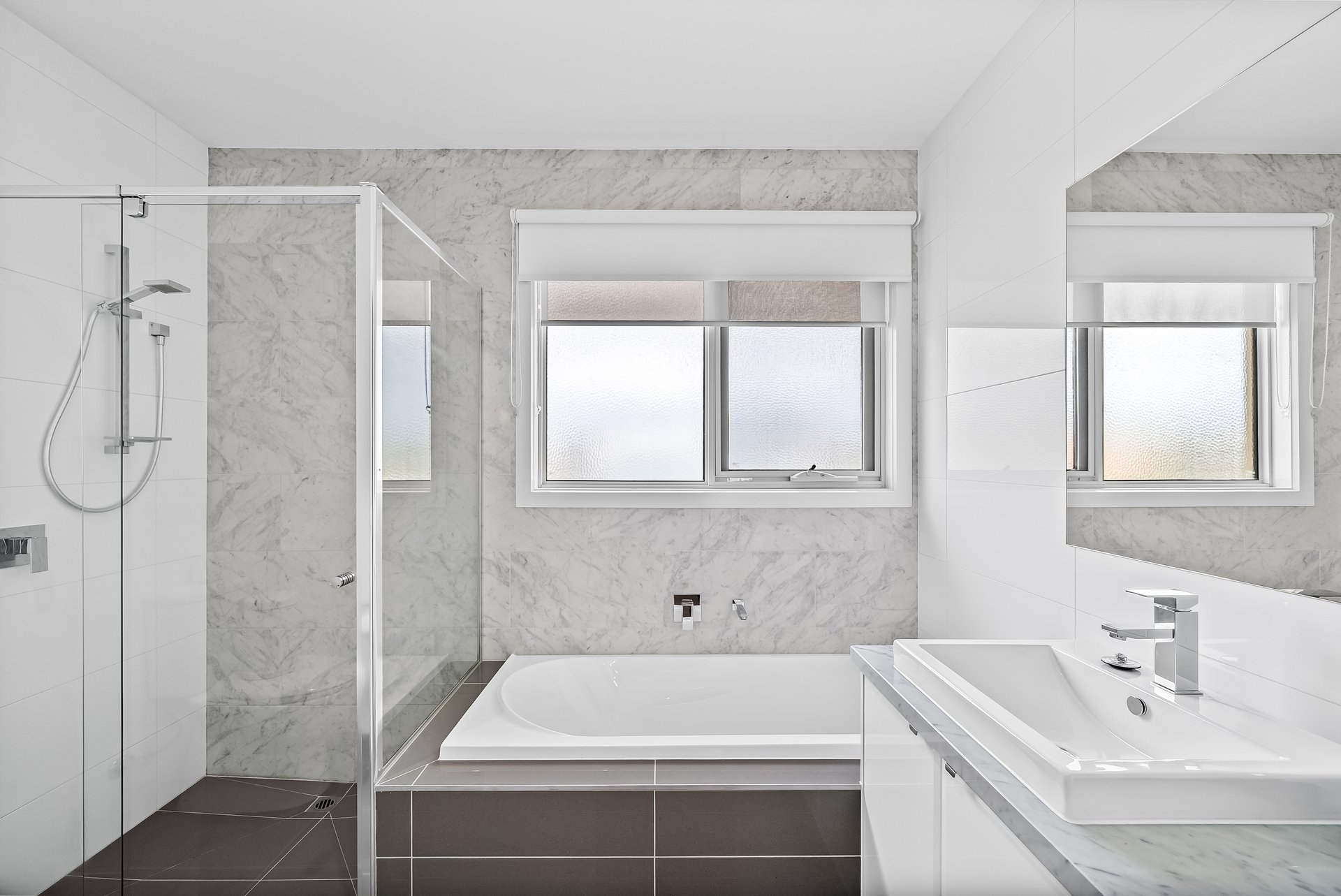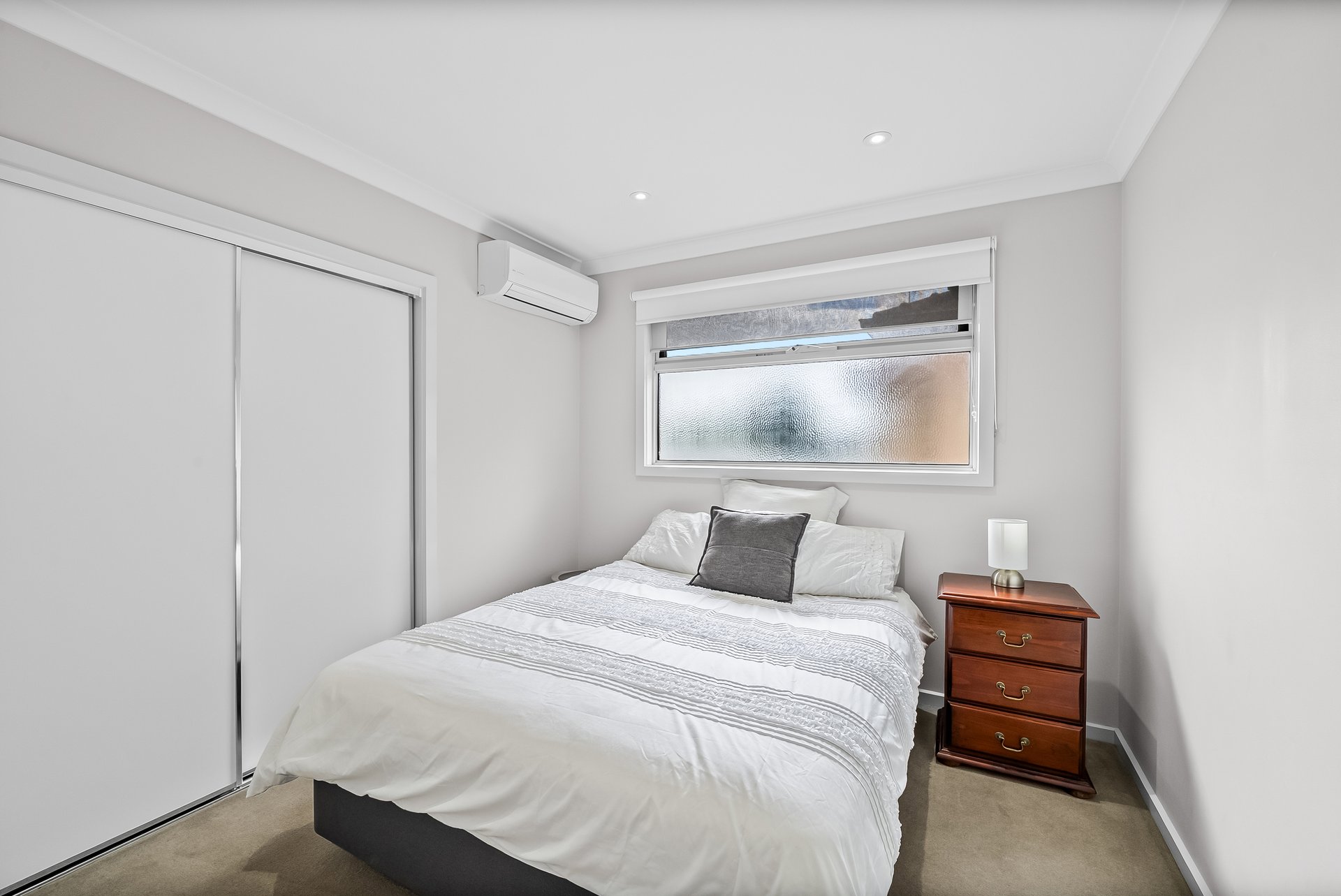 Accommodation includes four bedrooms, three upstairs with carpet and one on the ground floor with timber flooring. The main bedroom features a walk-in wardrobe and ensuite with a rain shower. Bathrooms are finished with stone benchtops, while a total of two and a half bathrooms service the home. Additional features include split-system reverse cycle air conditioning in every room, Dorani intercom on both levels, under-stair storage, security cameras, a rainwater tank (2030), and a picket fence completing the façade.