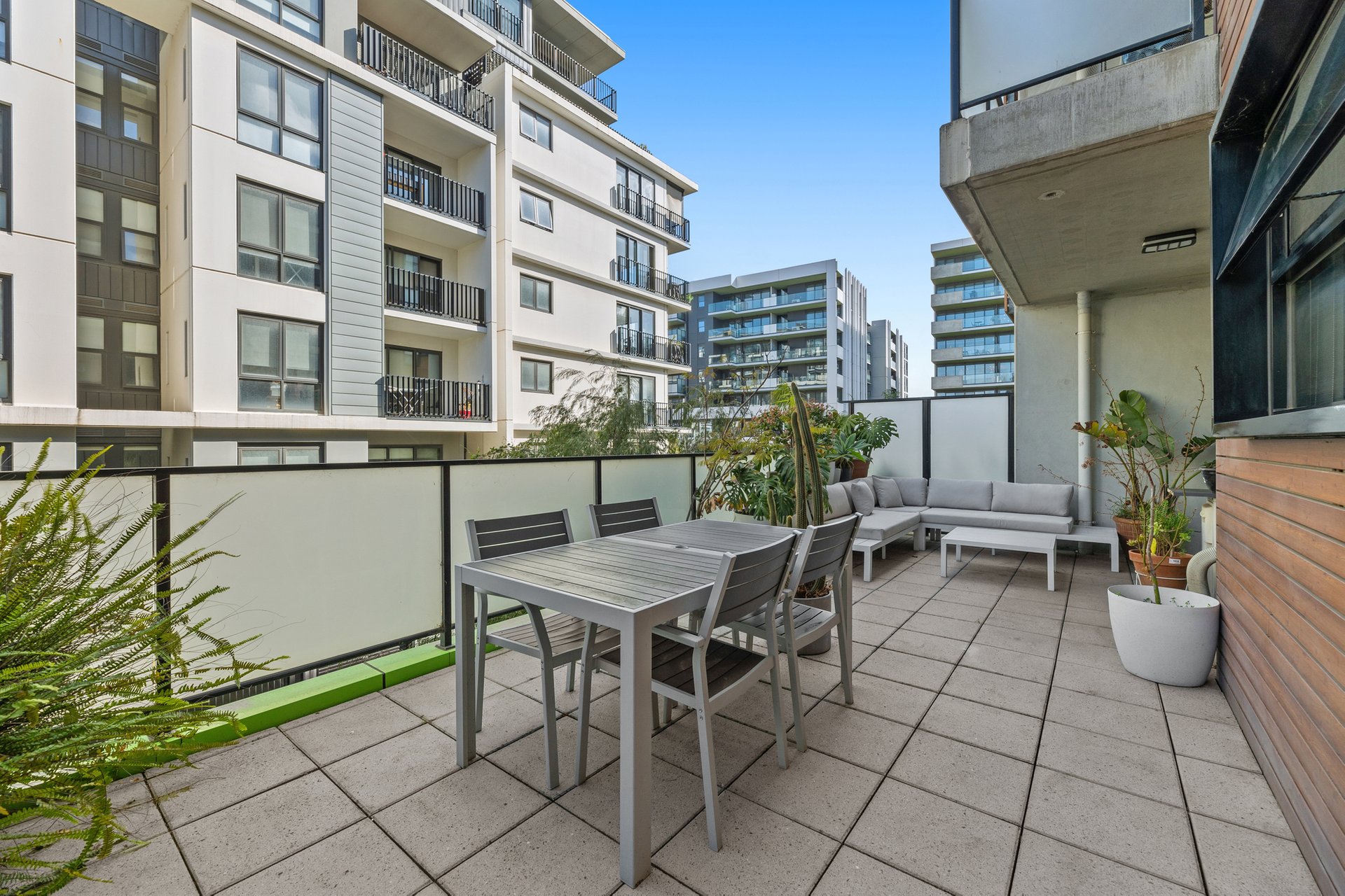 Step inside to a light-filled open-plan living, dining, and kitchen area, where sliding doors connect seamlessly to a large private terrace. Generously sized, the outdoor space easily accommodates a dining table with room to spare - perfect for gatherings or quiet evenings surrounded by greenery.
